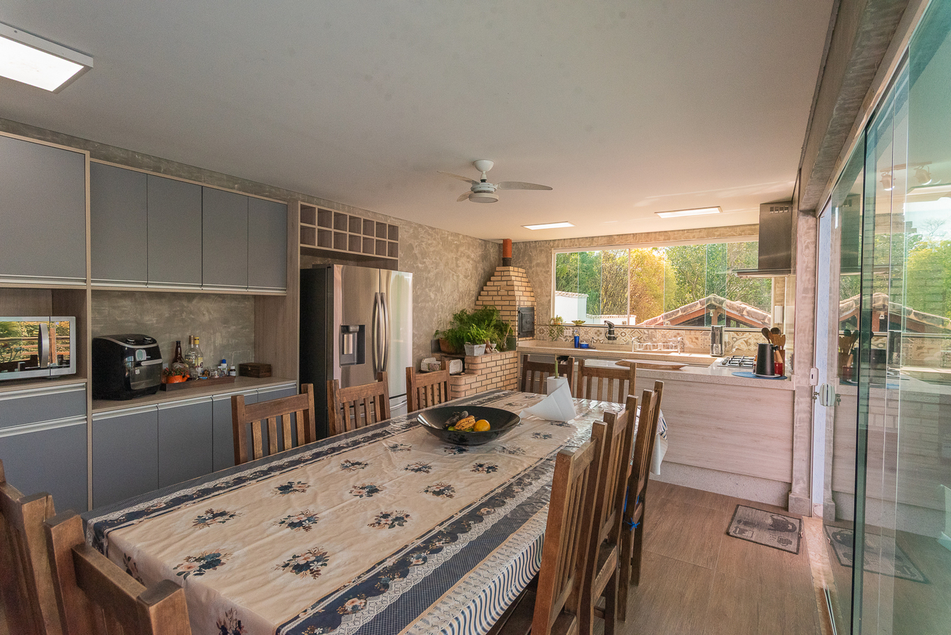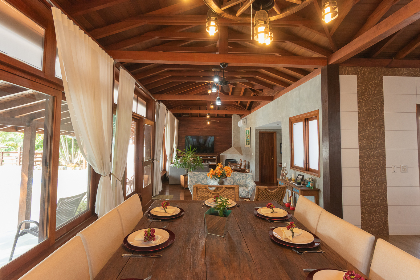 - Sala de estar conjugada com sala de jantar e cozinha. Espaço amplo com lareira, sofás mesa de jantar, Smart TV, ar-condicionado e ventilador de teto