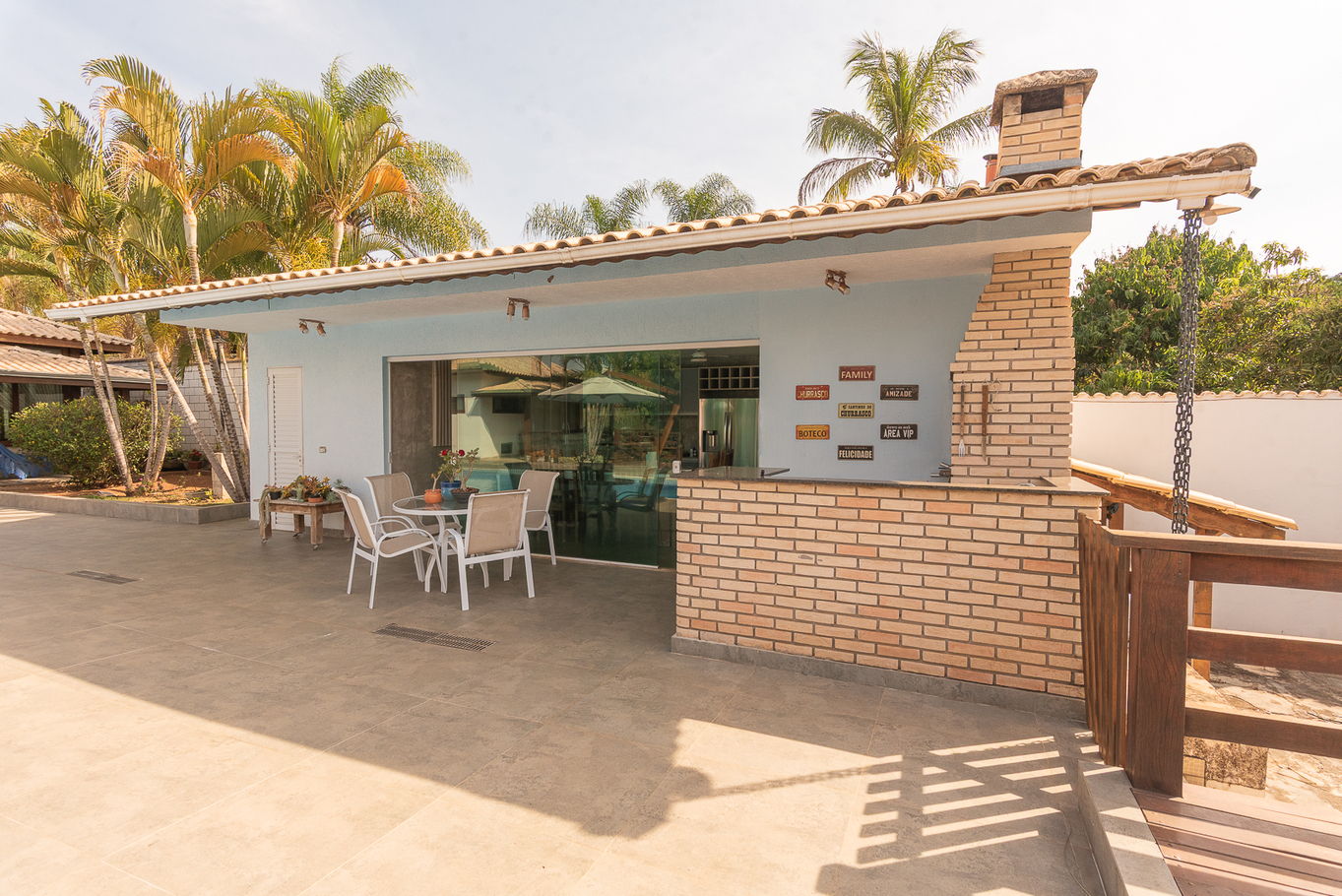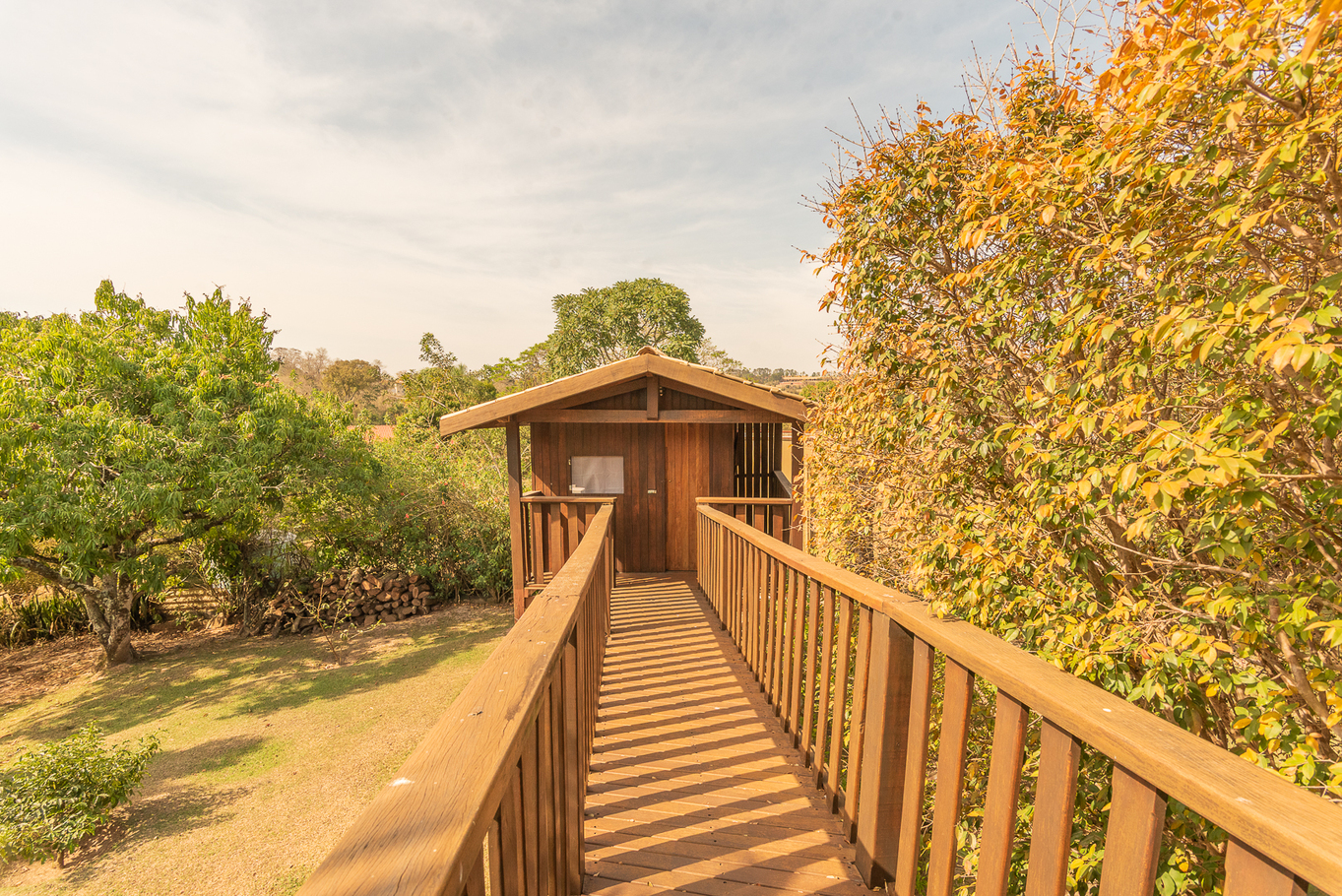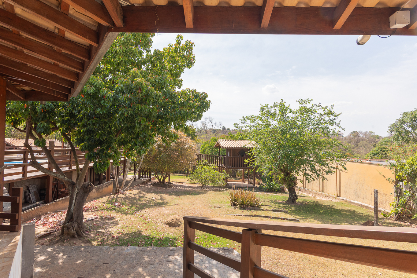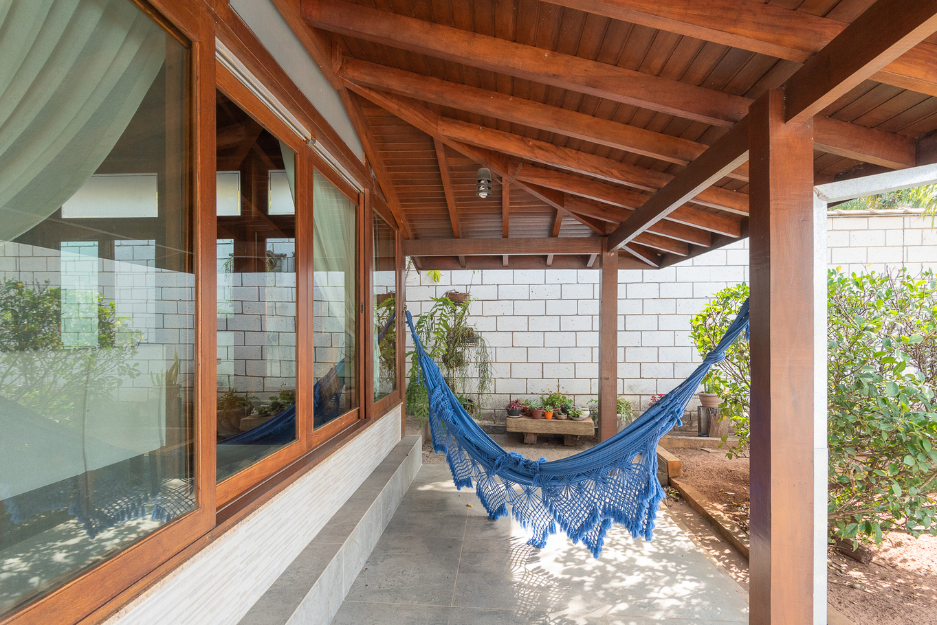 - Área externa com jardim, ducha, terraço coberto e casa na árvore