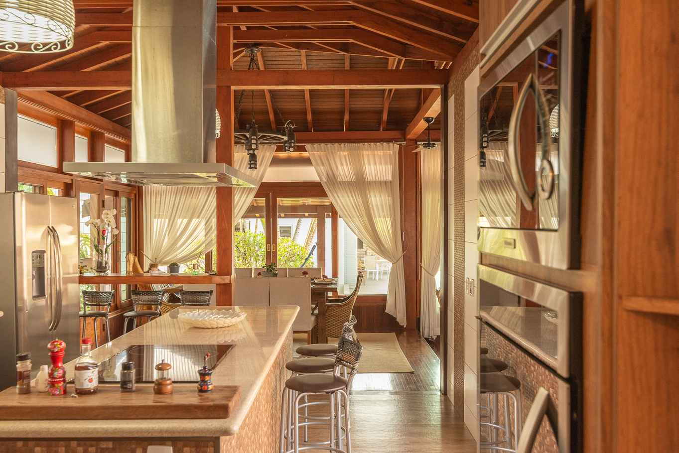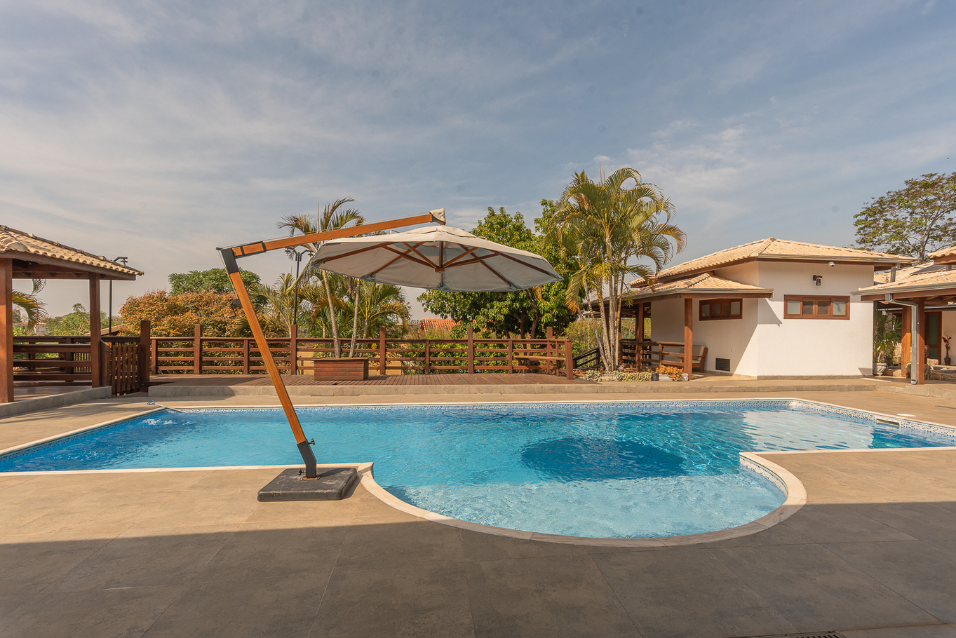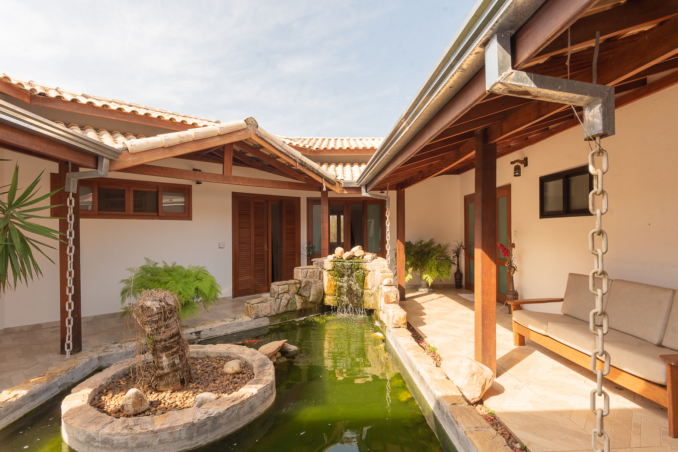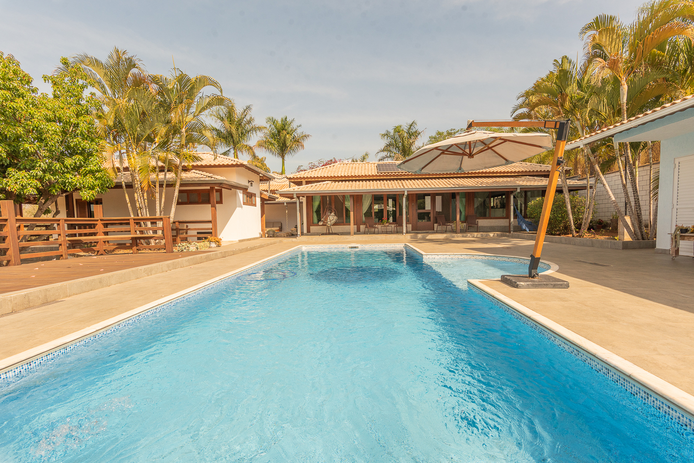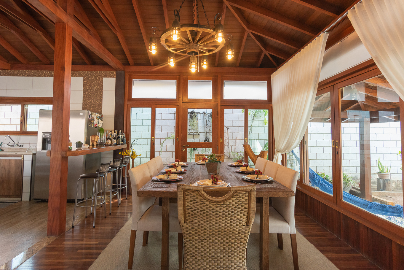 - Área externa com jardim, ducha, terraço coberto e casa na árvore