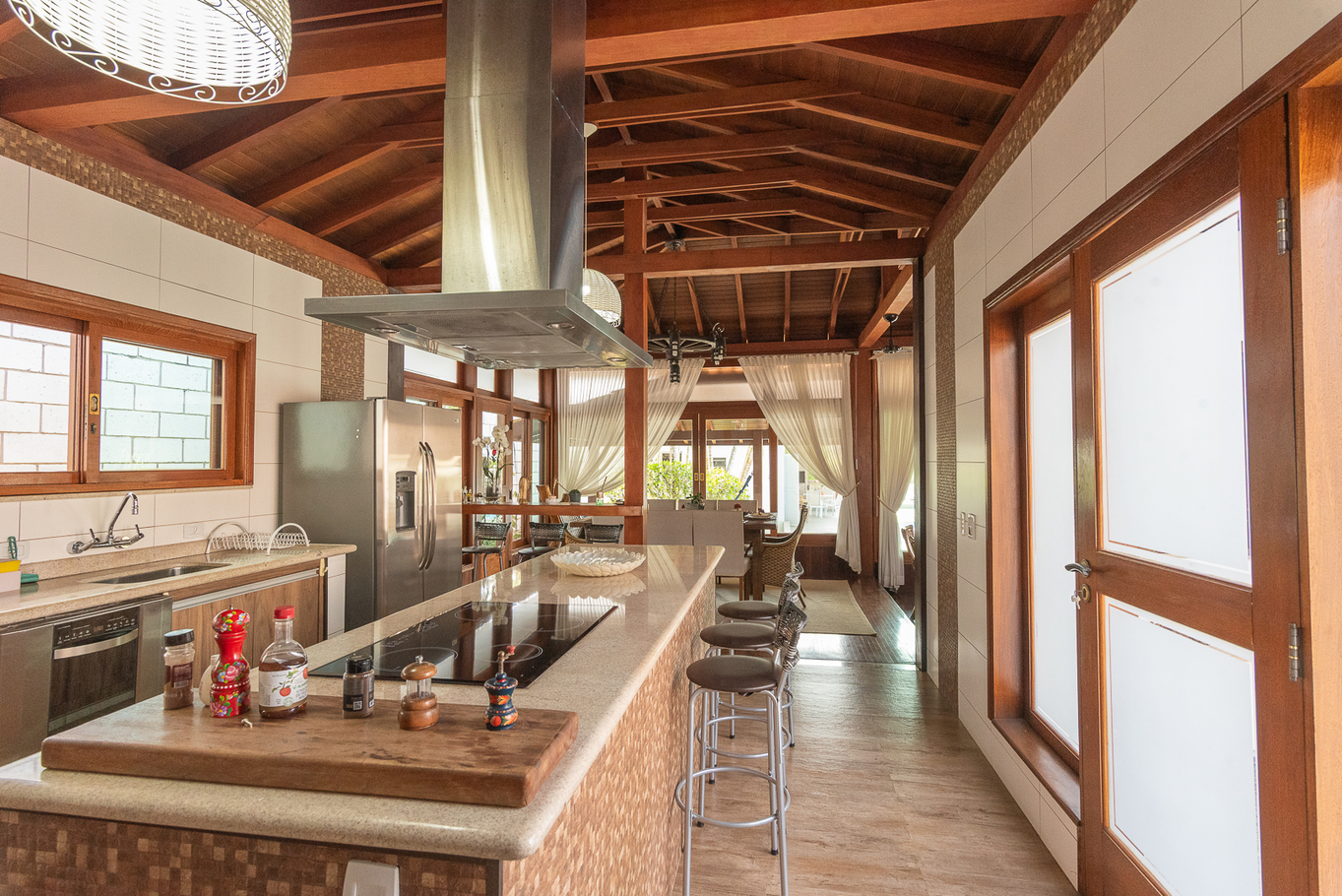 - Cozinha equipada com fogão, geladeira, forno, micro-ondas, lava-louças, balcão para refeições rápidas e utensílios diversos(exceto óleo e sal). Água quente nas torneiras da cozinha.