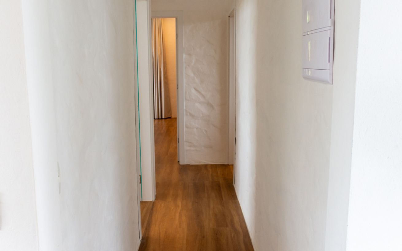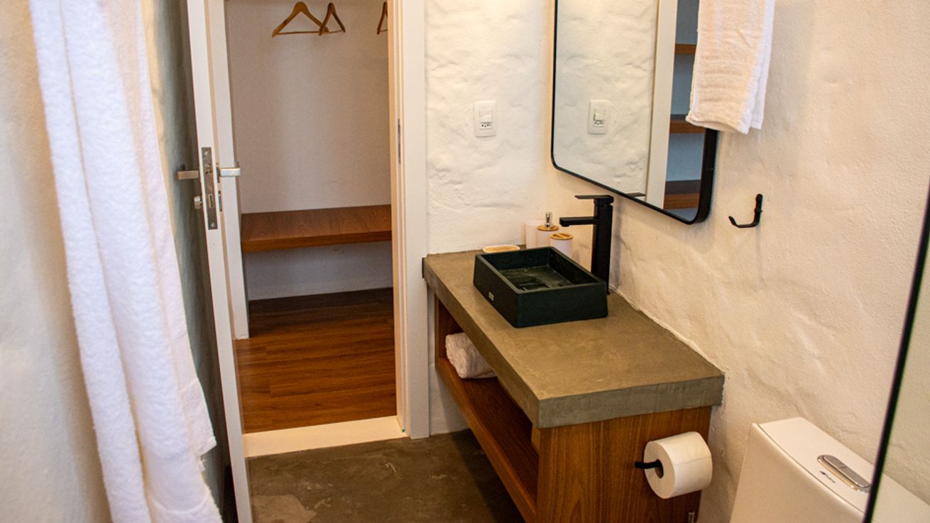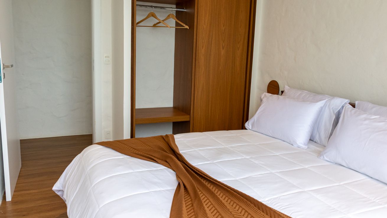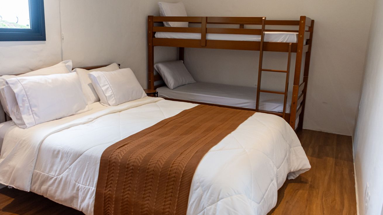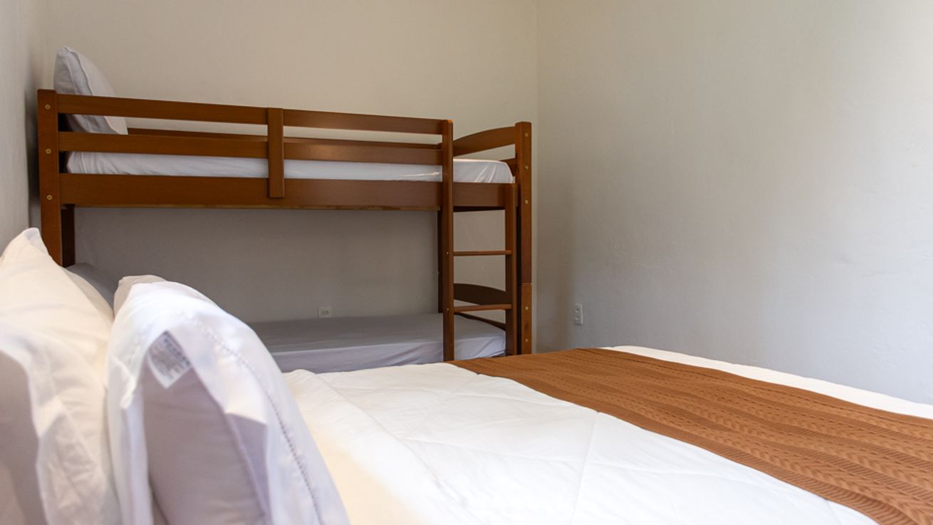 - Quarto 1(suíte): 1 cama queen size, 1 triliche, armário, banheiro privativo com chuveiro, box e secador