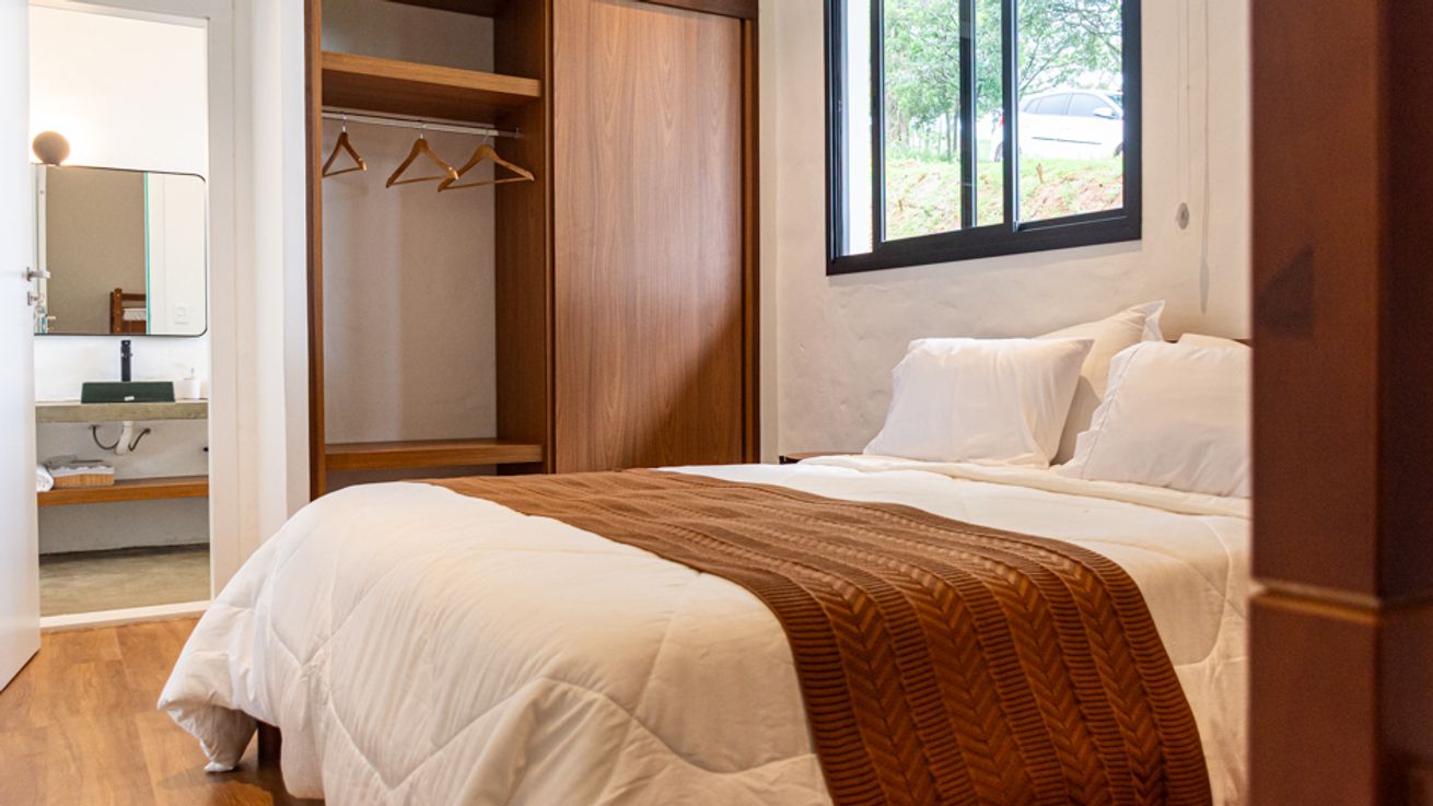 - Quarto 3(suíte): 1 cama king size, armário, banheiro privativo com chuveiro elétrico e box