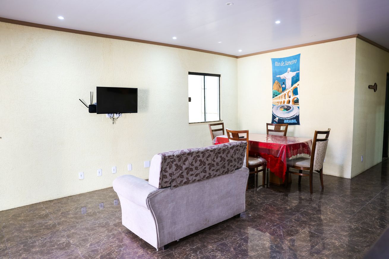 - Sala com sofá, Smart TV e mesa de jantar para 4 pessoas. Ideal para reunir todos após um dia de praia