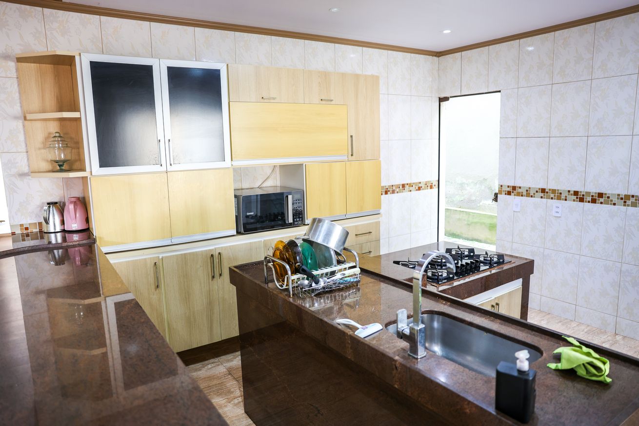 - Cozinha equipada com fogão, geladeira, micro-ondas (220v), balcão, utensílios e itens de cozinha(exceto óleo e sal)