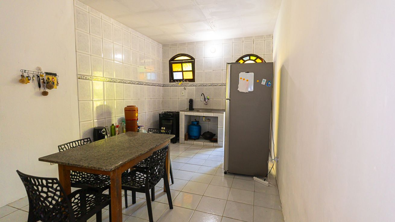 - Cozinha funcional com mesa para 5 pessoas, fogão, forno, geladeira, freezer, fritadeira, liquidificador e utensílios de cozinha(exceto óleo e sal)