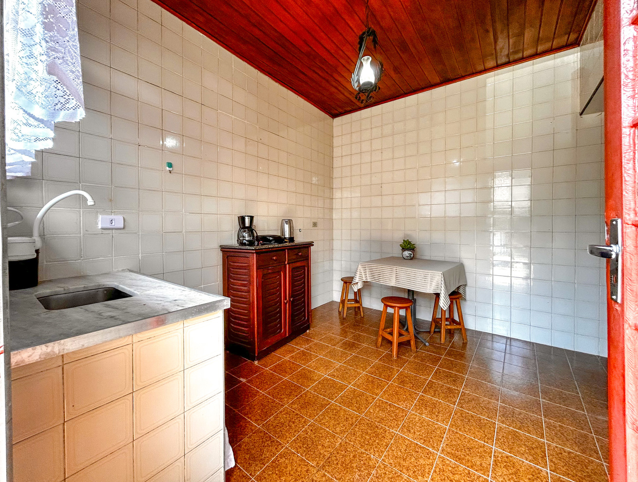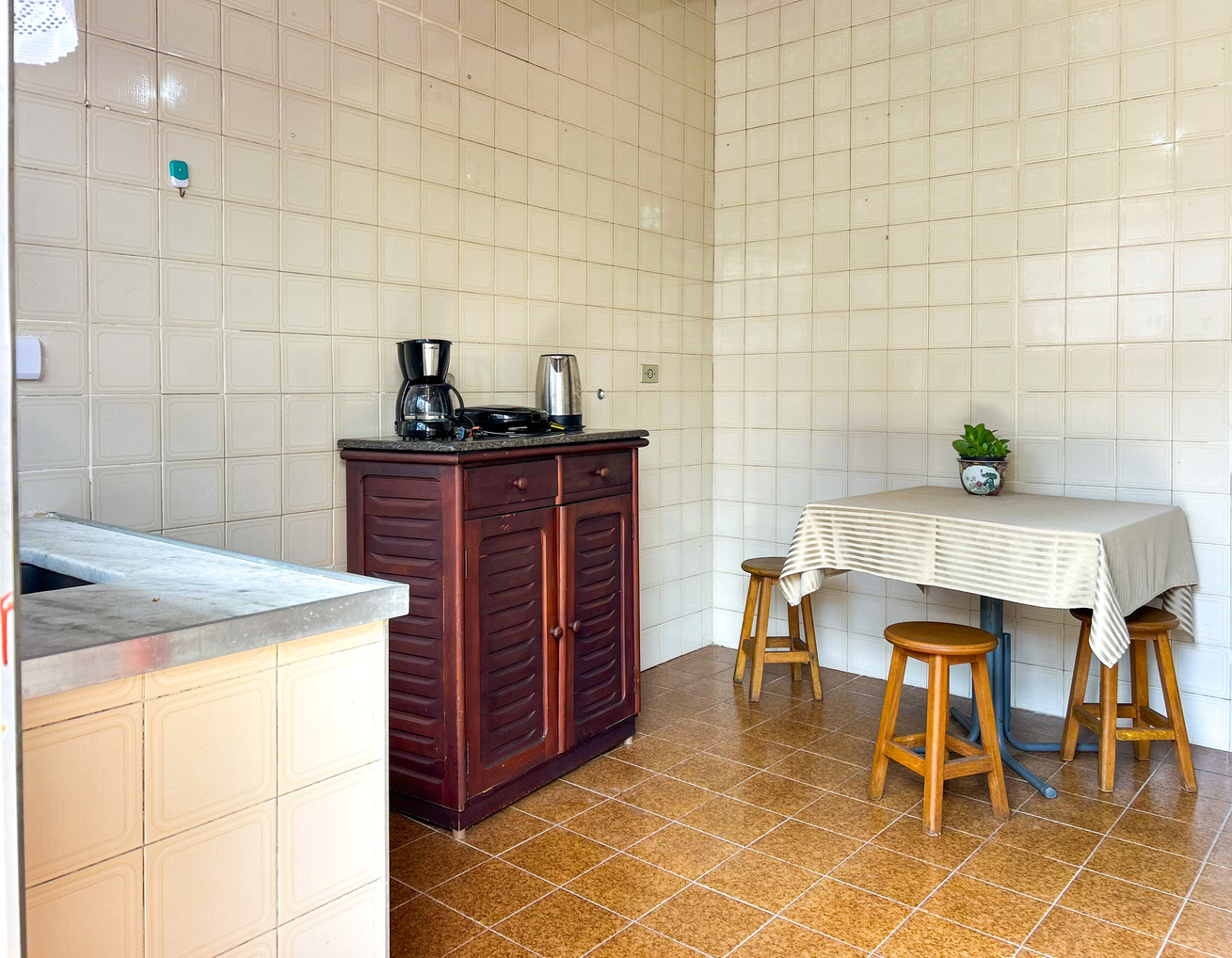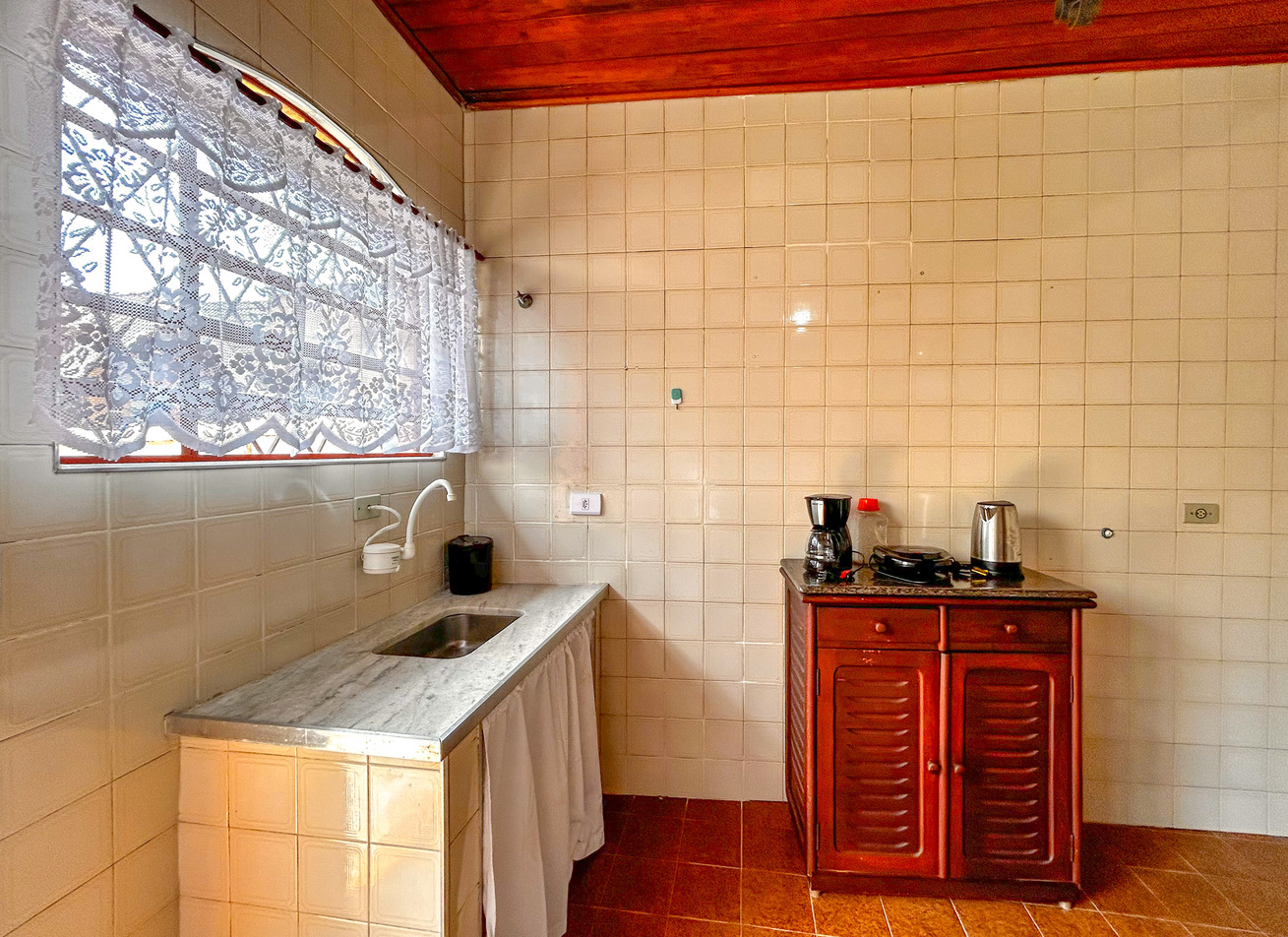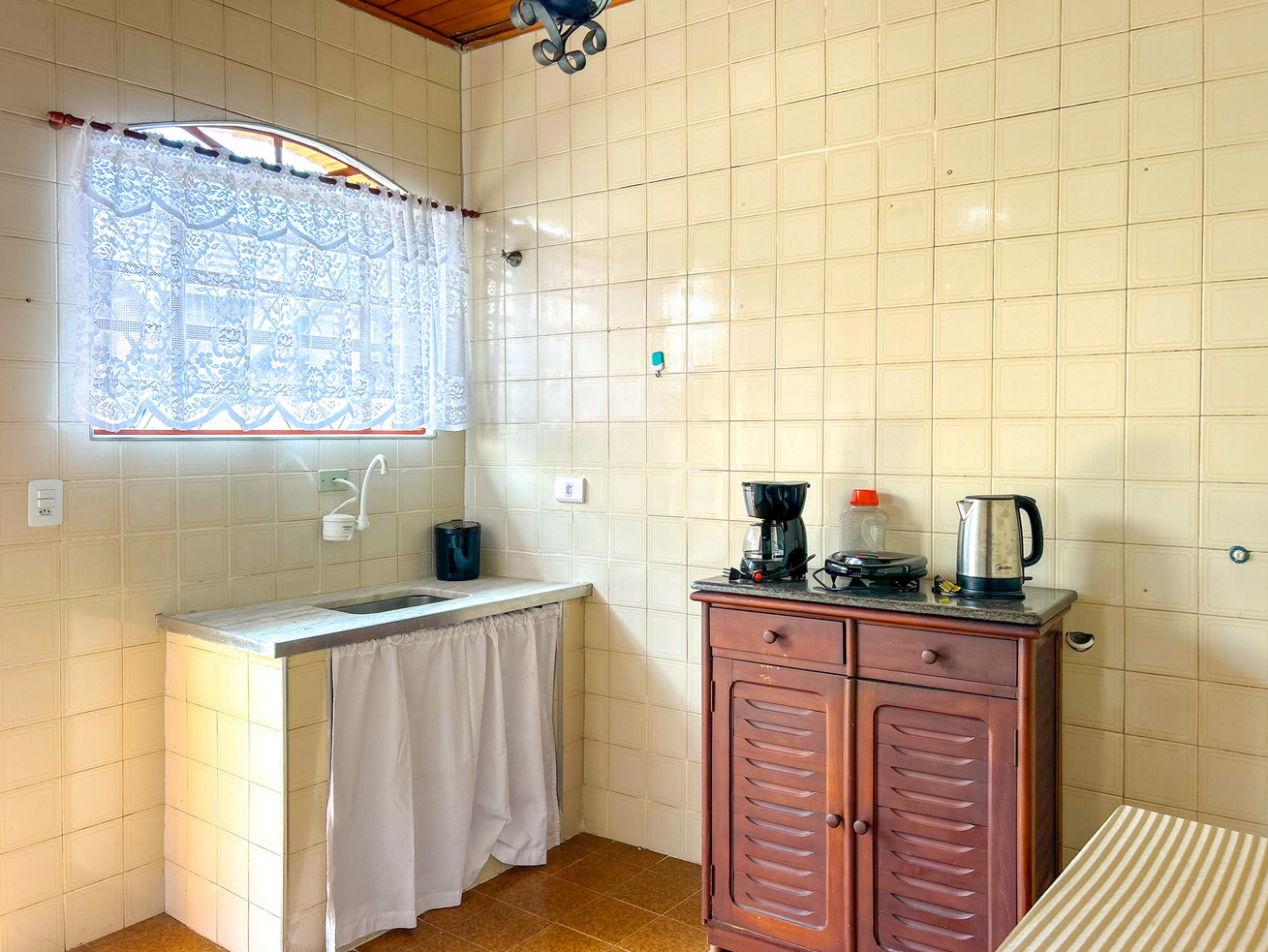 - Cozinha equipada com fogão elétrico, cafeteira e utensílios básicos