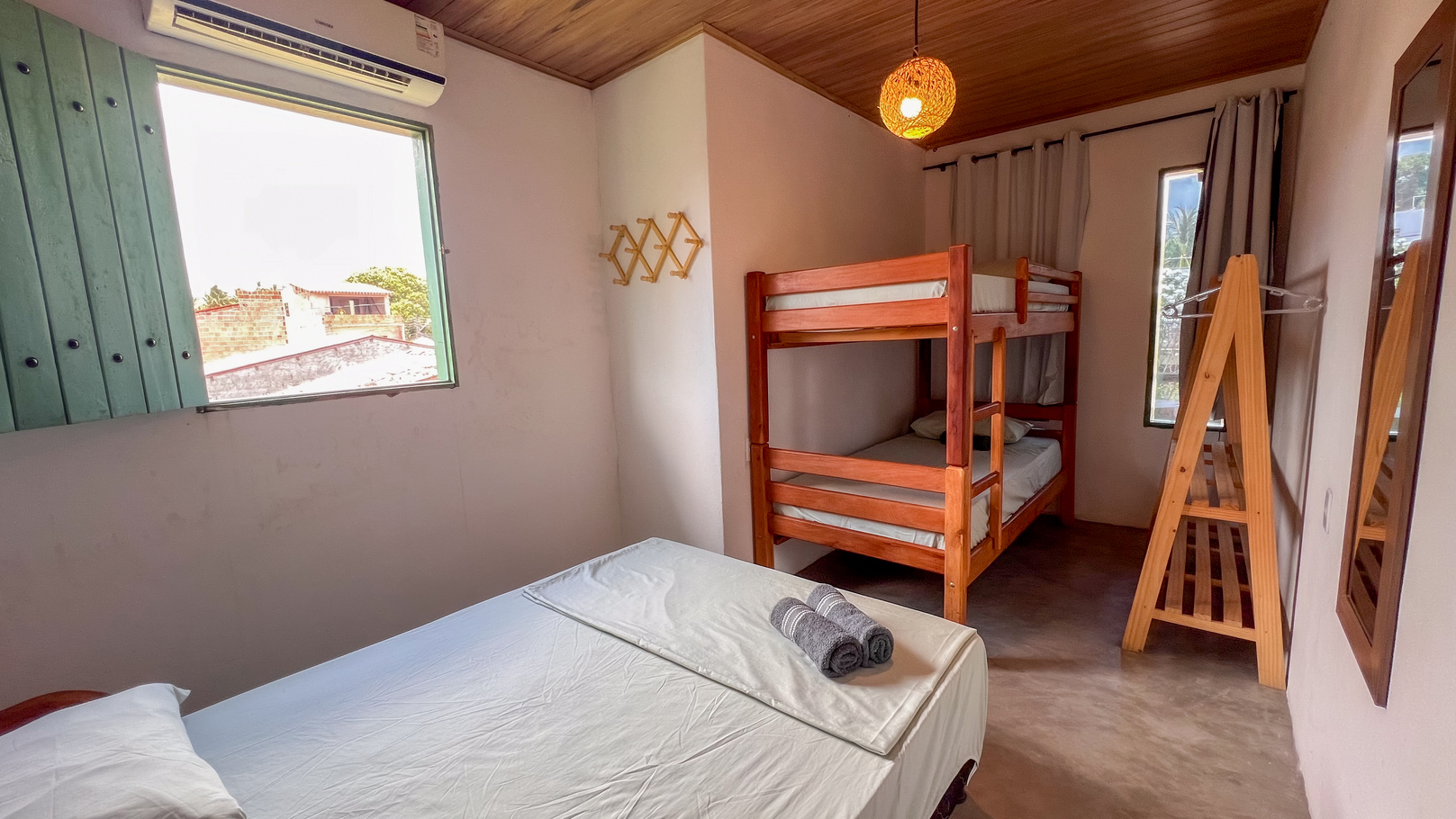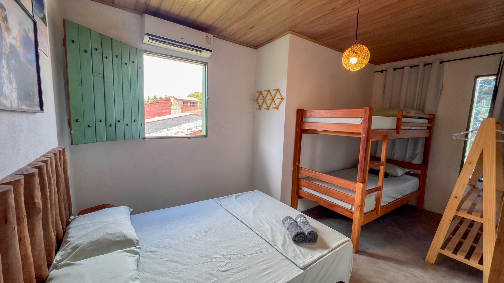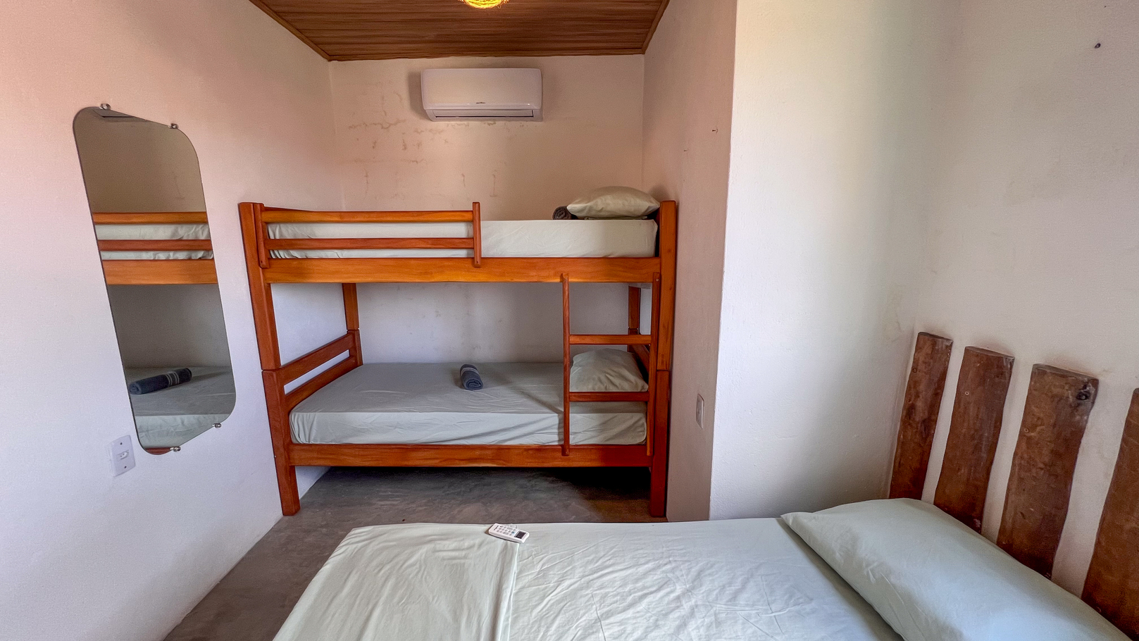 - Quarto 1: 1 cama de casal, 1 beliche, ar condicionado e arara para roupas