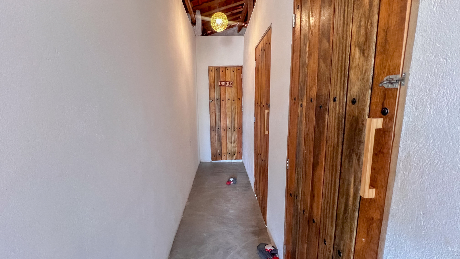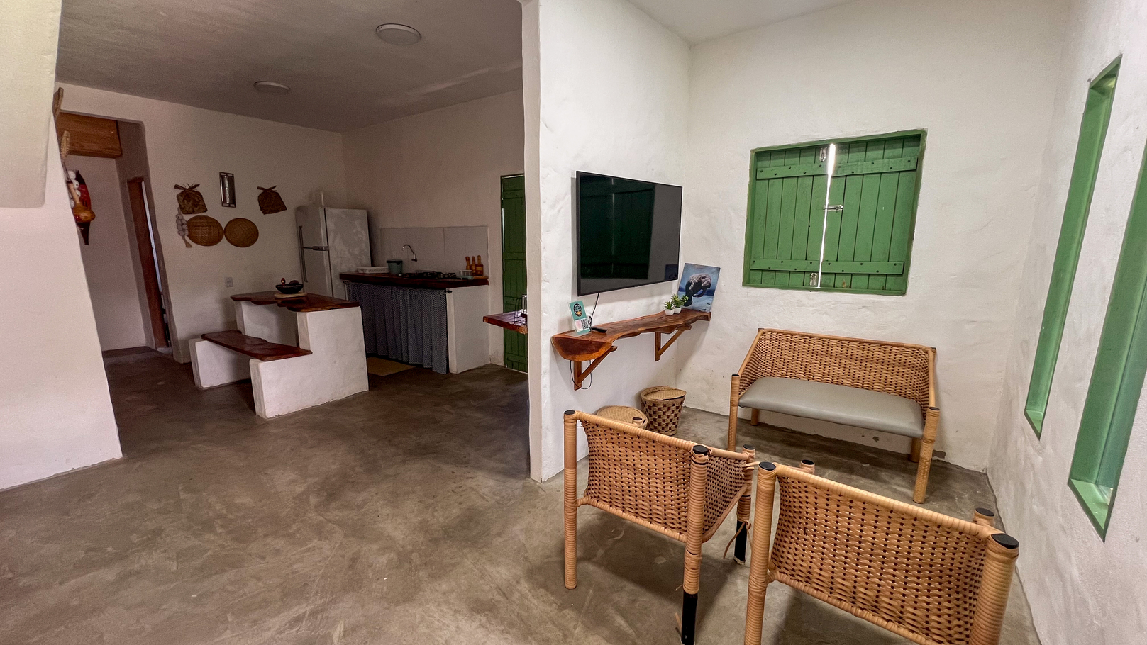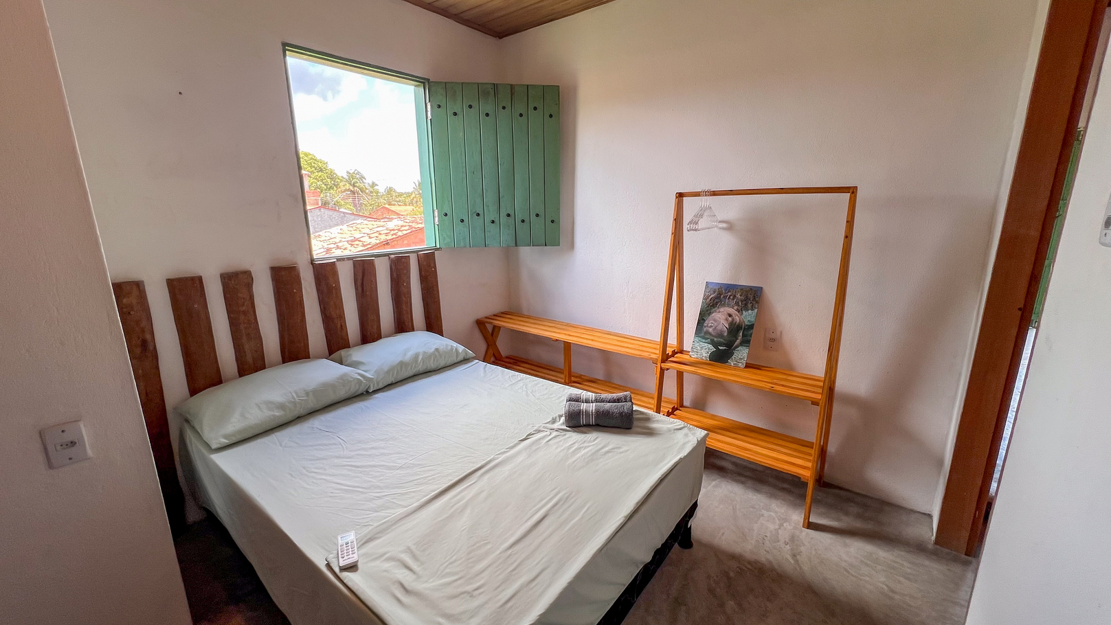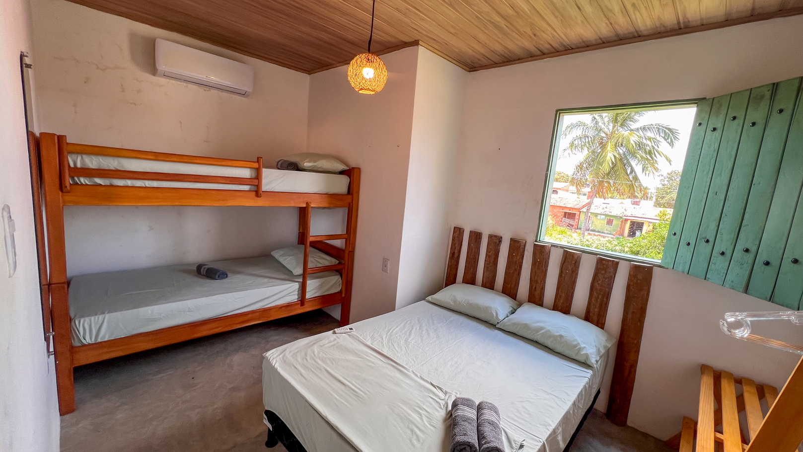 - Quarto 1: 1 cama de casal, 1 beliche, ar condicionado e arara para roupas