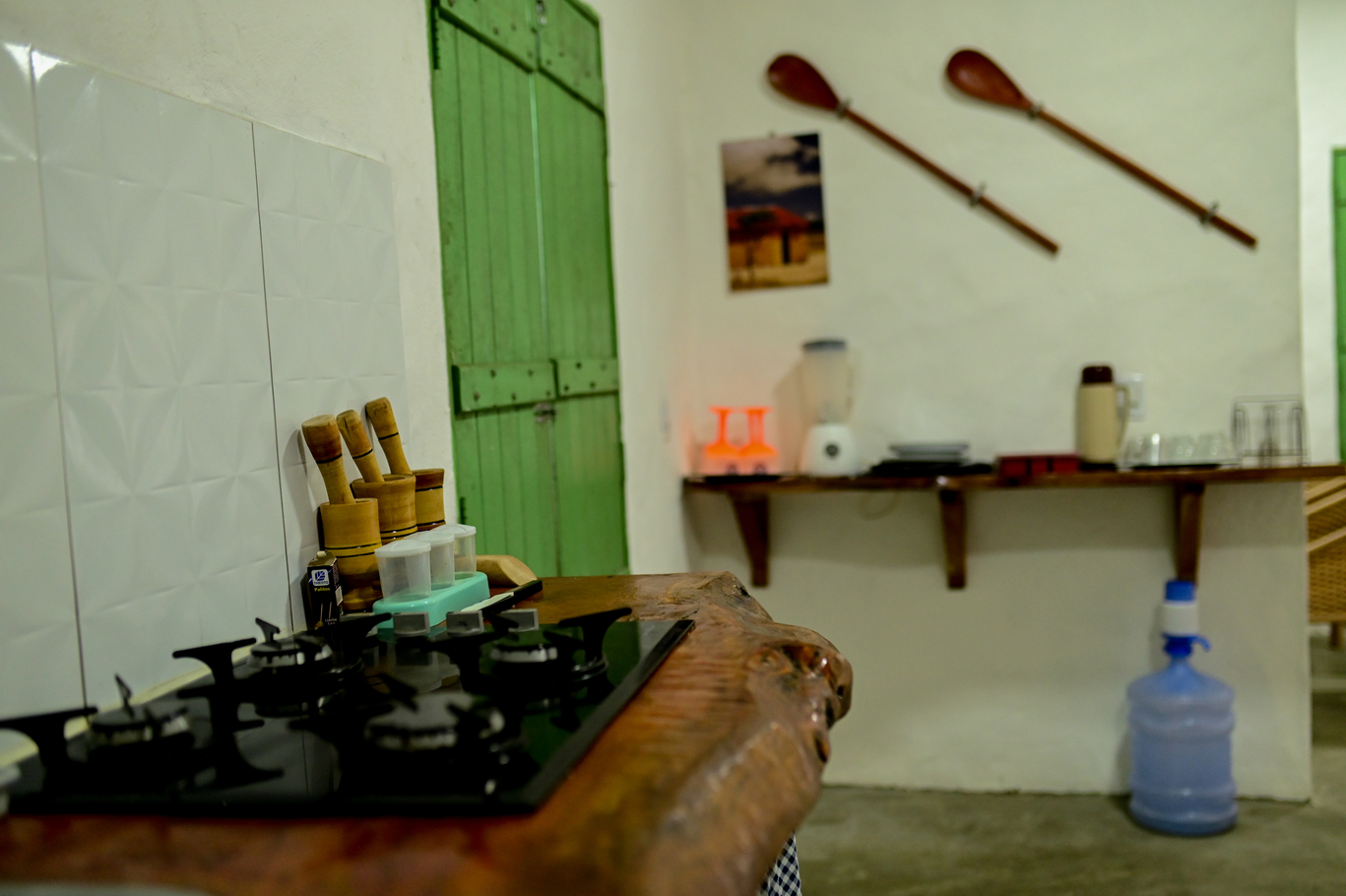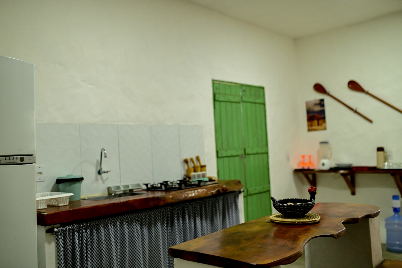 - Cozinha completa com fogão, geladeira, freezer, liquidificador e utensílios básicos (exceto óleo e sal). Possui balcão e mesa para 8 pessoas