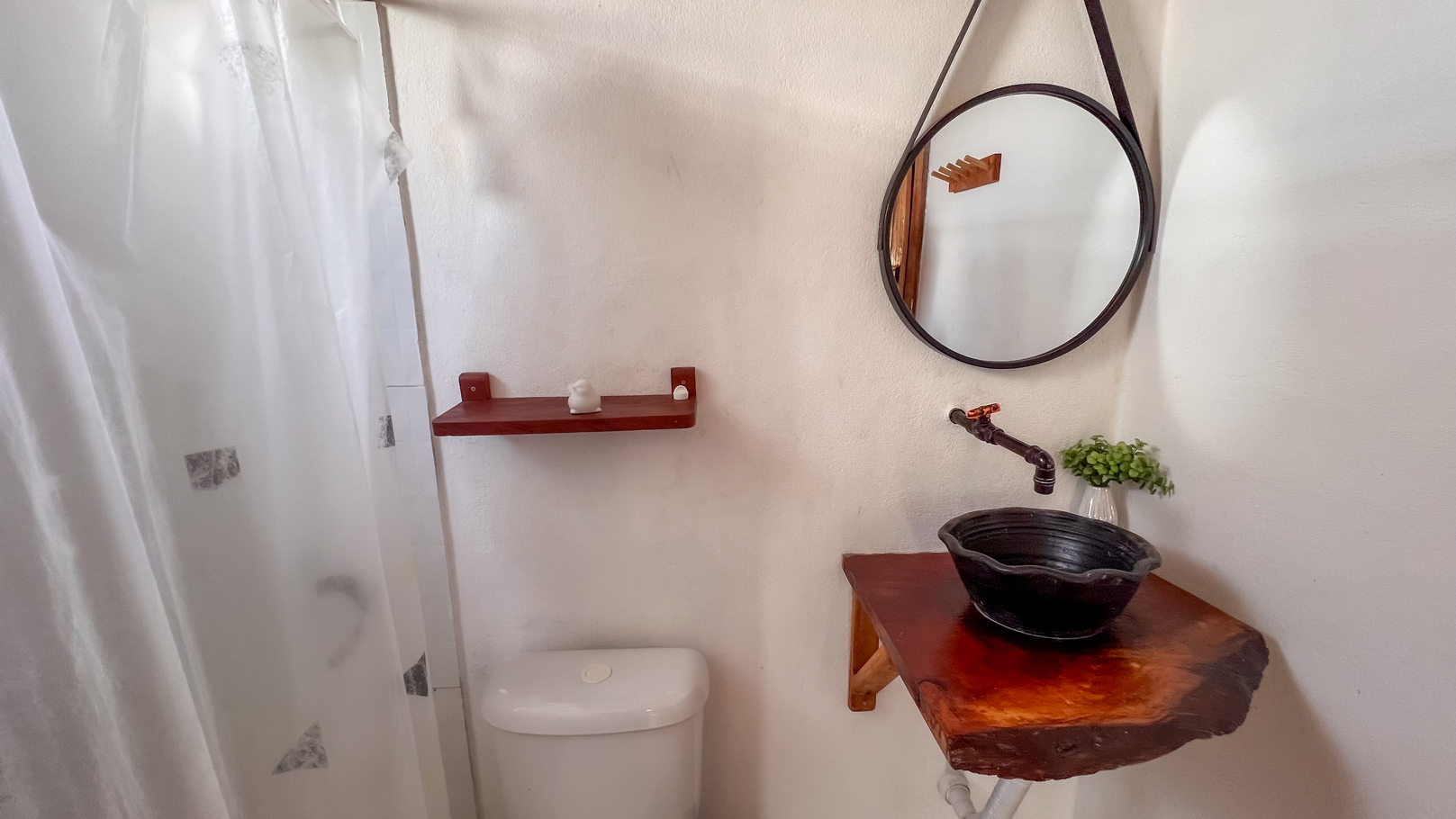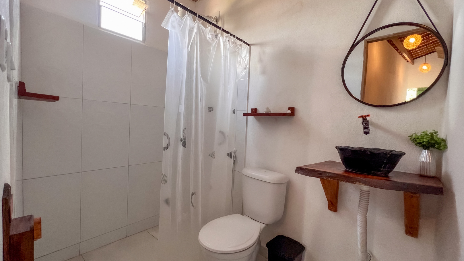- Banheiros (2): 2 banheiros sociais (um no térreo e outro no piso superior), ambos com chuveiro elétrico. O banheiro 2 possui secador de cabelo