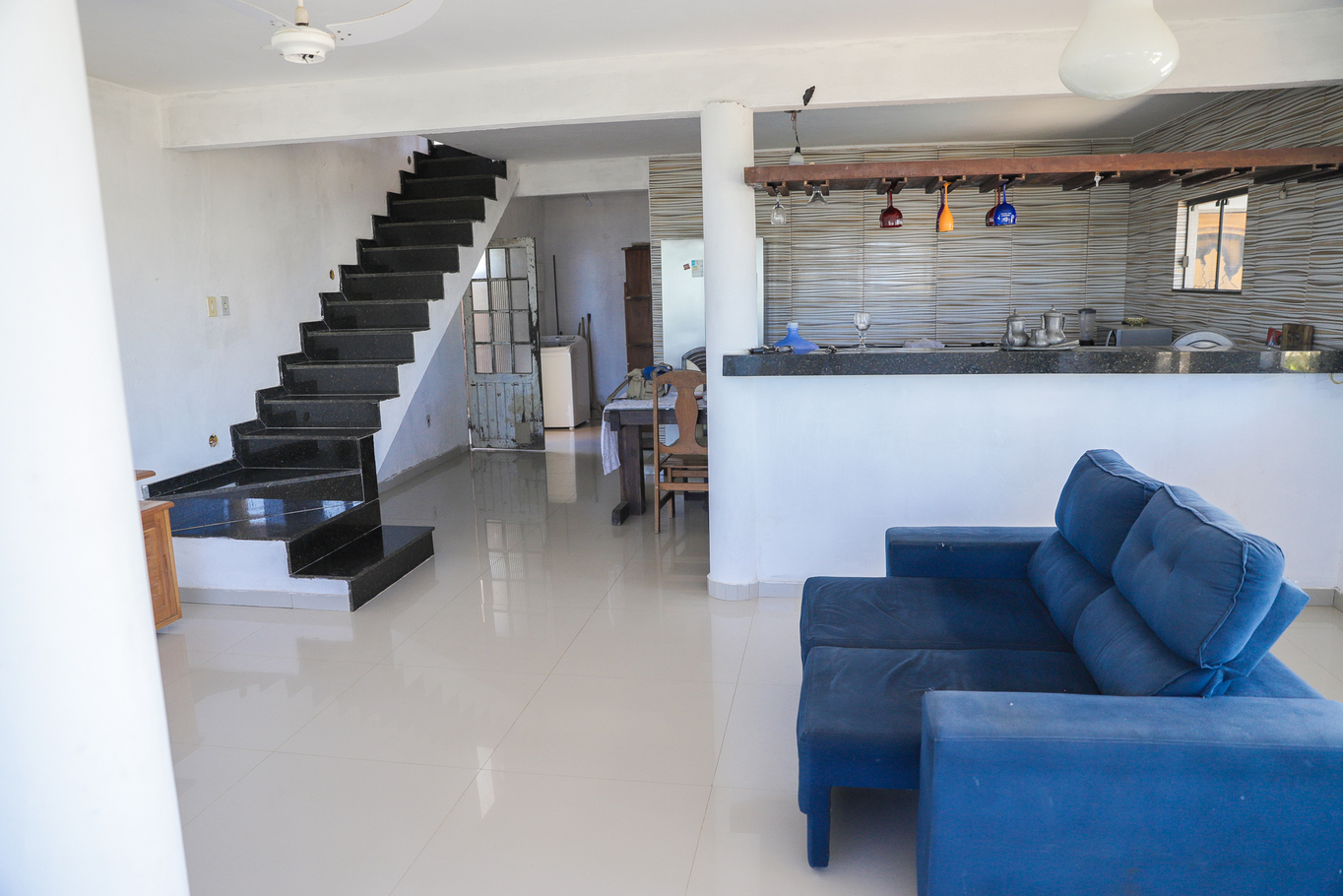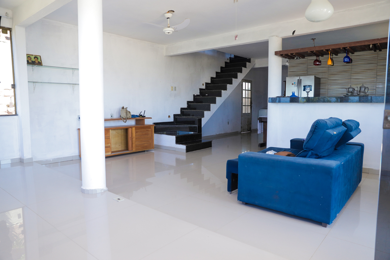 - Sala com sofás, sofá-cama e ventilador de teto