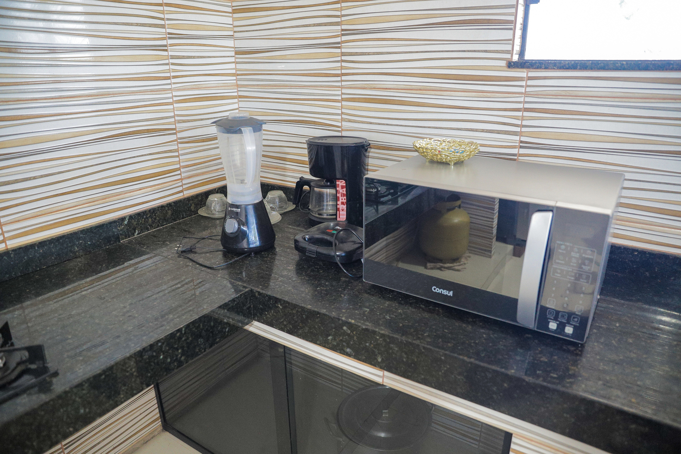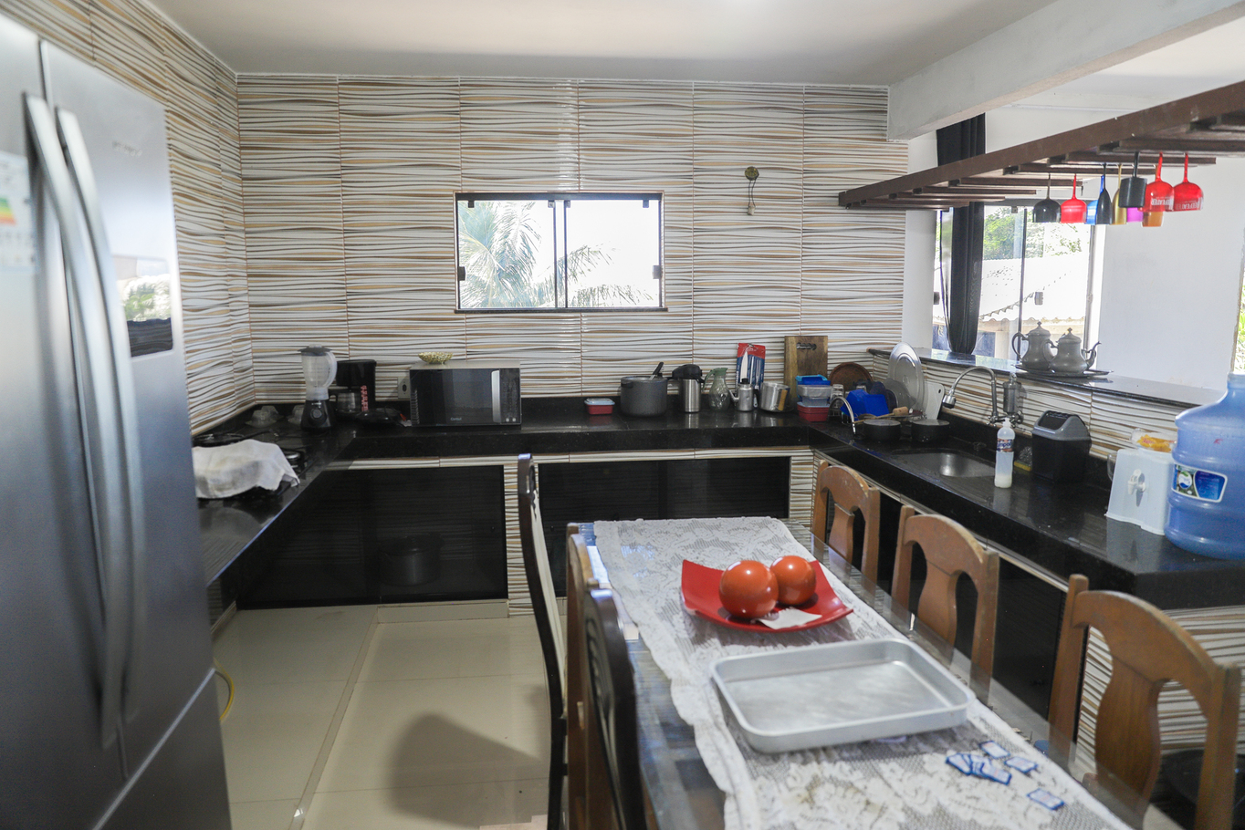 - Cozinha equipada com fogão, forno, geladeira, freezer, micro-ondas e utensílios diversos(exceto óleo e sal)