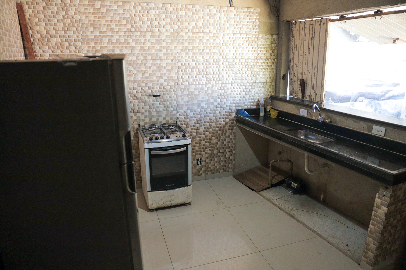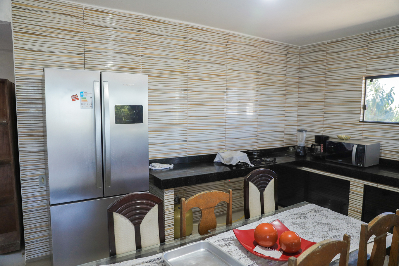 - Cozinha externa com fogão, forno e geladeira