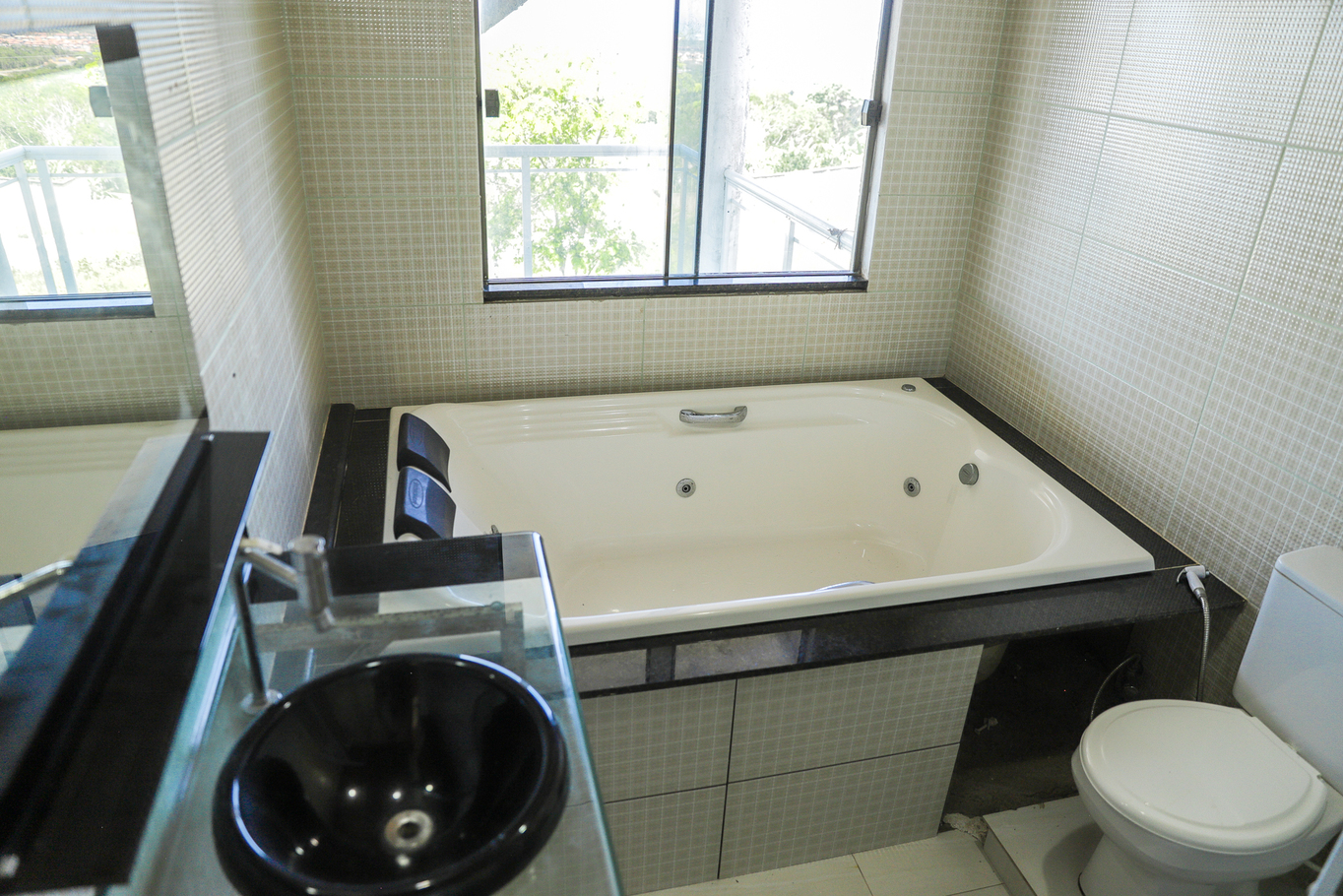- Quarto 1 (suíte): cama de casal, armário, banheiro privativo com banheira grande para 2 pessoas