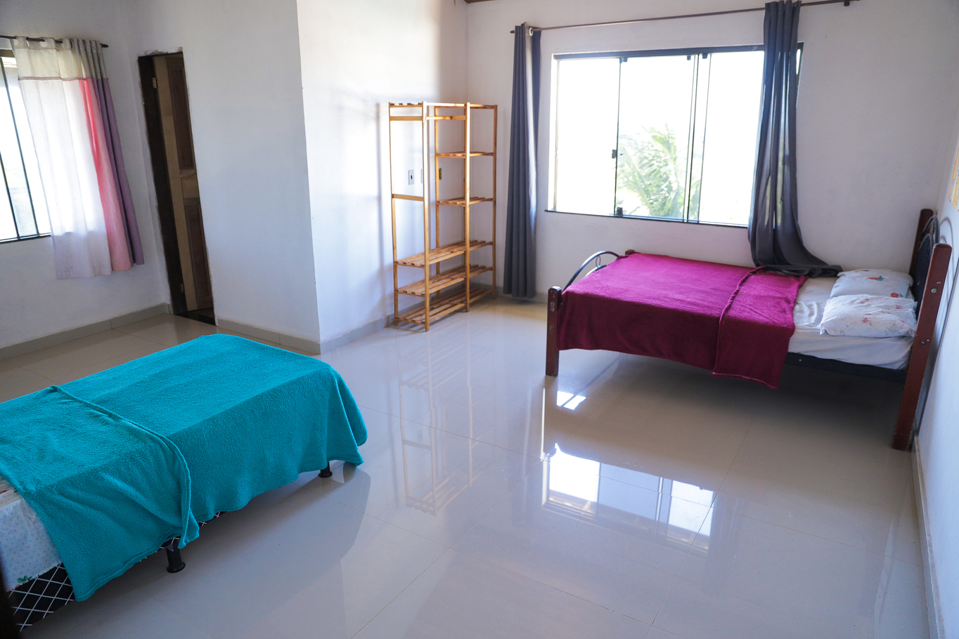 - Quarto 3 (suíte): cama de casal, cama de solteiro, estante com cabideiro, banheiro privativo e varanda