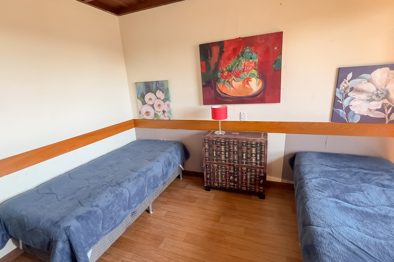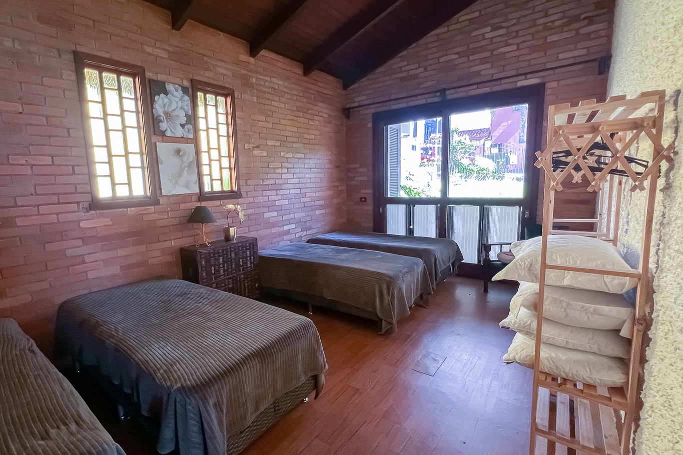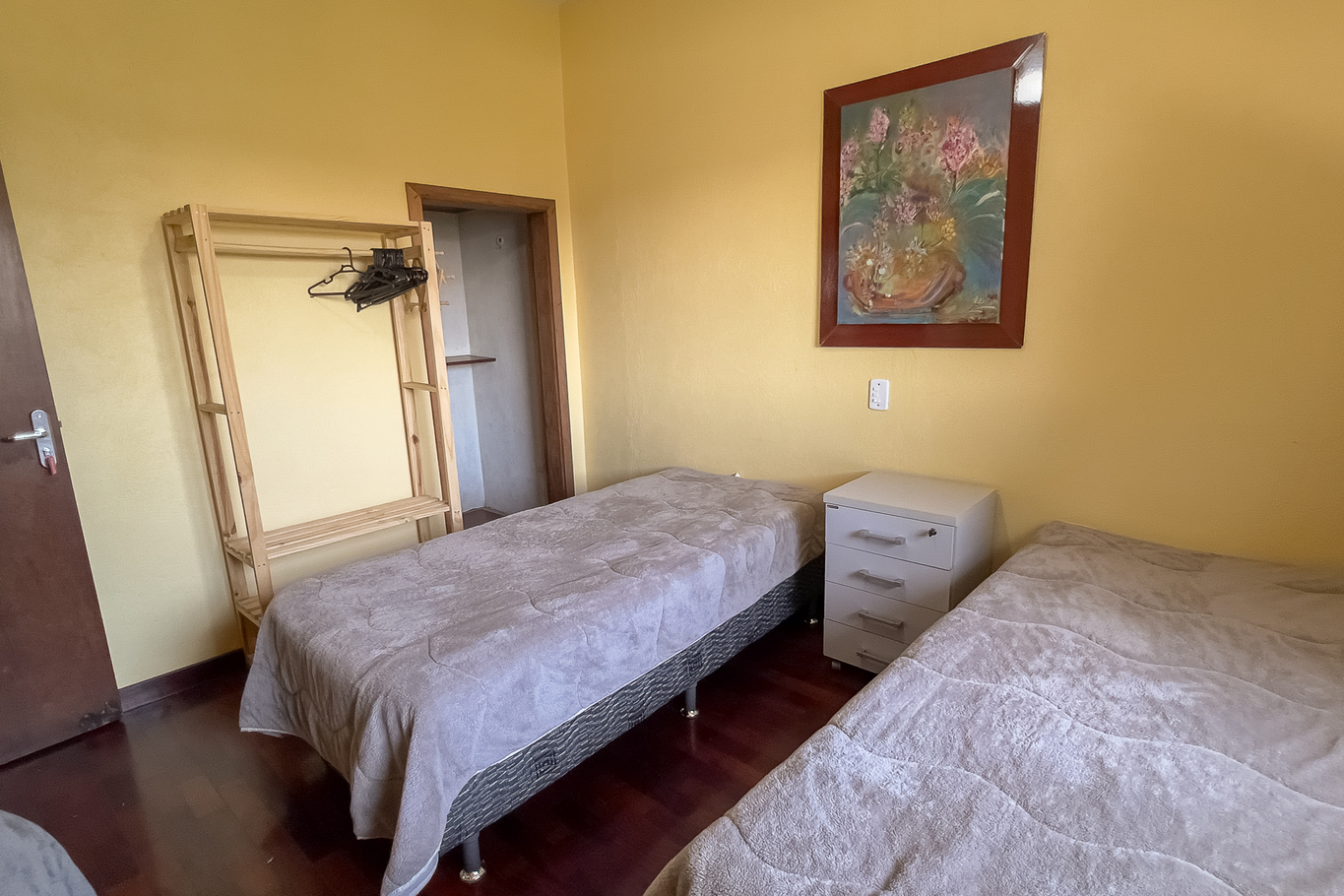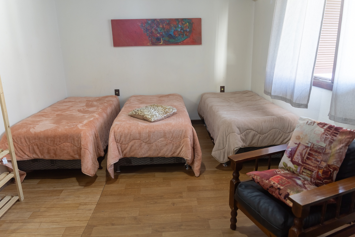 - Quarto 1 – Suíte: 3 camas de solteiro, ar-condicionado, armário, banheiro privativo com box e secador de cabelo