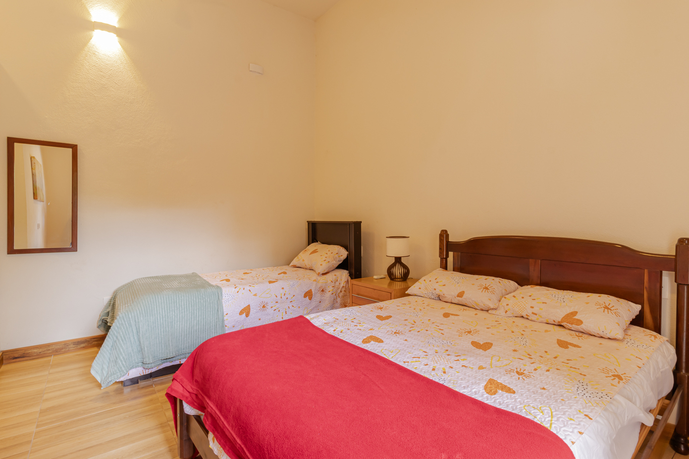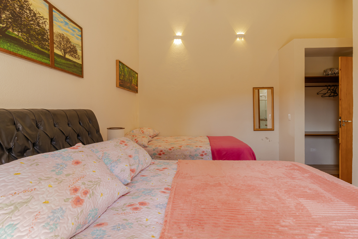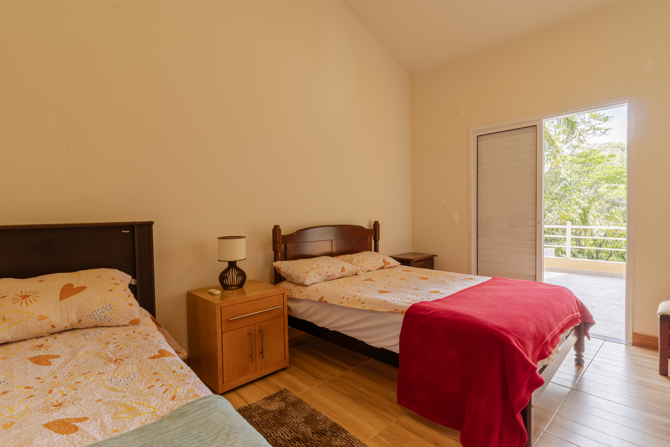 - Quarto 2 (suíte): 1 cama de casal, 1 bicama e 1 colchão extra de solteiro, além de armário e ventilador de teto. Banheiro privativo com chuveiro elétrico e box de vidro.
