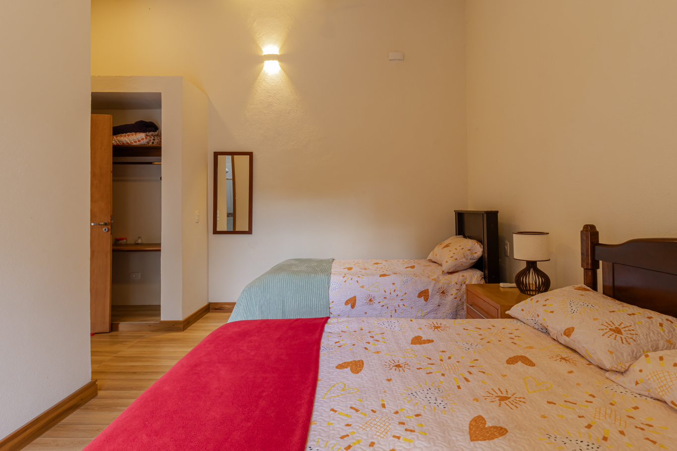 - Quarto 1 (suíte): 2 camas de casal, armário, ventilador de teto e banheiro privativo com chuveiro elétrico, box de vidro e secador de cabelo.
