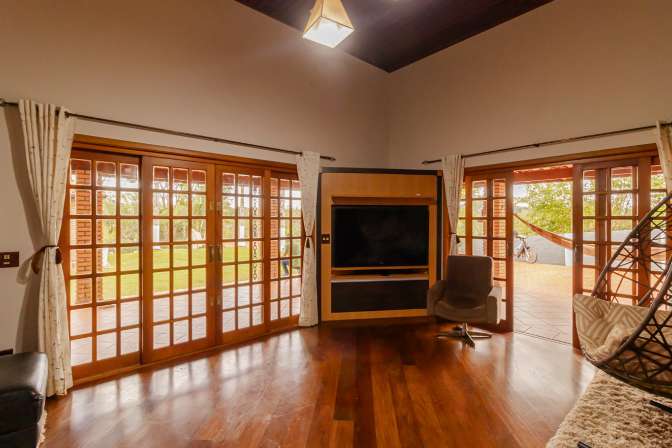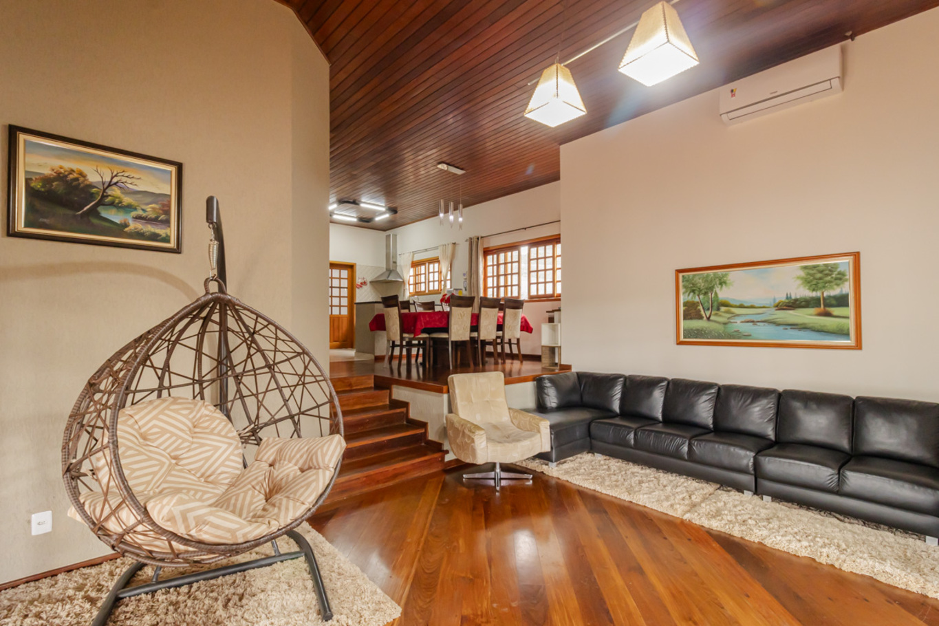 - Sala com ar-condicionado, sofá, poltronas, smart TV, TV a cabo, lareira e mesa de jantar