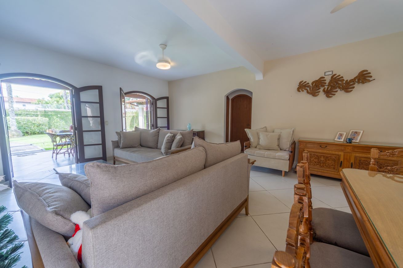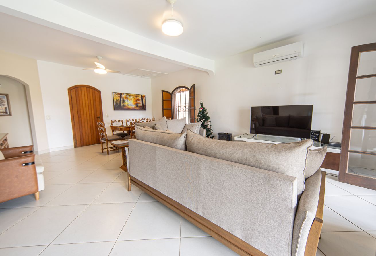 - Sala ampla e climatizada, smart TV, dois sofás confortáveis e mesa de jantar para 8 pessoas