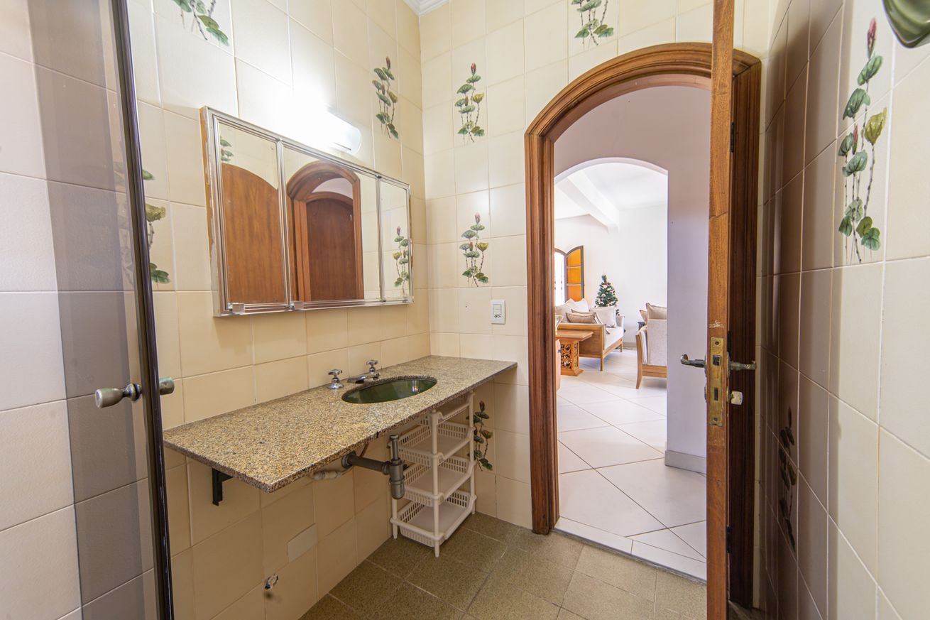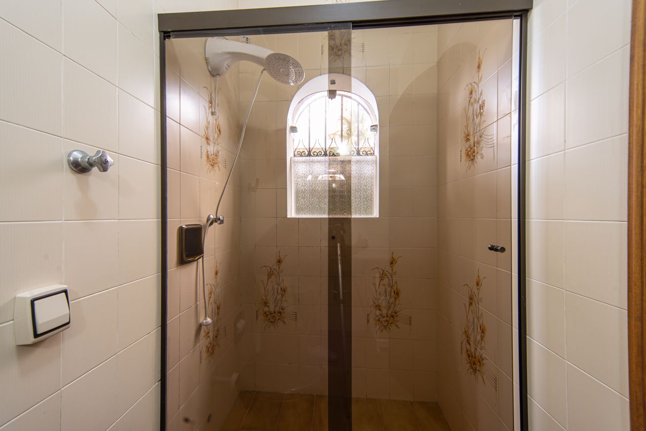 - Banheiro social com box de vidro e chuveiro elétrico