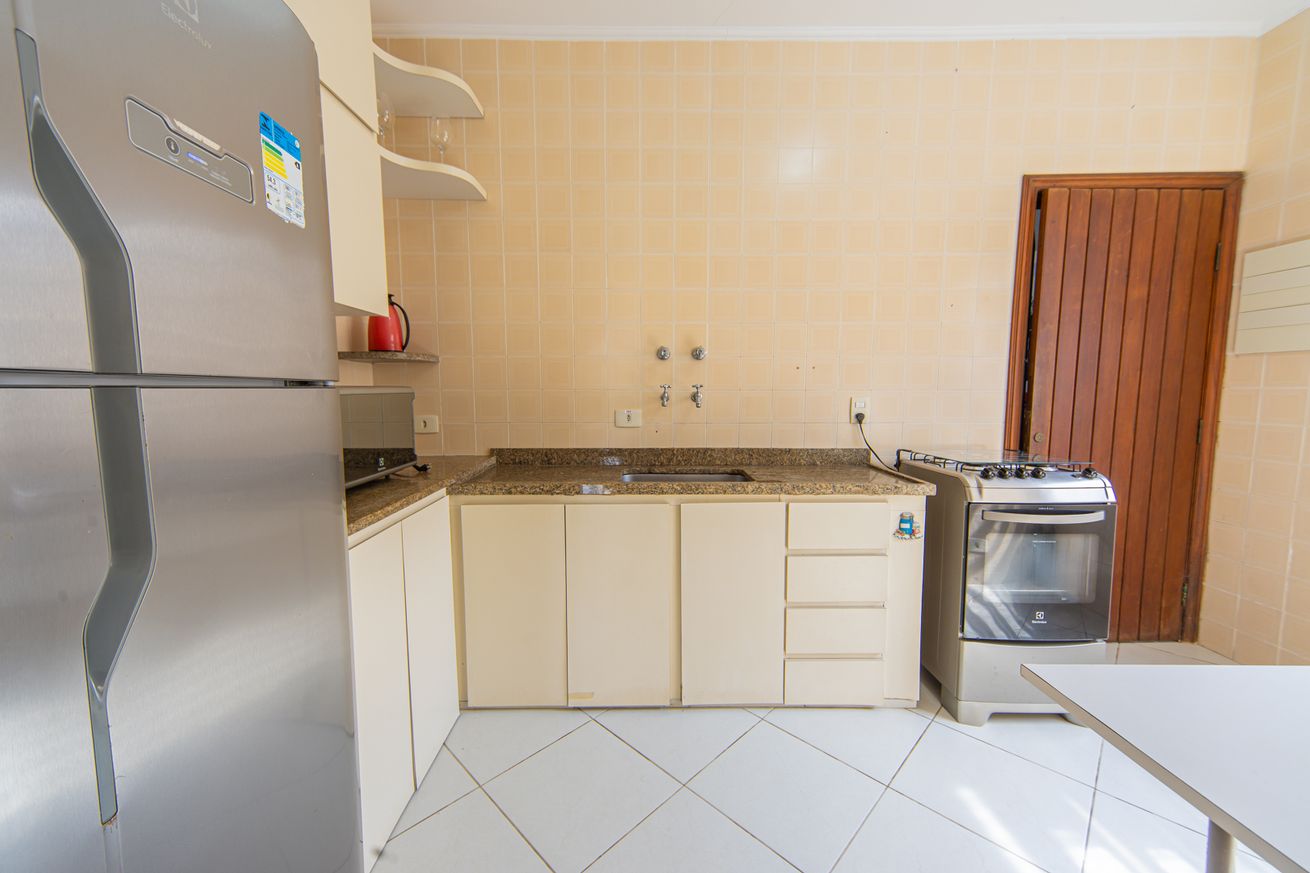 • Cozinha equipada com geladeira, fogão, forno, micro-ondas, air fryer, sanduicheira, panela elétrica de arroz e utensílios básicos(exceto óleo e sal)
