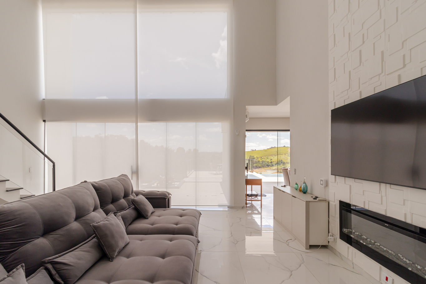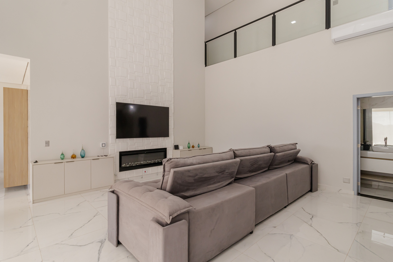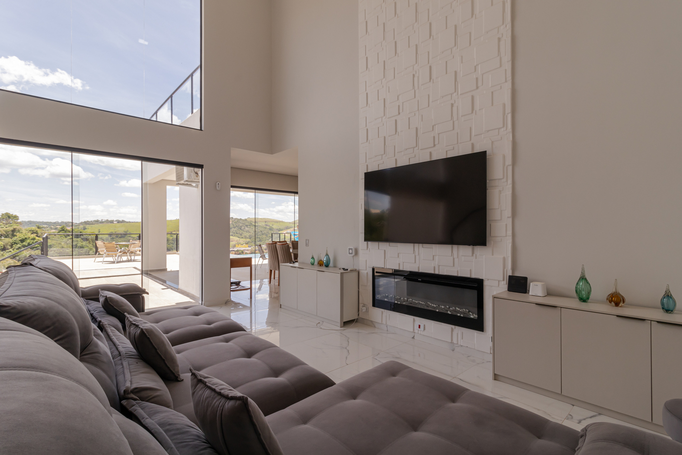 - Sala climatizada com sofá confortável e Smart TV e integração aos espaços externos