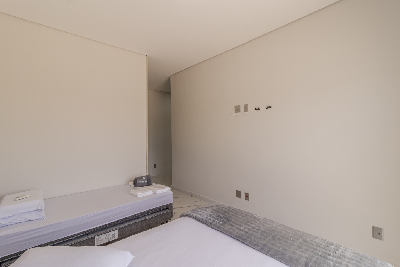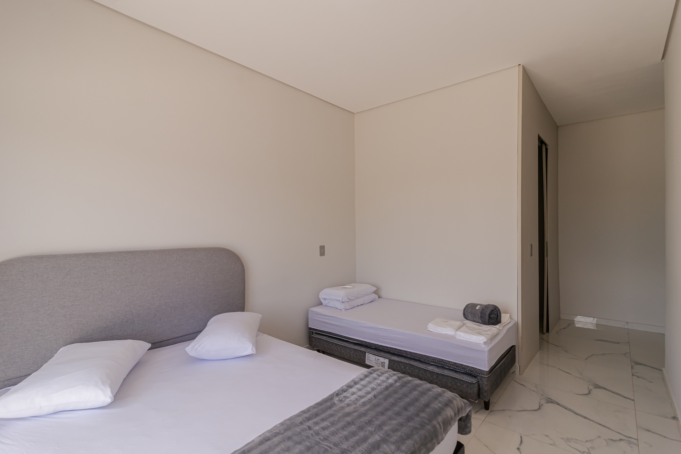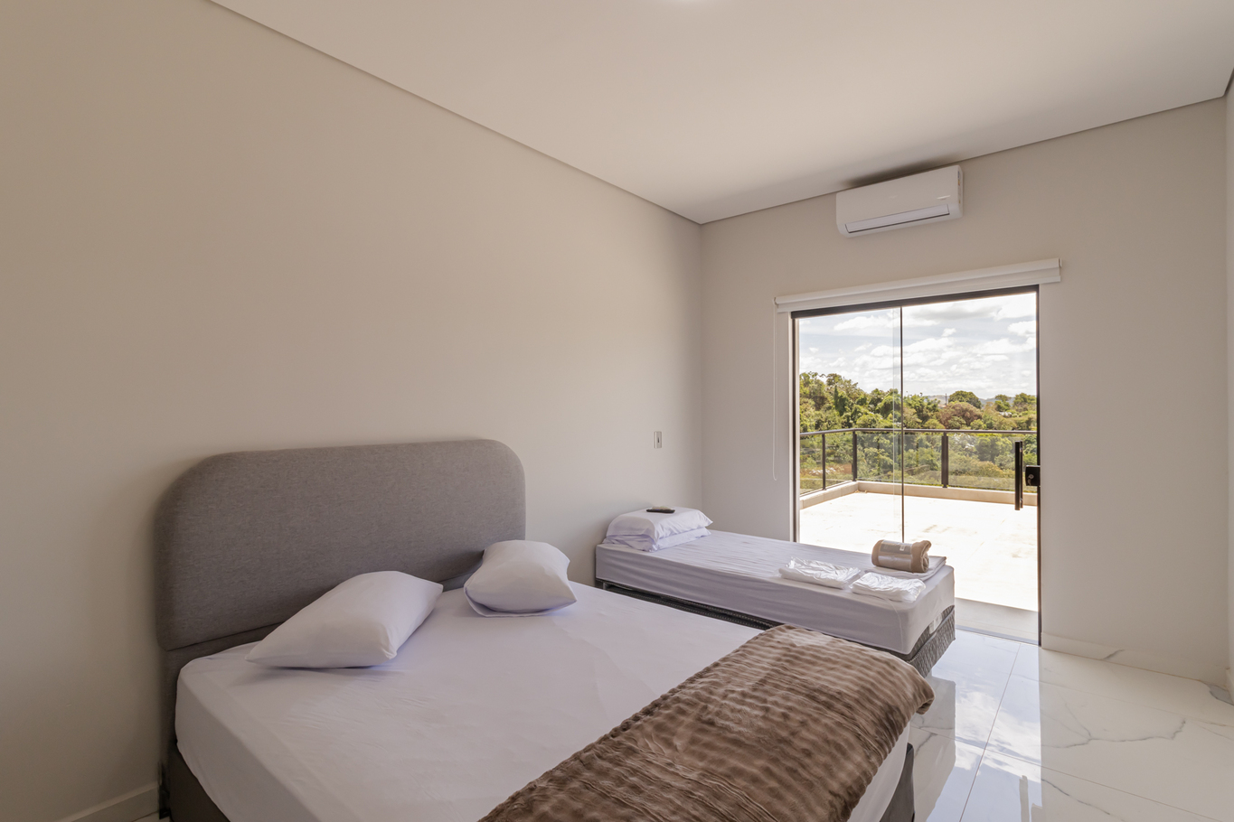 - Quarto 3: cama queen, bicama, ar-condicionado e Smart TV