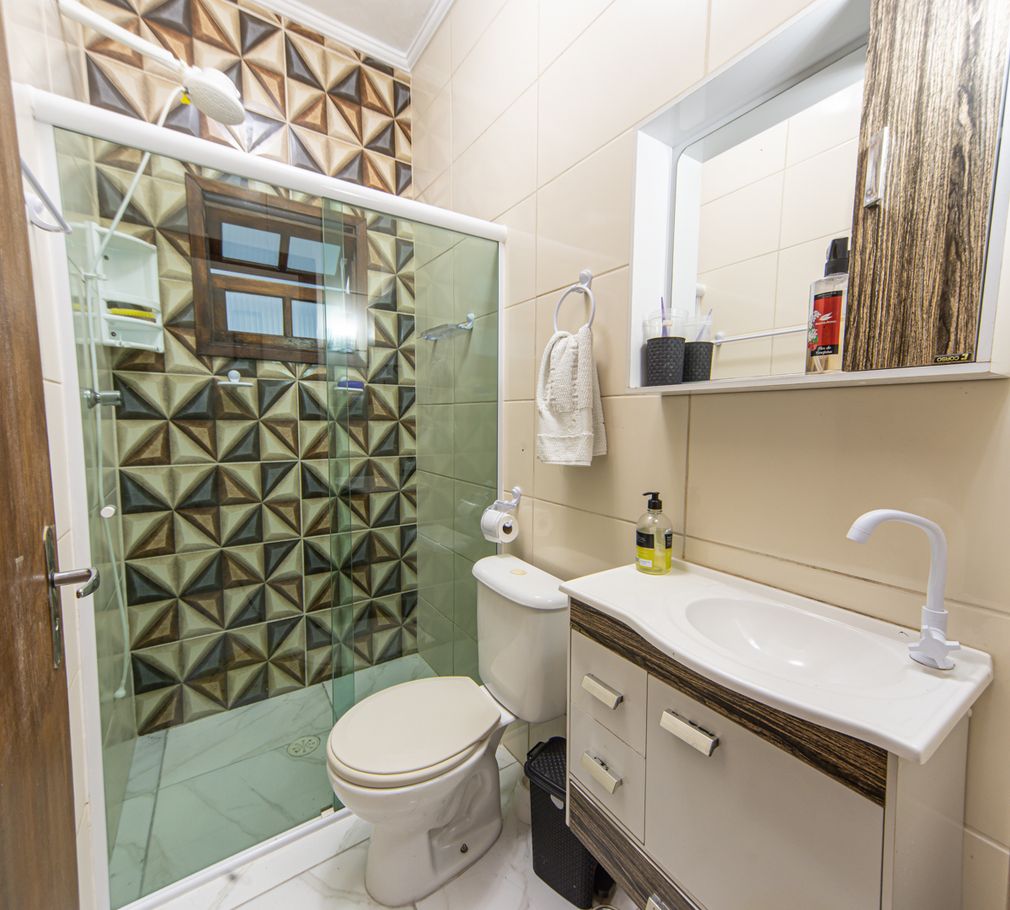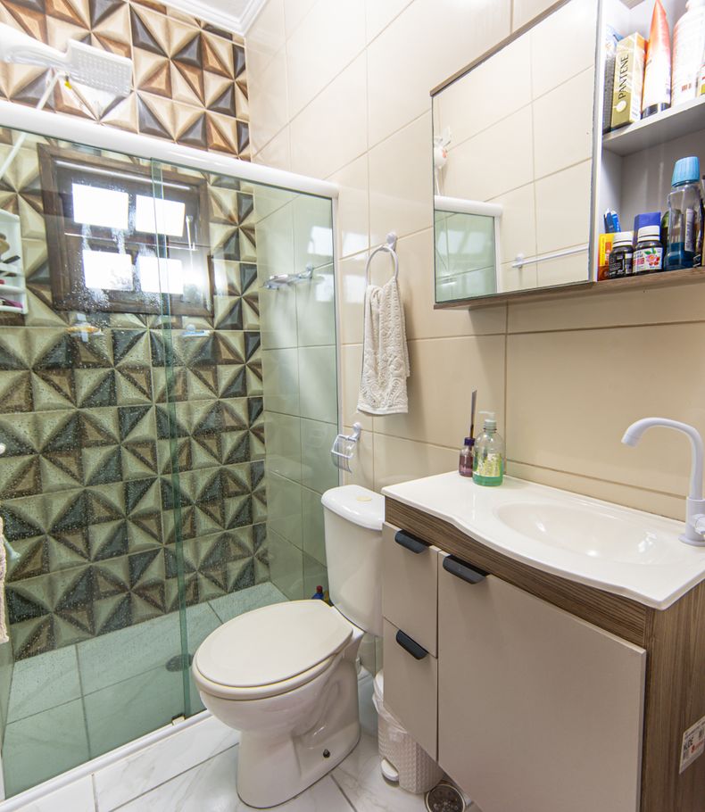 - Banheiro social com chuveiro elétrico e box