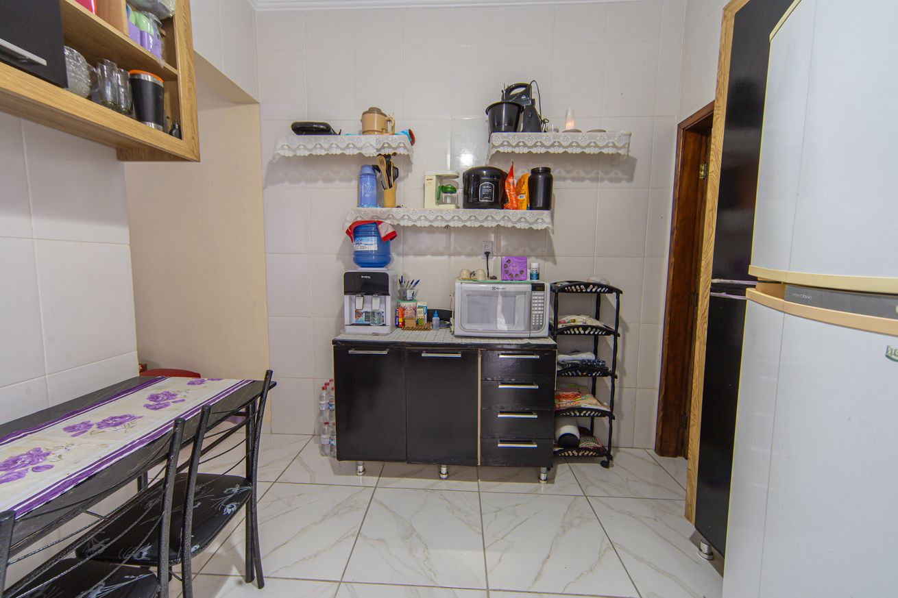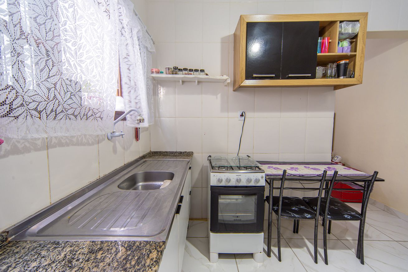 - Cozinha com mesa, fogão, geladeira, freezer, micro-ondas, cafeteira, liquidificador, batedeira, sanduicheira, utensílios e itens de cozinha(exceto óleo e sal)