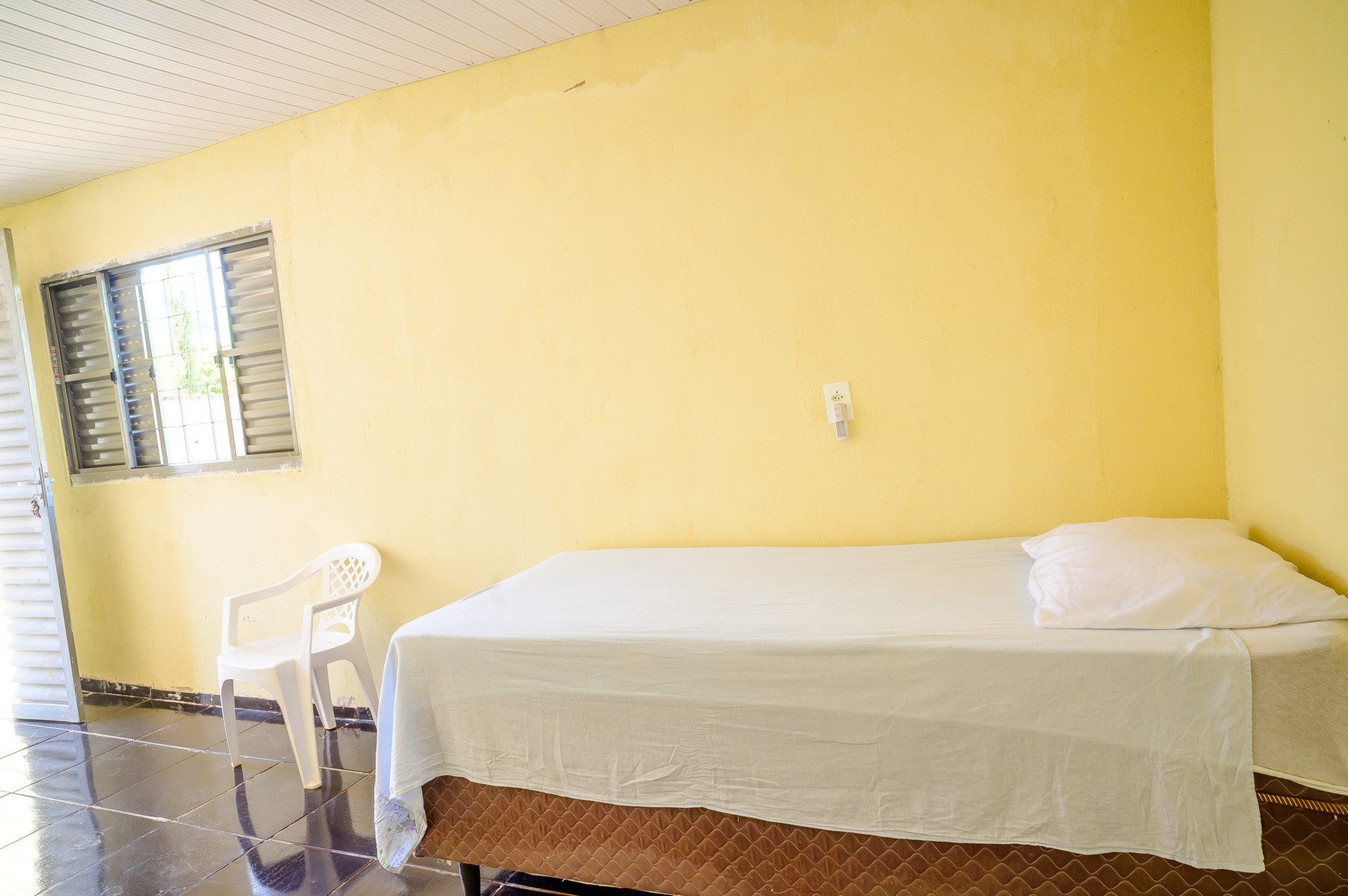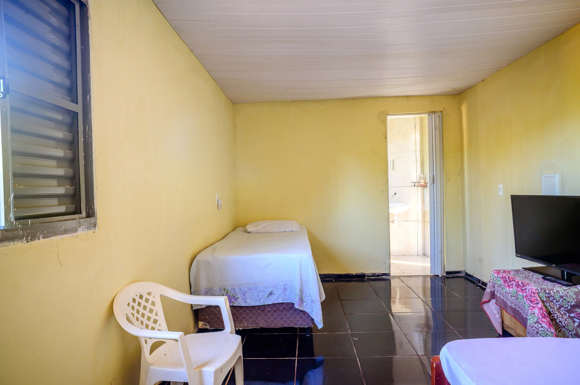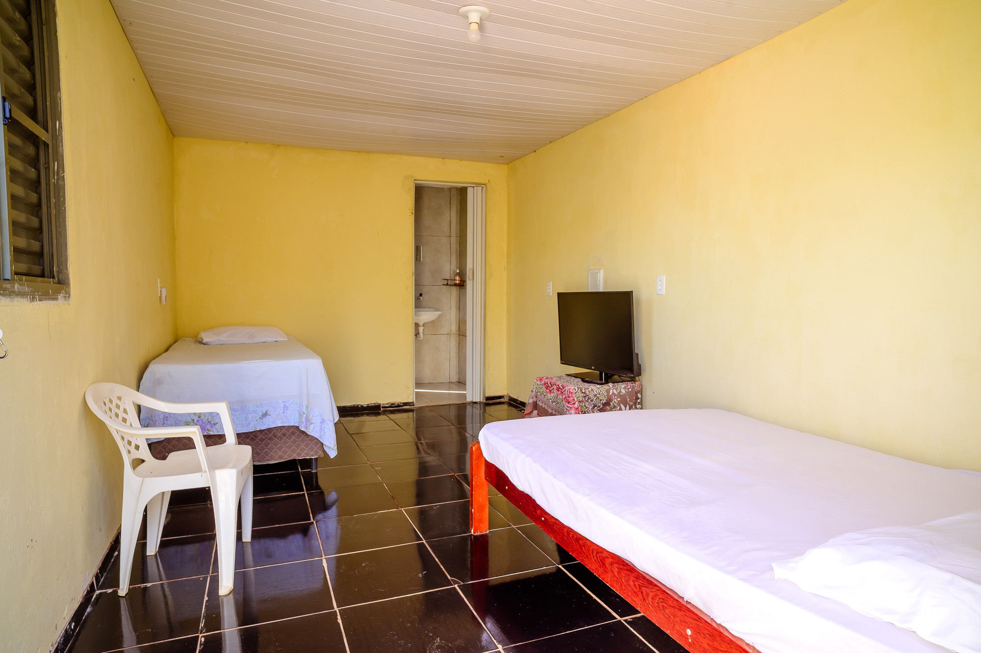 - Quarto com 1 cama de casal, 1 cama de solteiro, TV, ventilador e banheiro com chuveiro elétrico