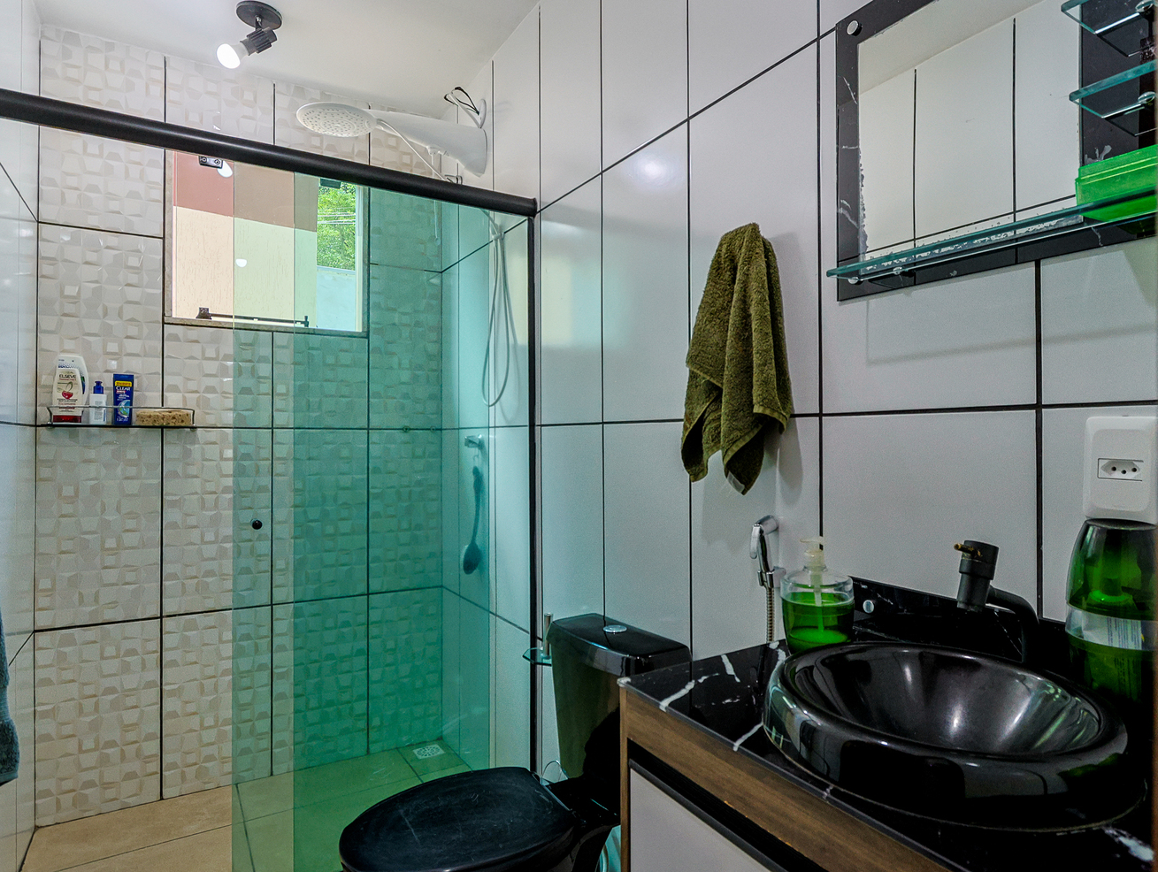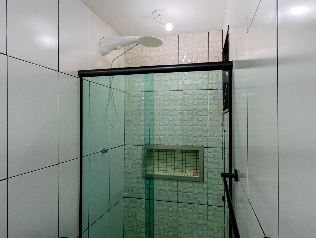Acesso a banheiro social com chuveiro elétrico e box de vidro