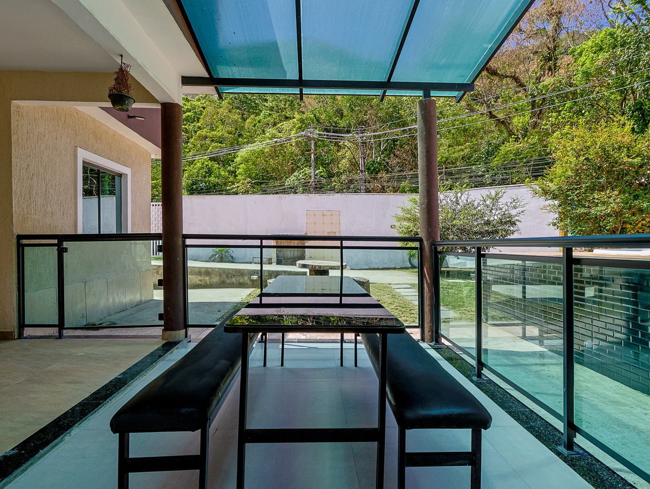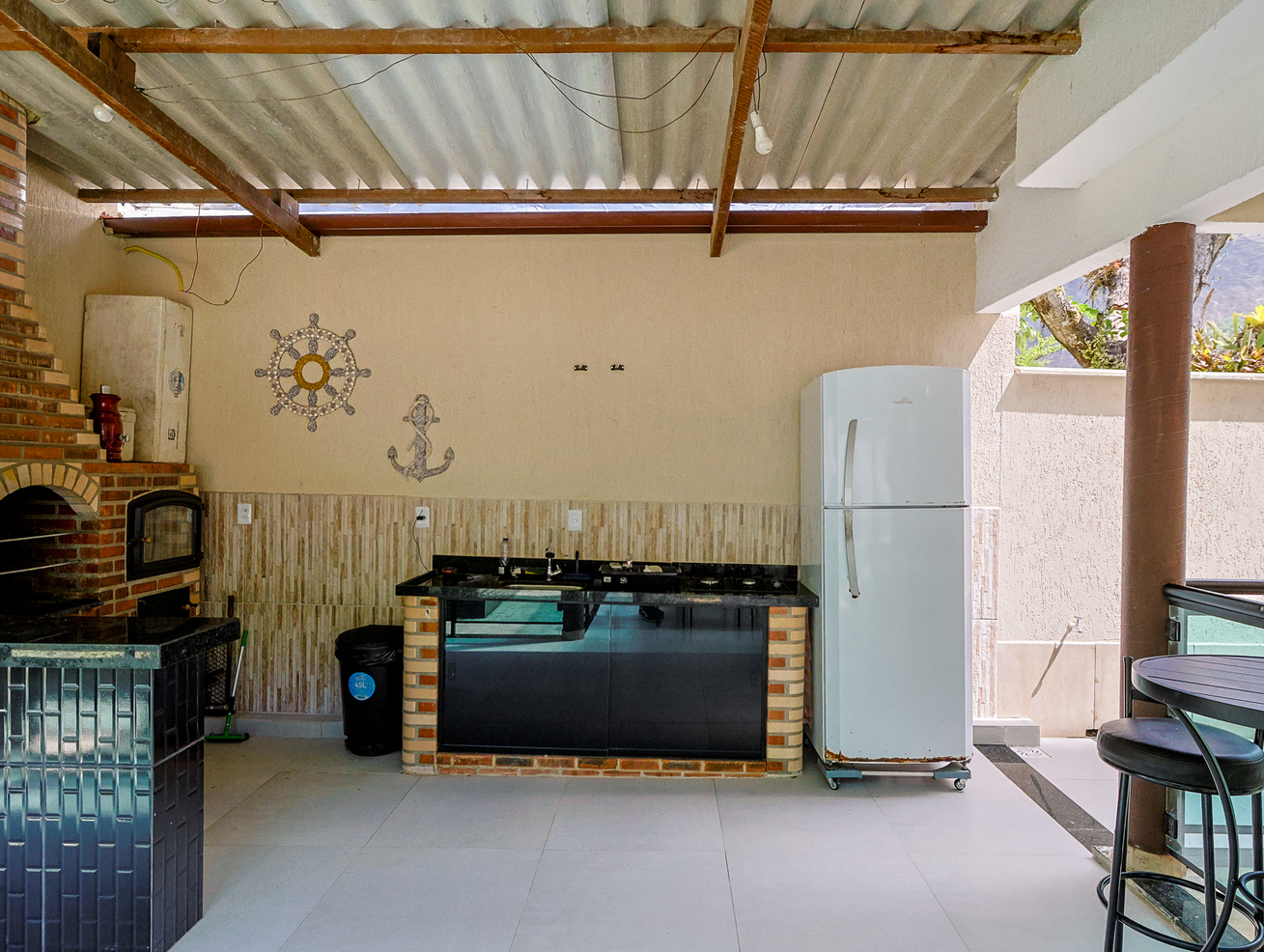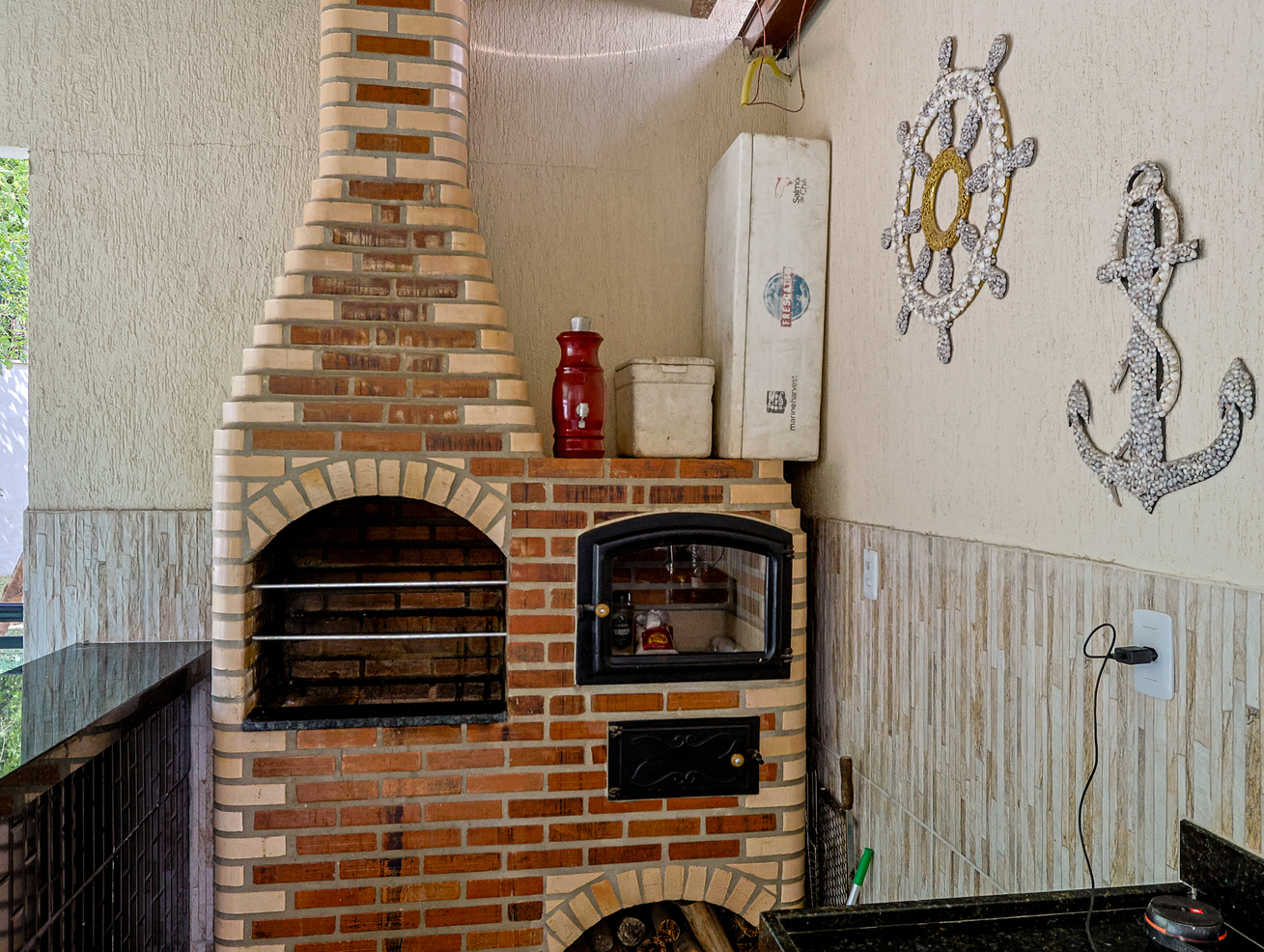 - Área gourmet coberta com churrasqueira, cooktop e mesas amplas