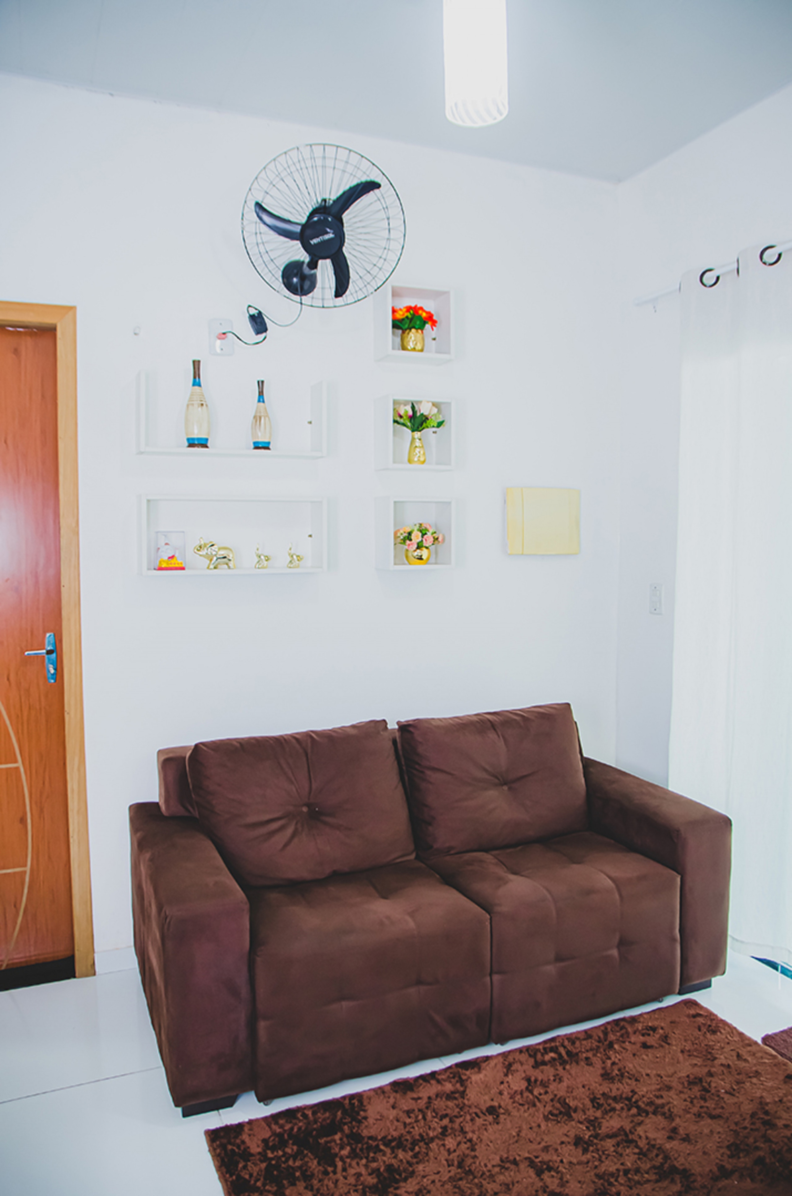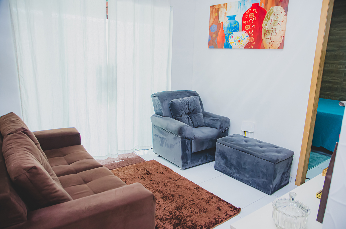 - Sala com sofá-cama, poltrona, mesa de centro e ar-condicionado