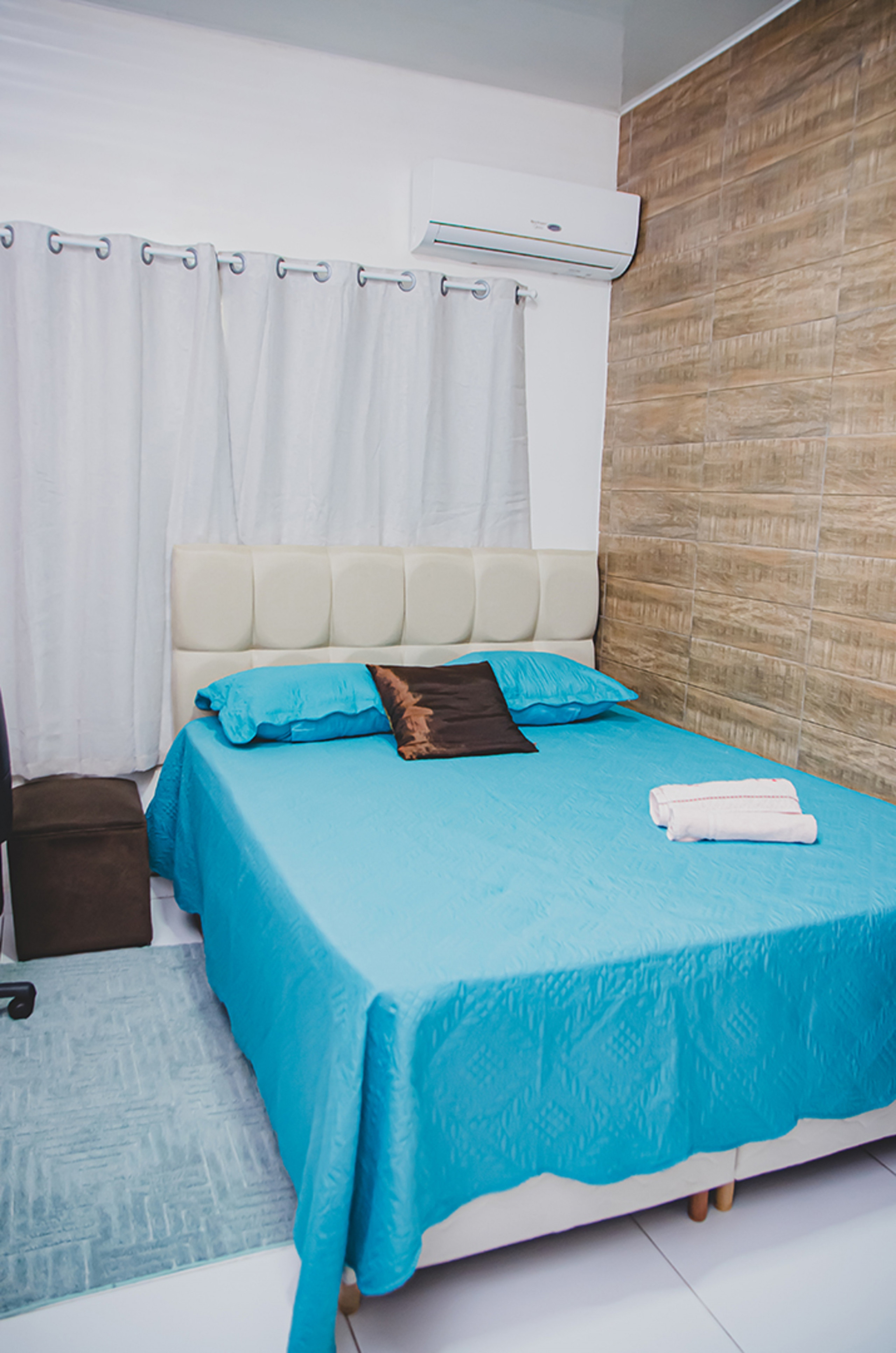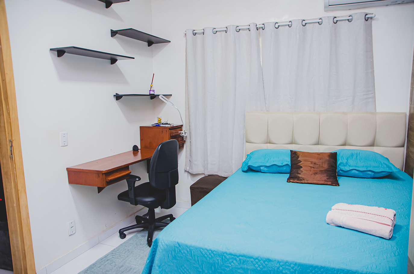 - Quarto 1 com cama queen, Smart TV, ar-condicionado e espaço para home office