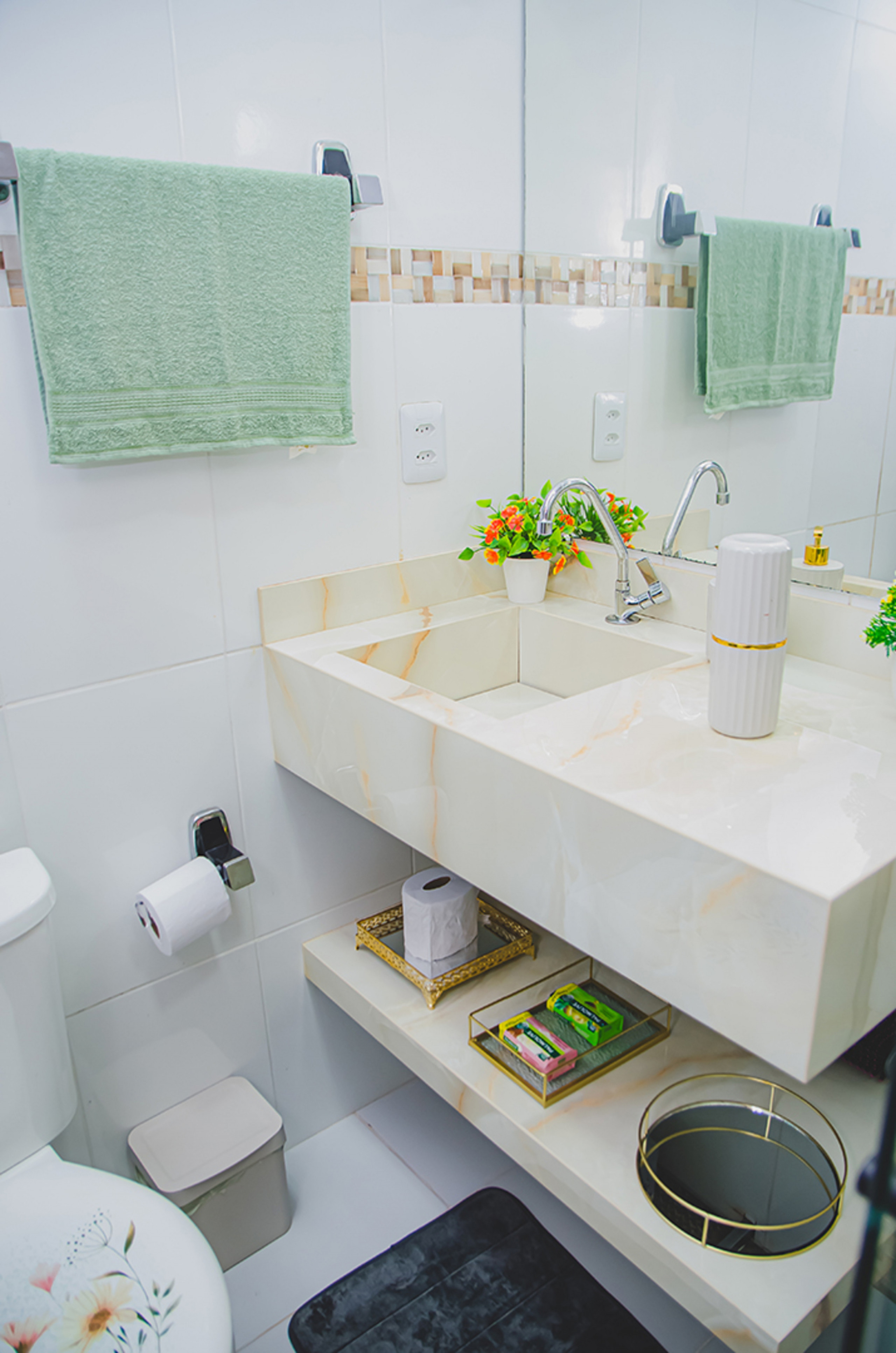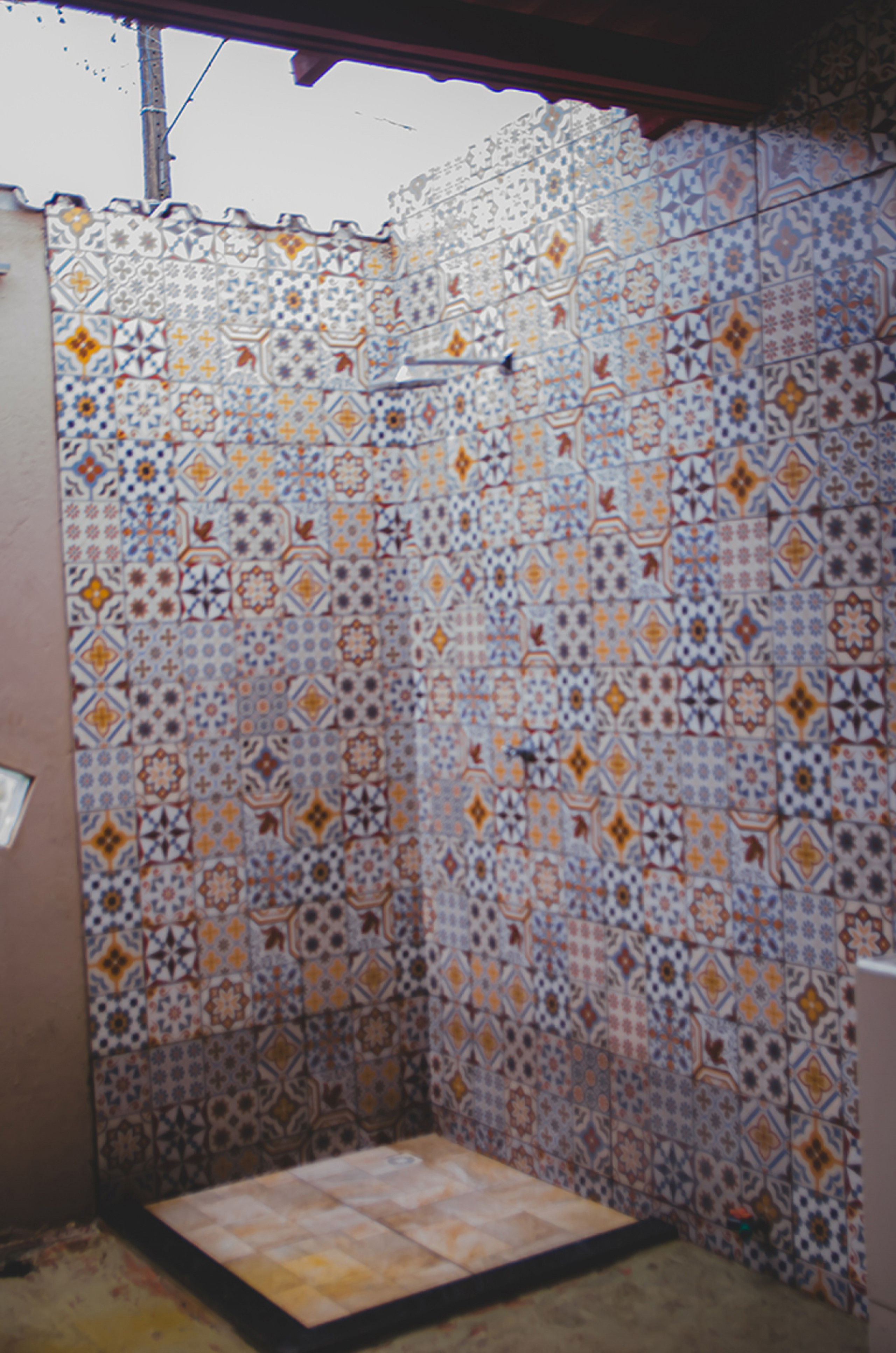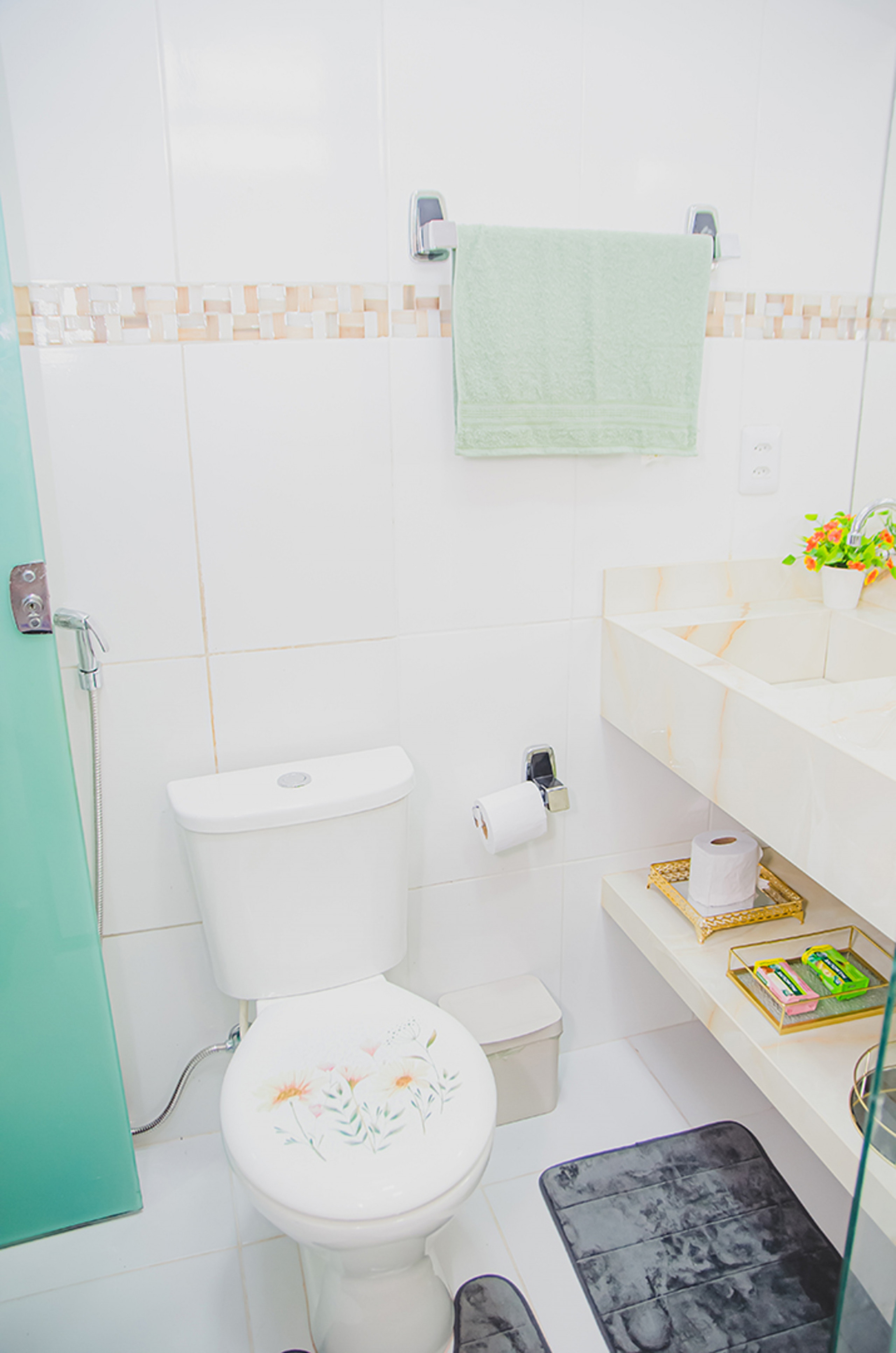 - Banheiro com chuveiro elétrico, box de vidro e secador de cabelo