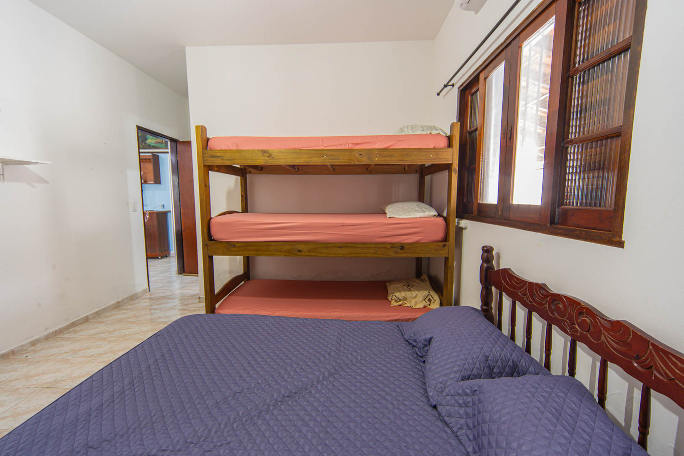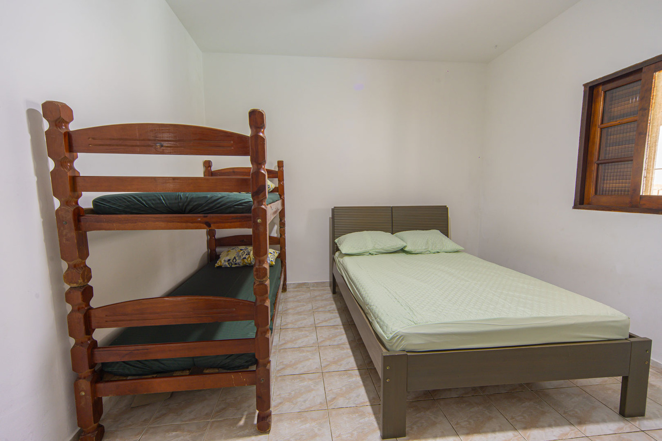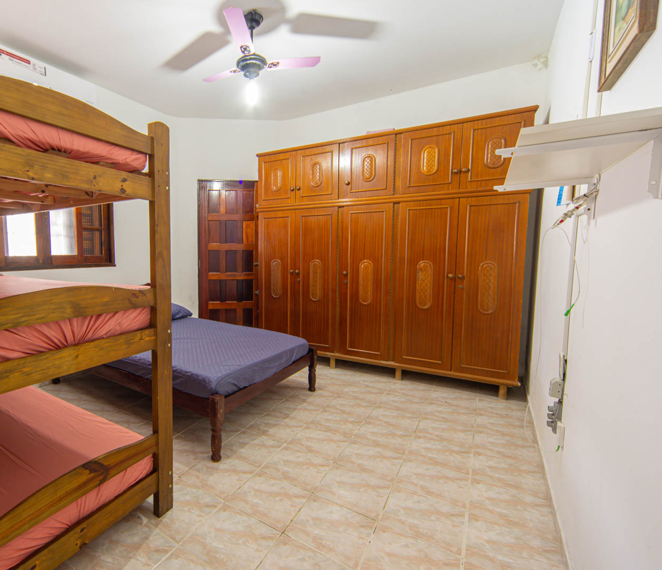 - Quarto 3: acomoda 4 pessoas com cama de casal e beliche, armário e ventilador de teto