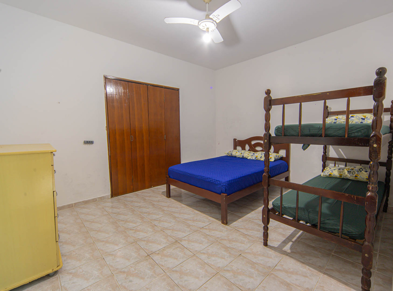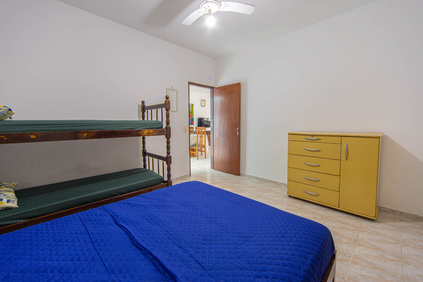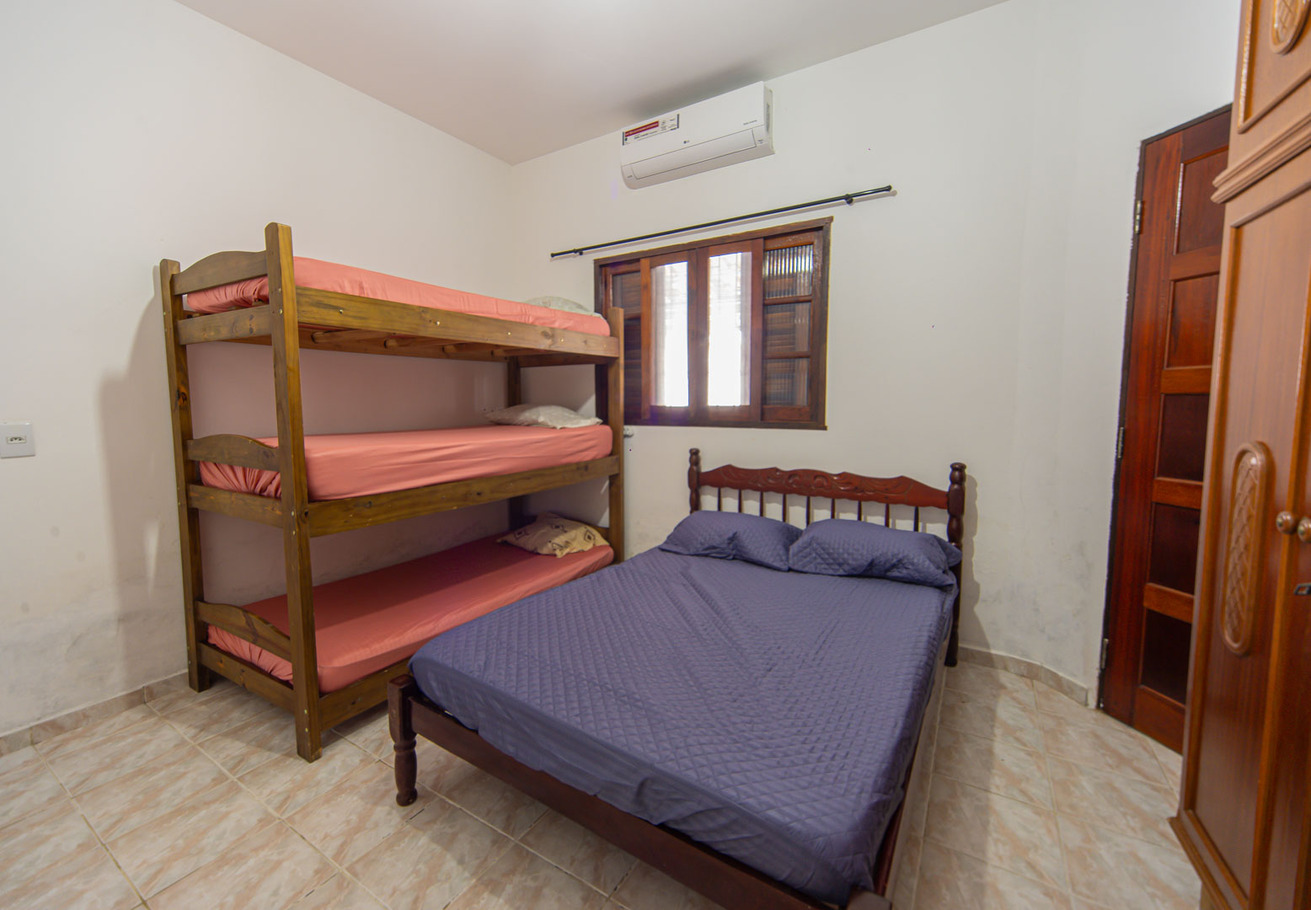 - Quarto 3: acomoda 4 pessoas com cama de casal e beliche, armário e ventilador de teto