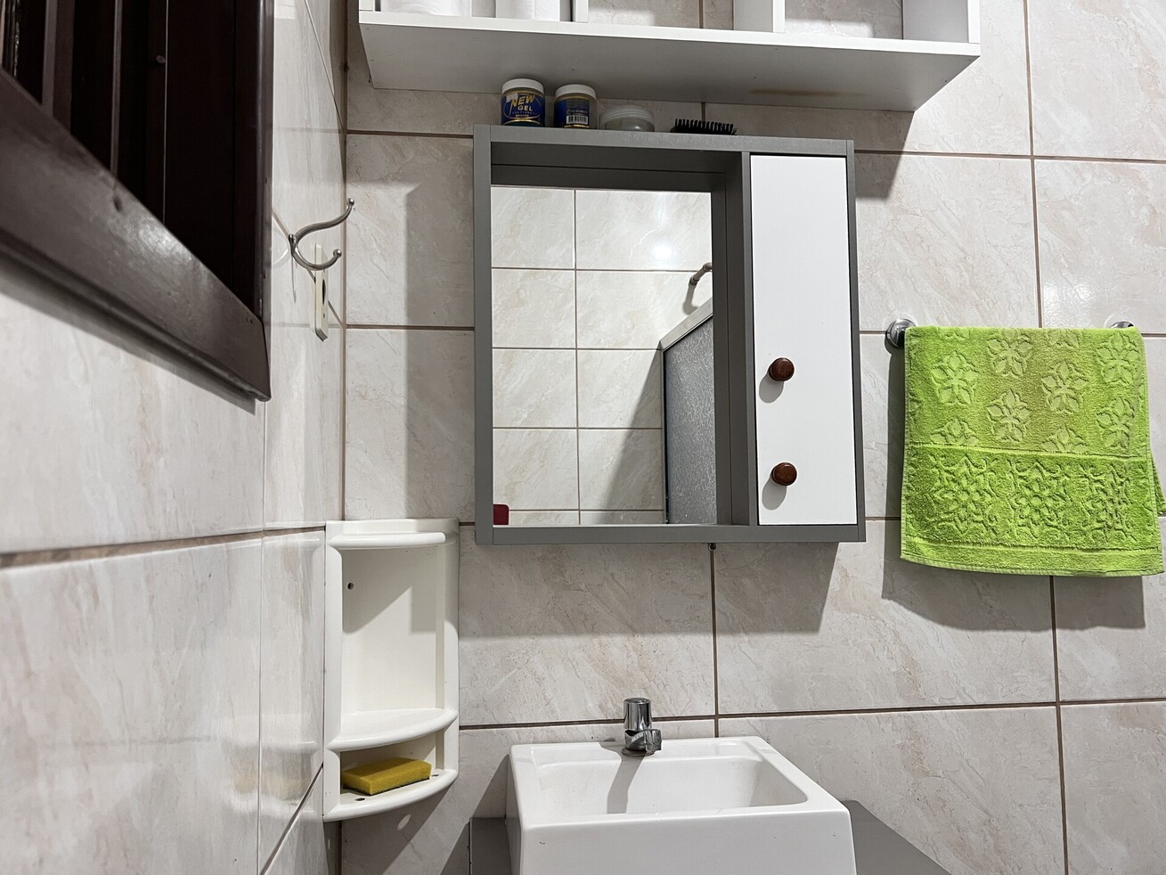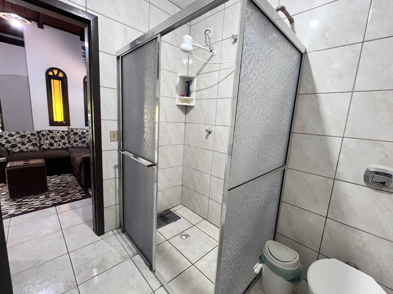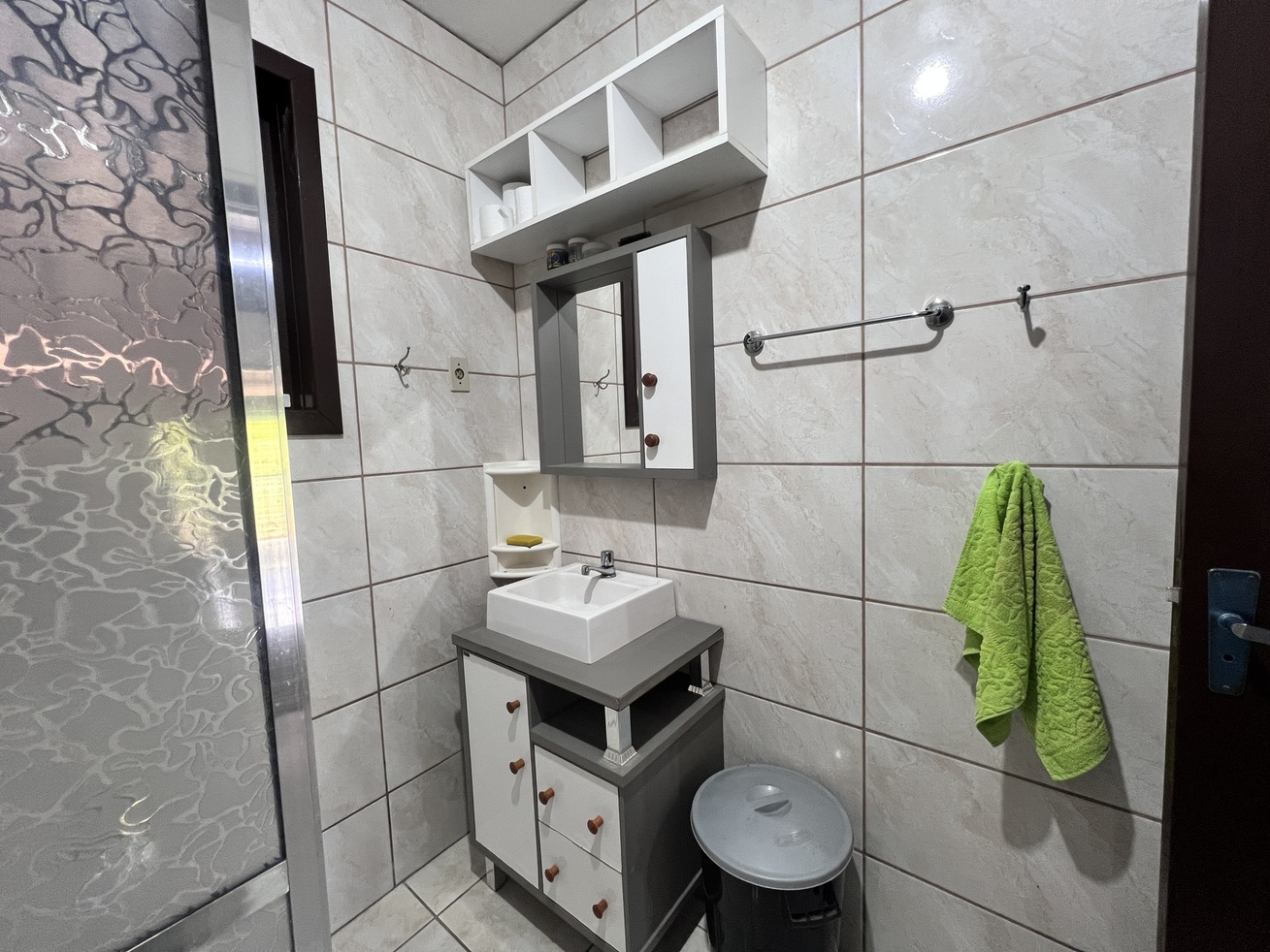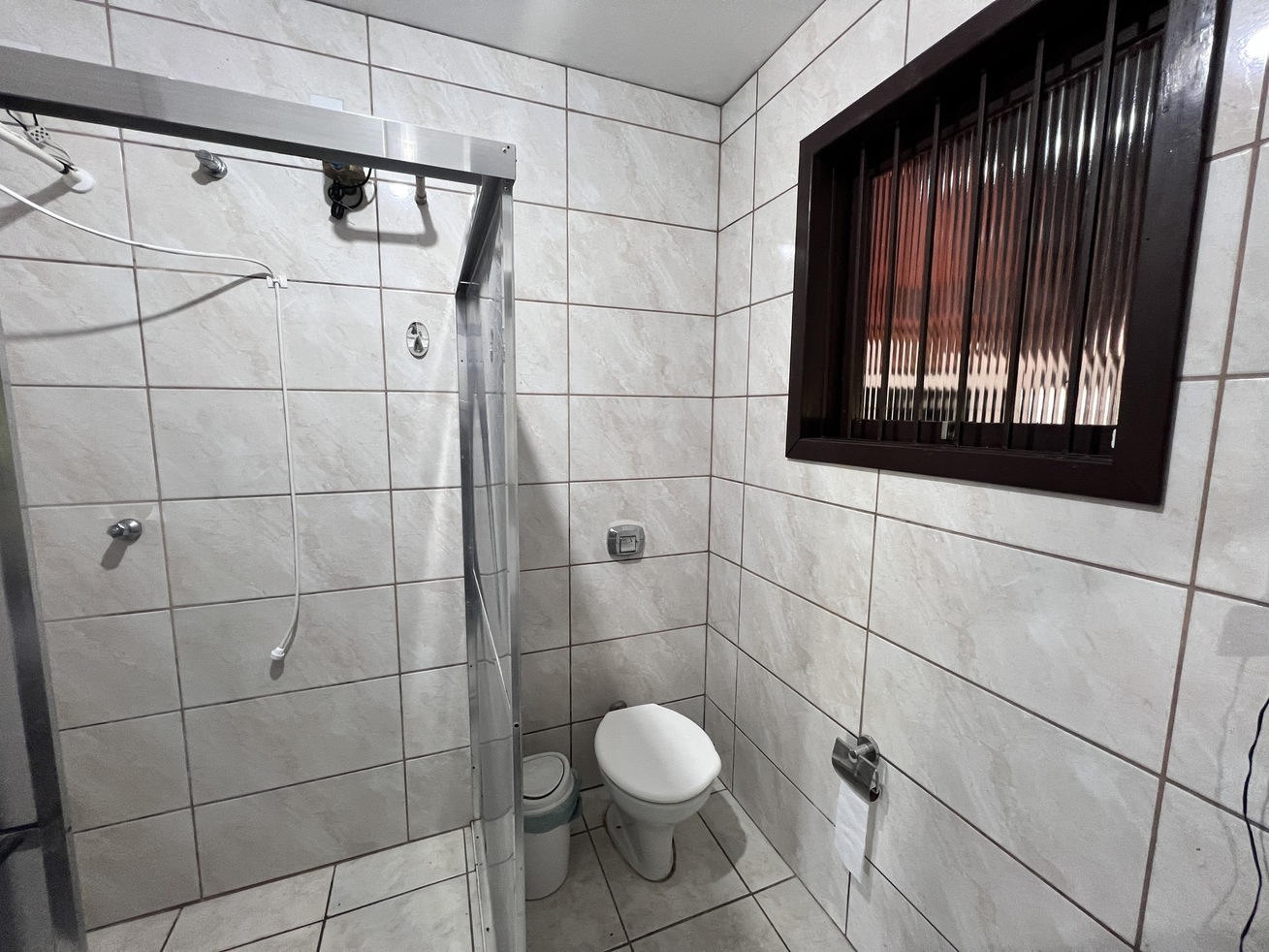 - Banheiro com chuveiro elétrico, box de vidro/acrílico, secador de cabelo e espelho