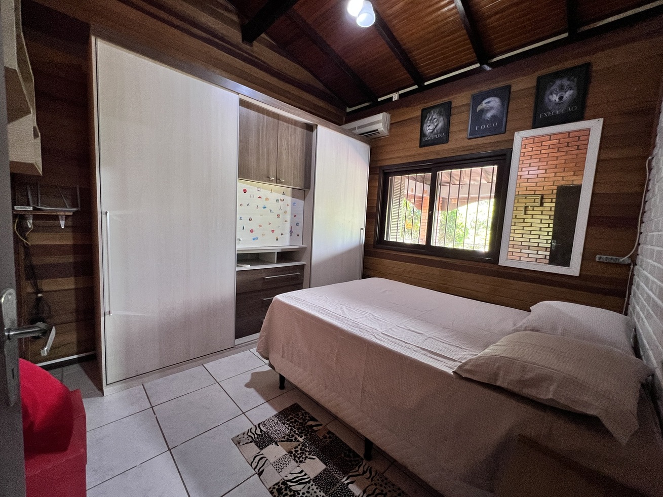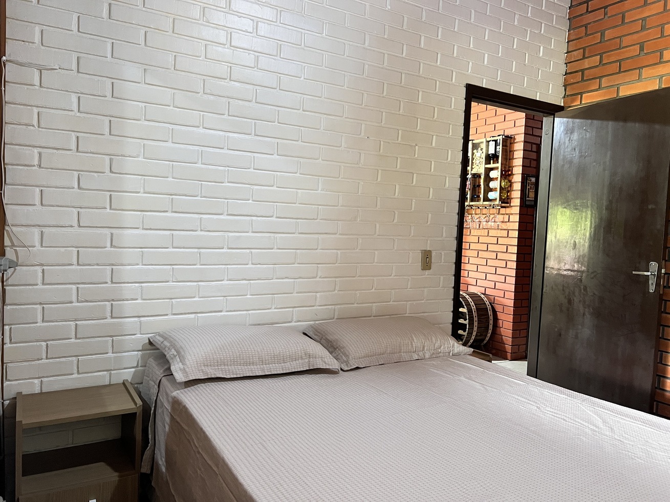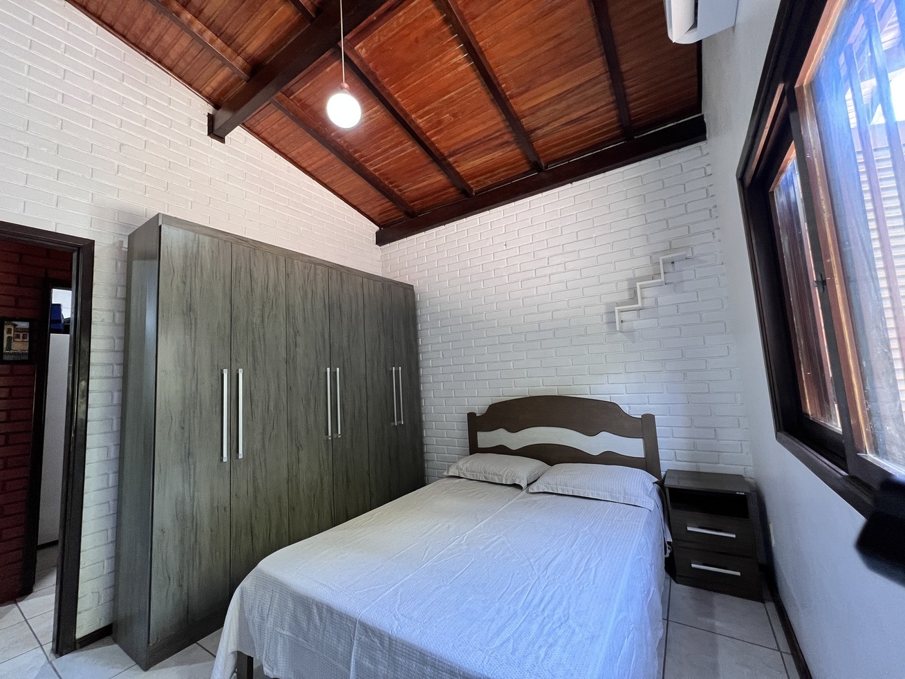 - Quarto 1: cama de casal, ar-condicionado, edredom, roupeiro e mesa de cabeceira