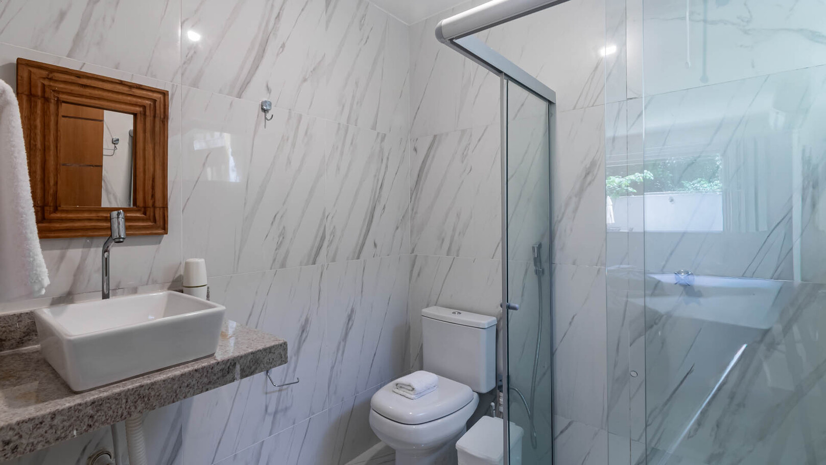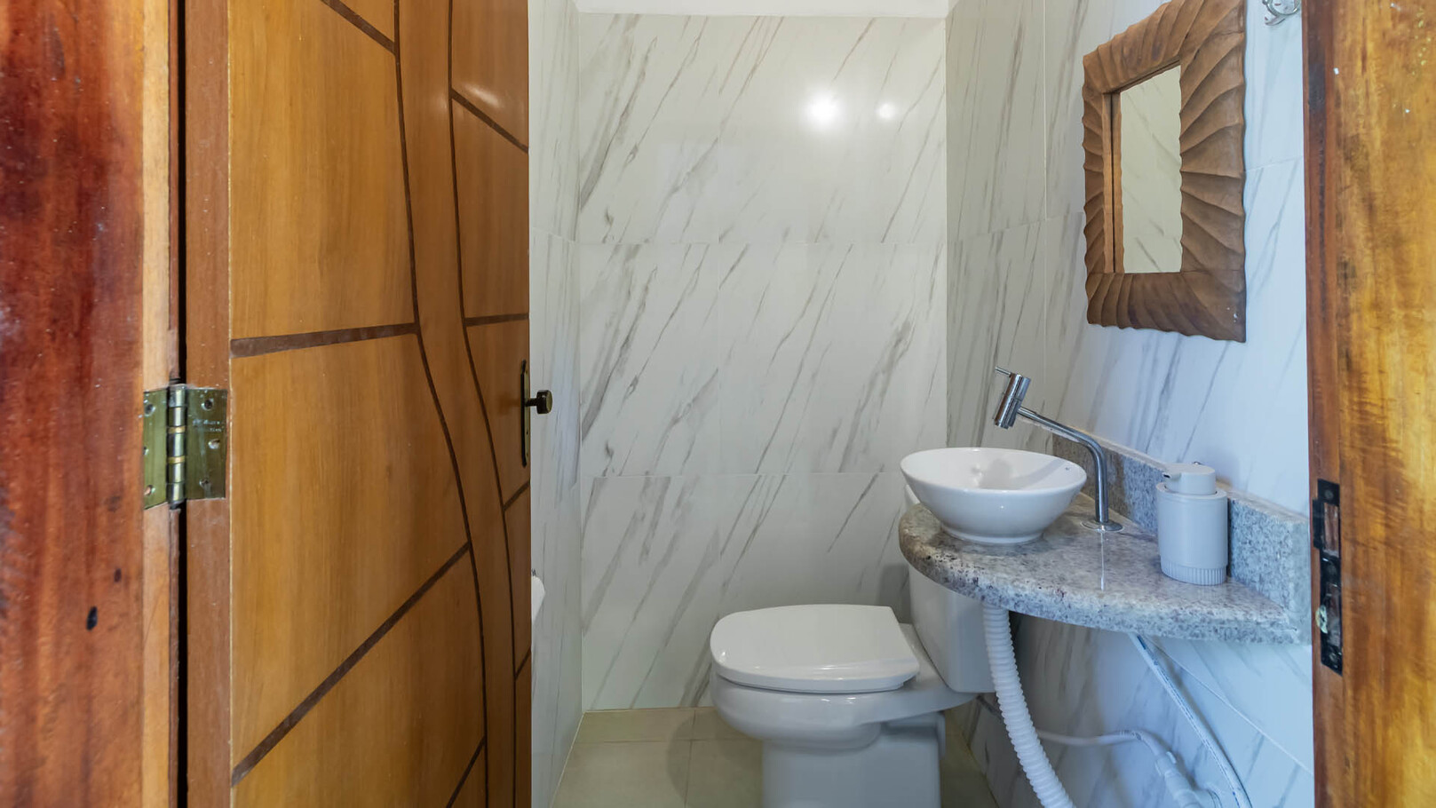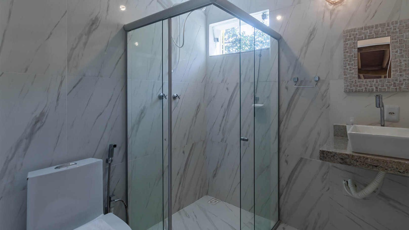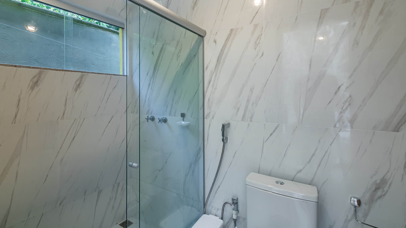 - Banheiros: 5 suítes com chuveiro elétrico e box, e 2 lavabos sociais