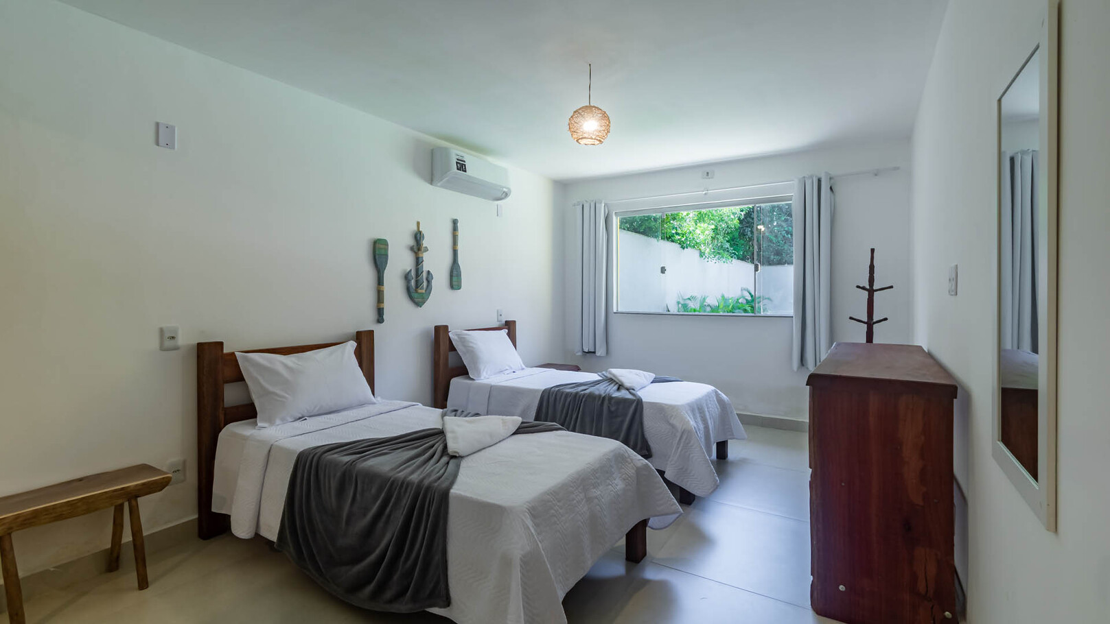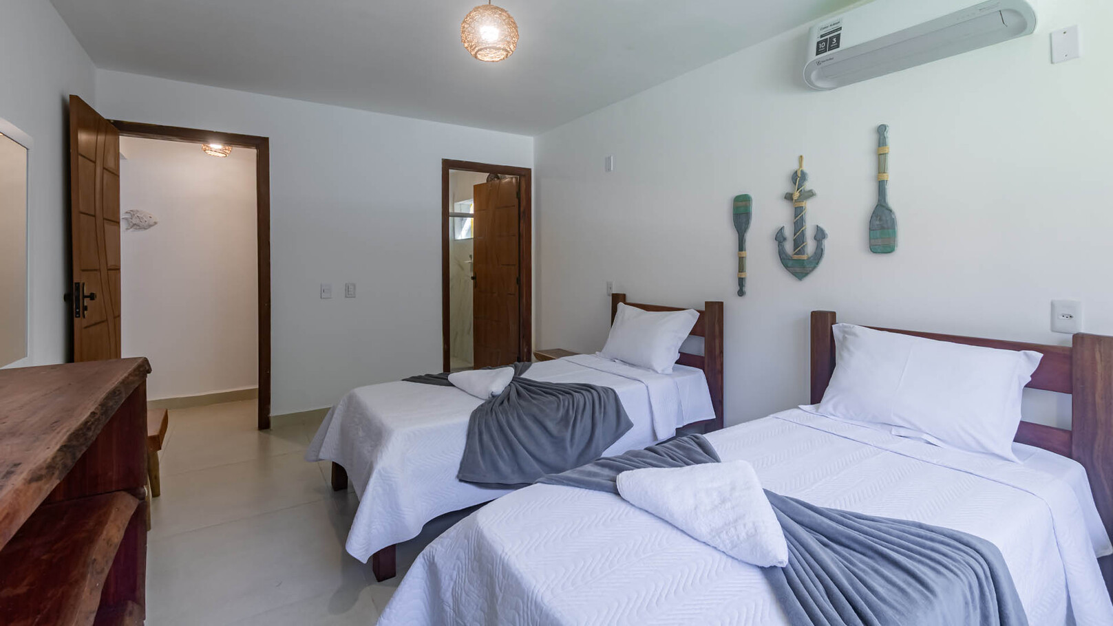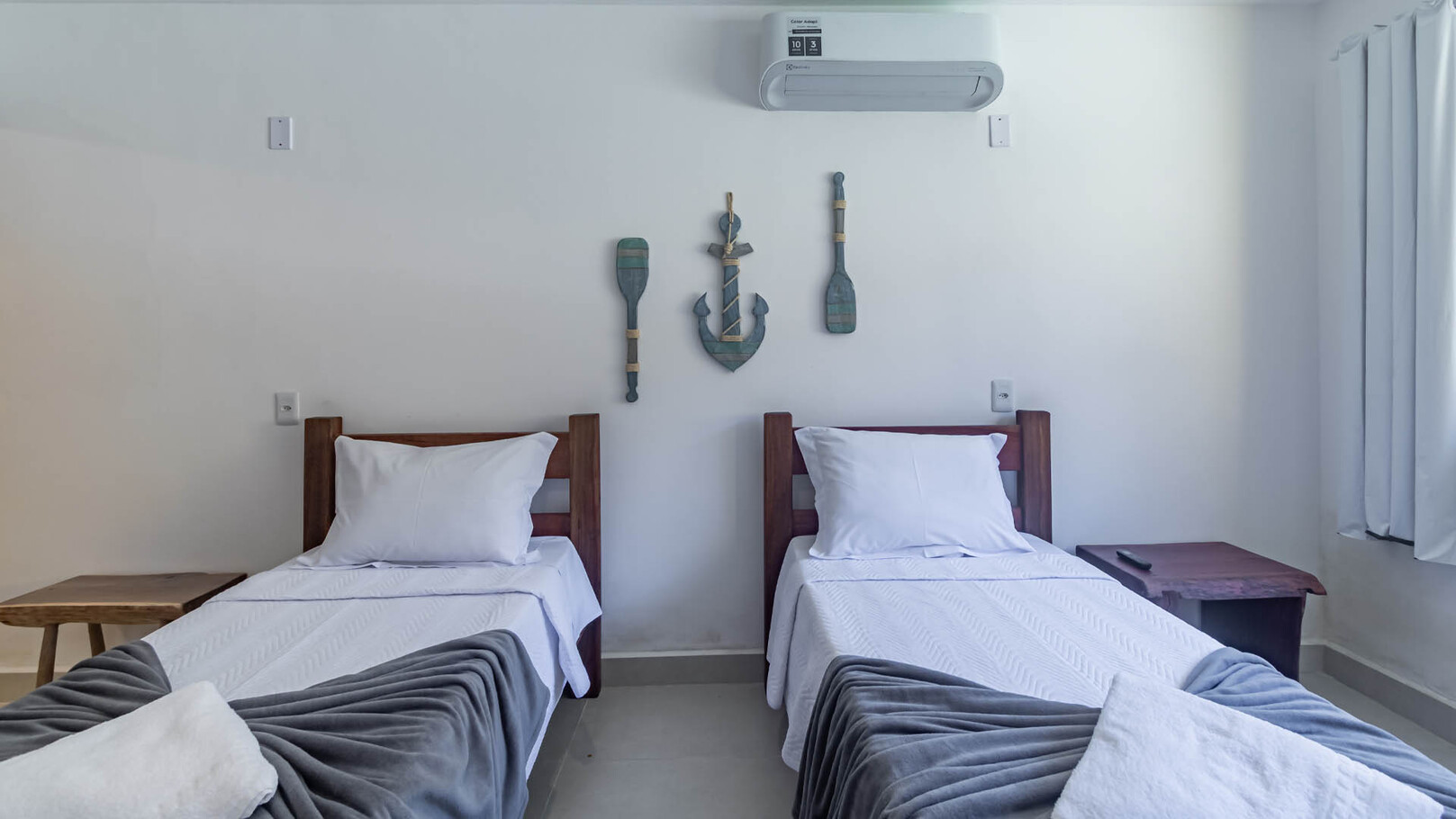 - Quarto 4 (Suíte): 2 camas de solteiro, ar-condicionado, armário, edredom/cobertor