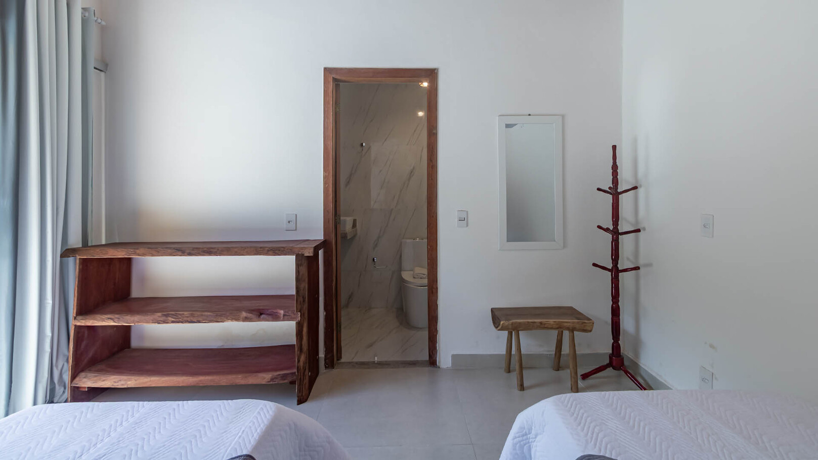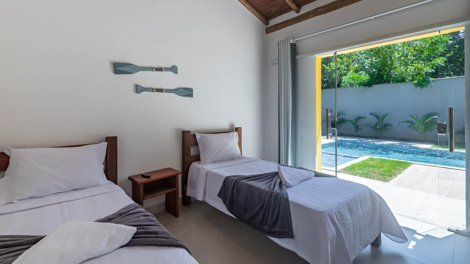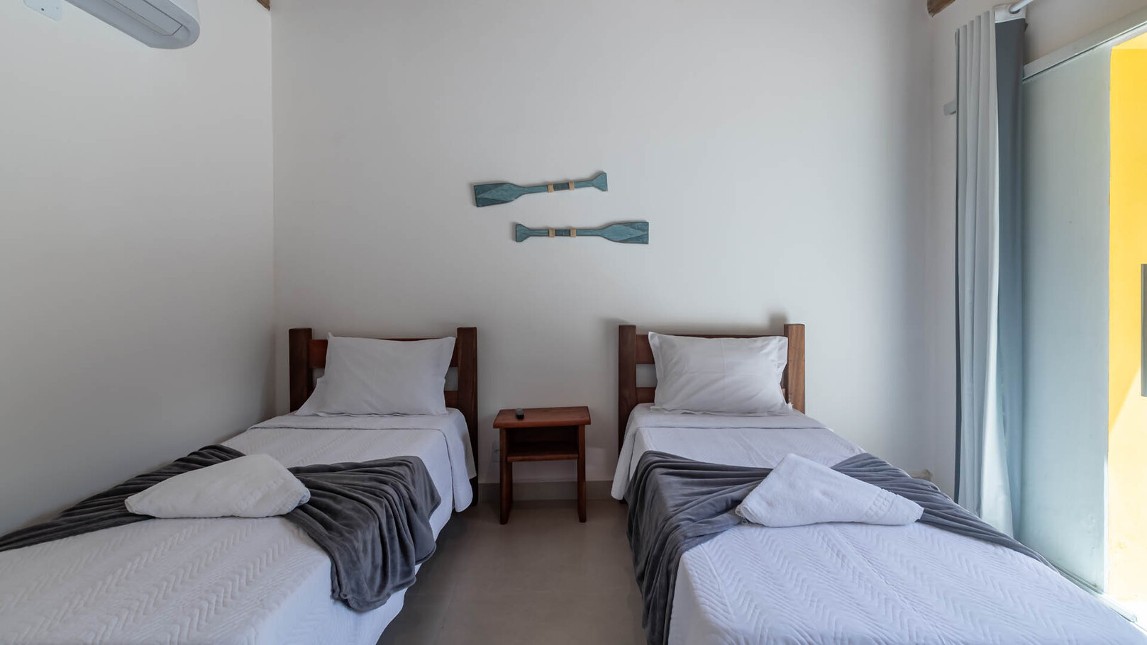 - Quarto 4 (Suíte): 2 camas de solteiro, ar-condicionado, armário, edredom/cobertor