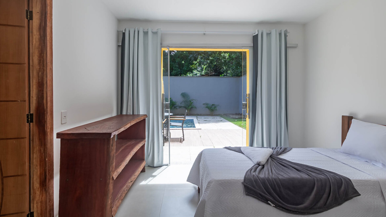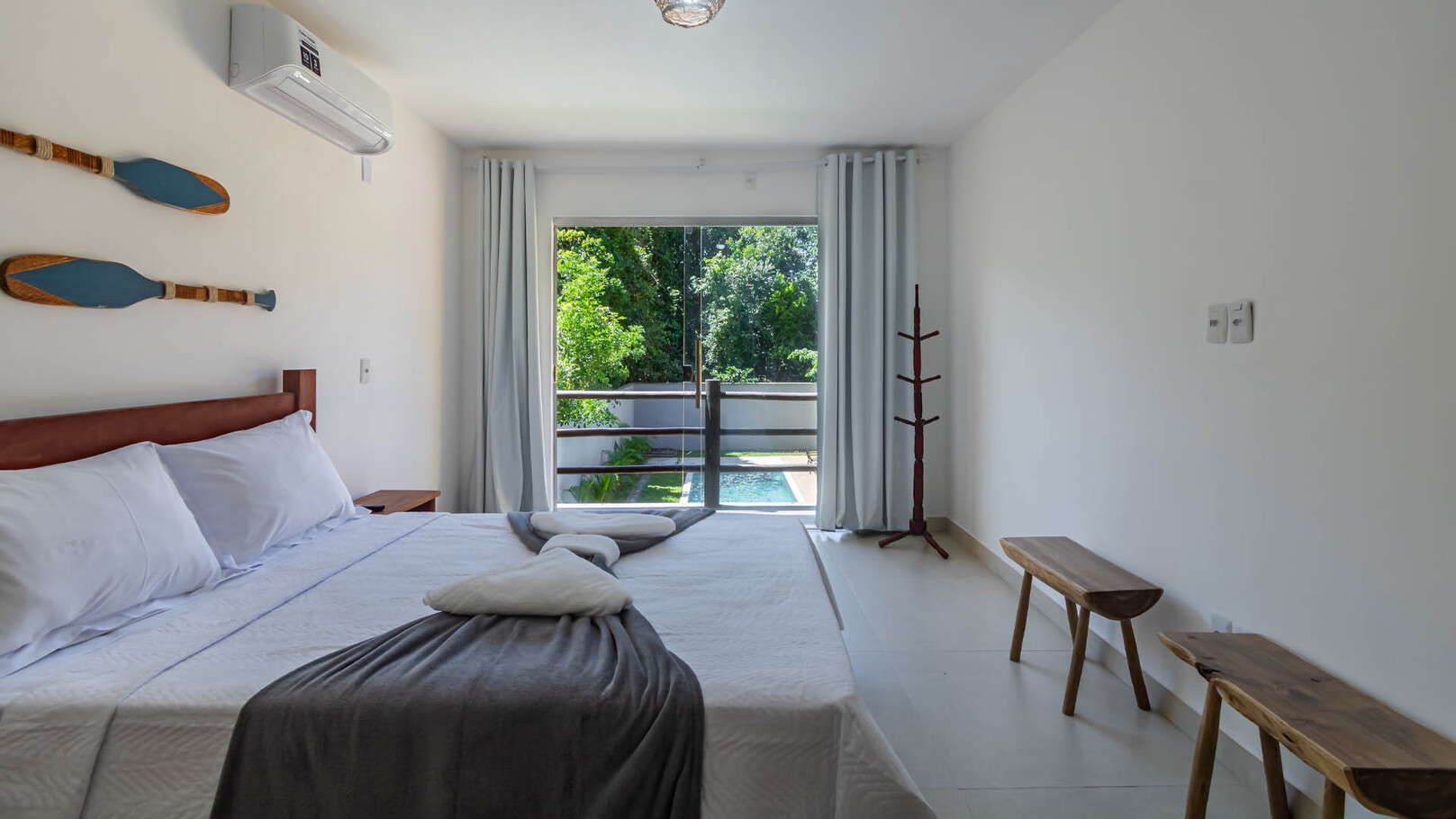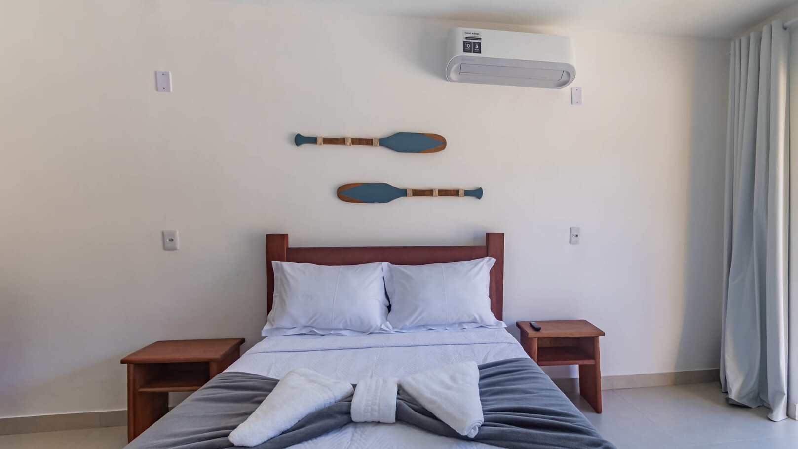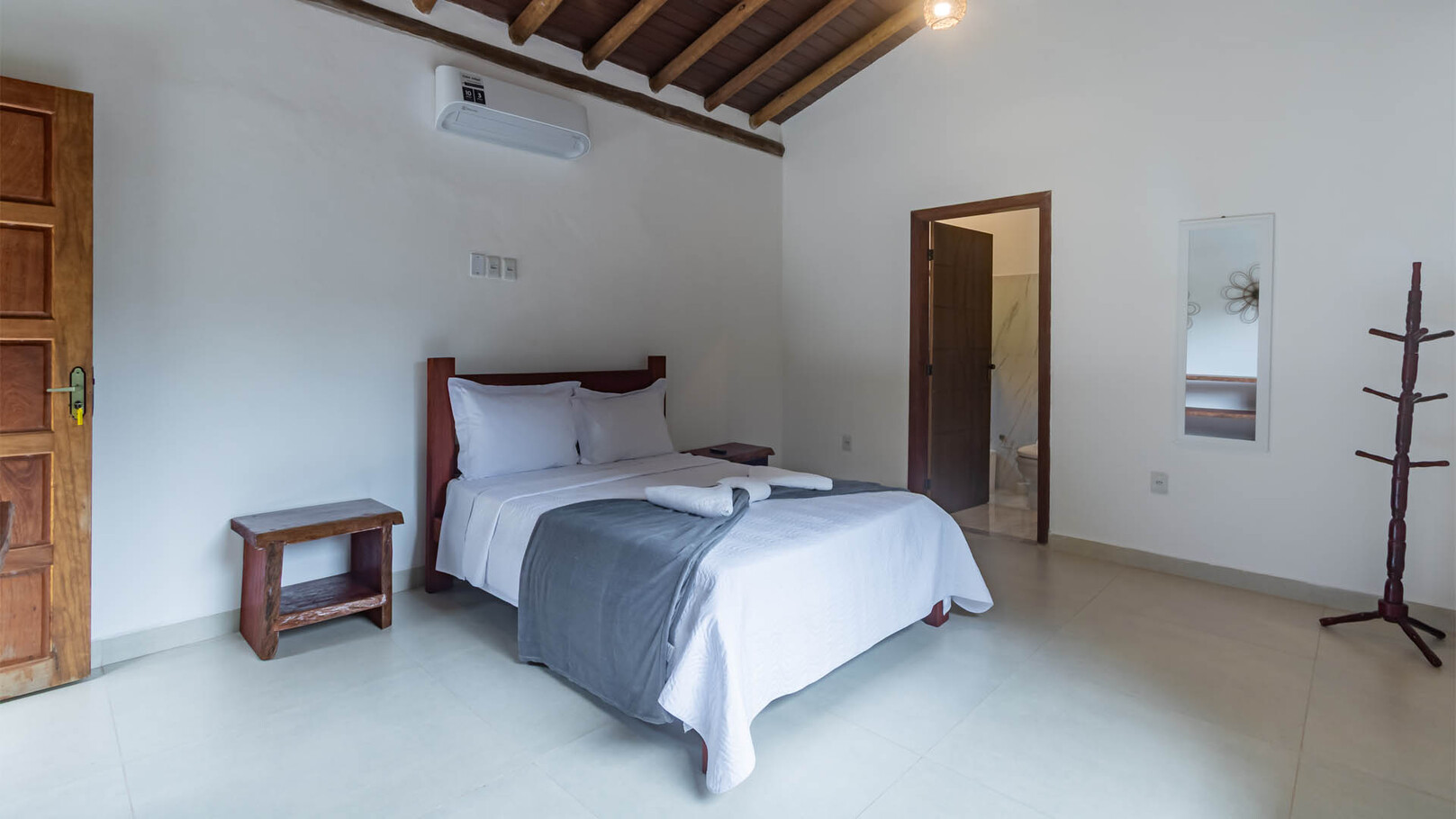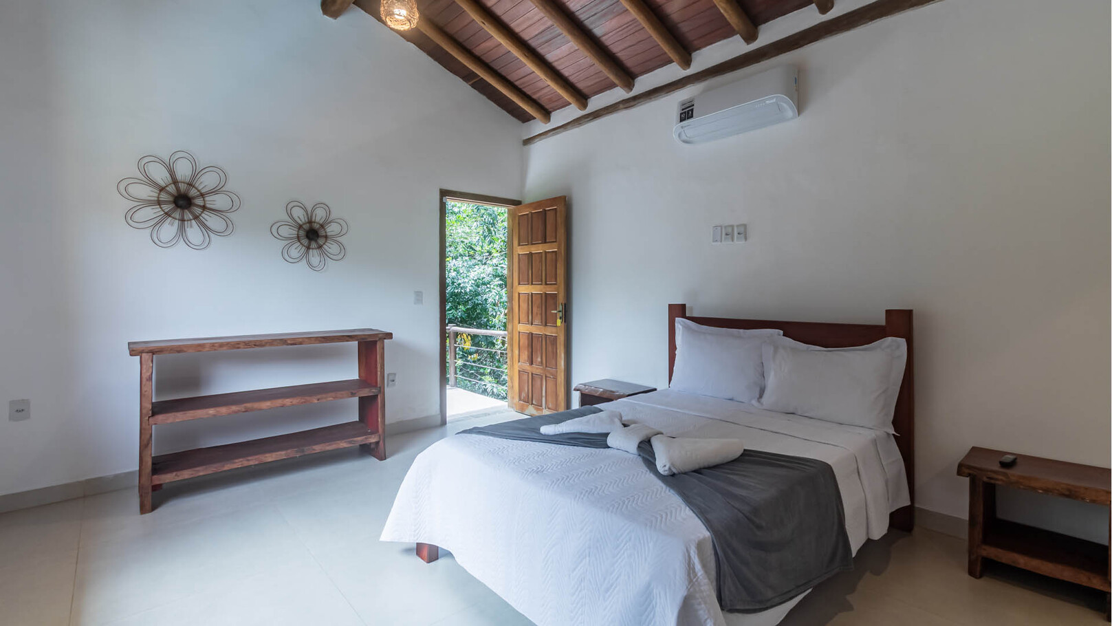 - Quarto 3 (Suíte): Cama de casal, ar-condicionado, armário, edredom/cobertor
