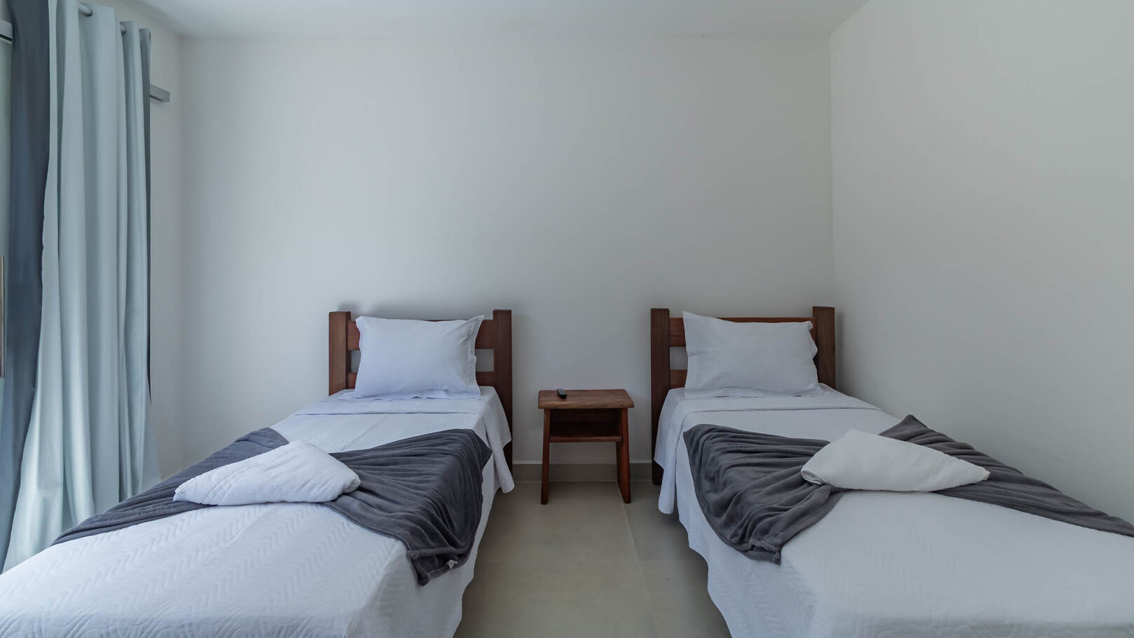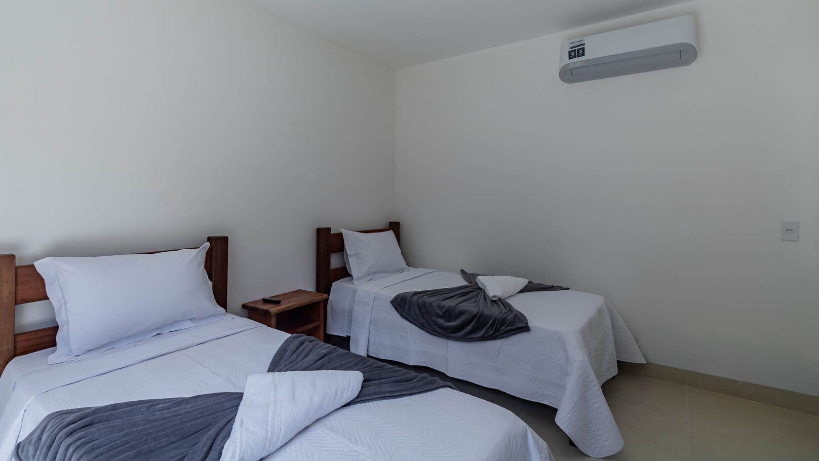 - Quarto 1 (Suíte): 2 camas de solteiro, ar-condicionado, armário, edredom/cobertor