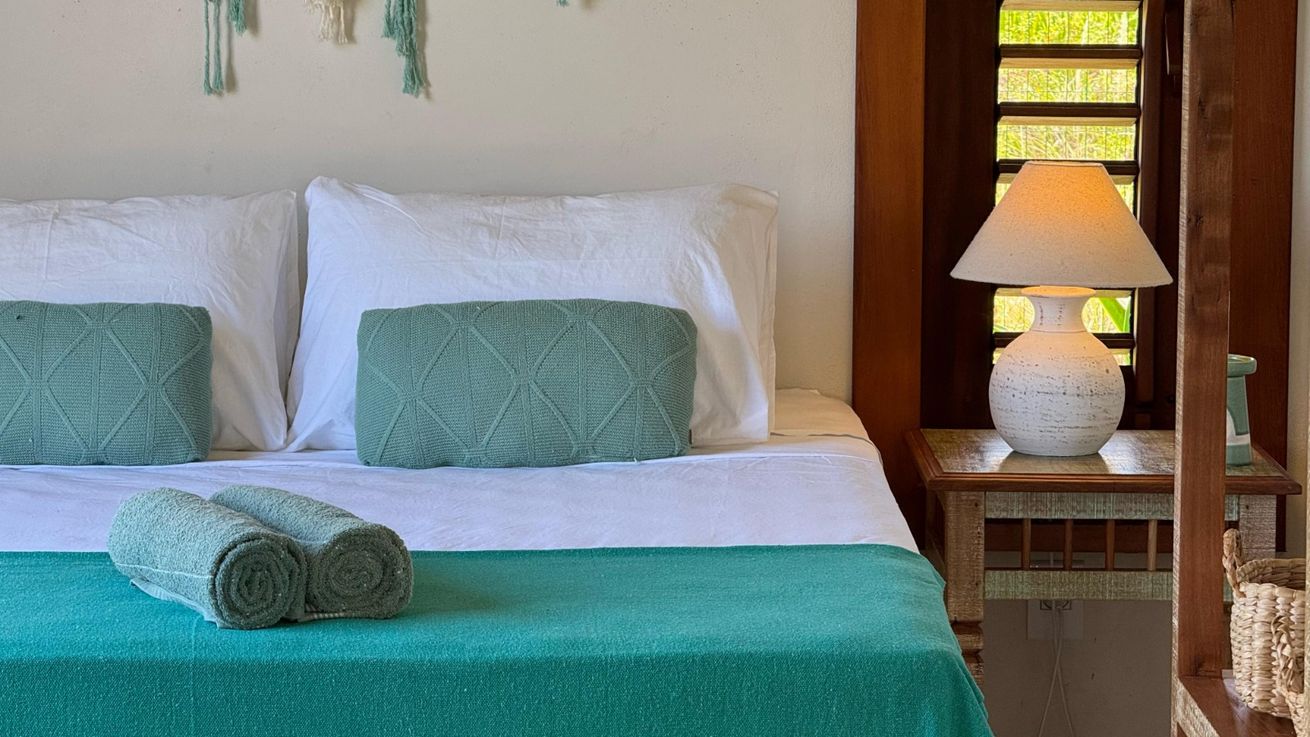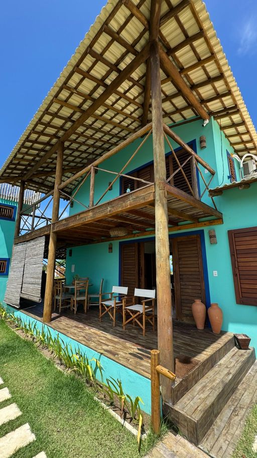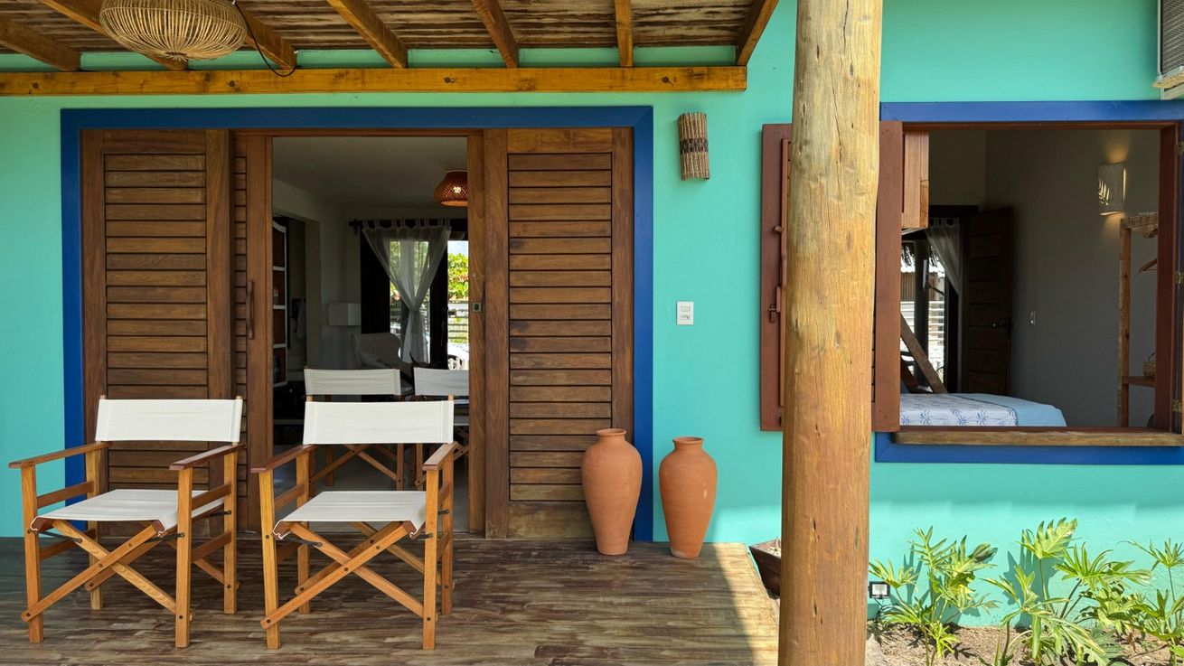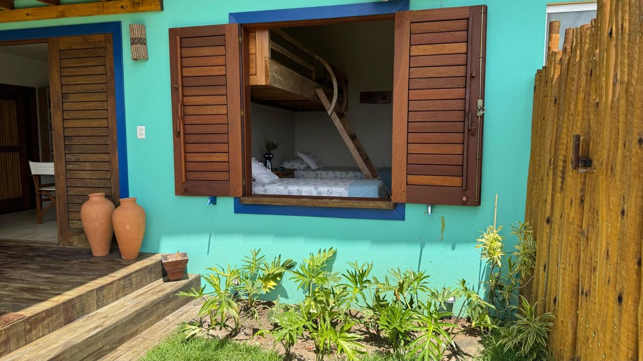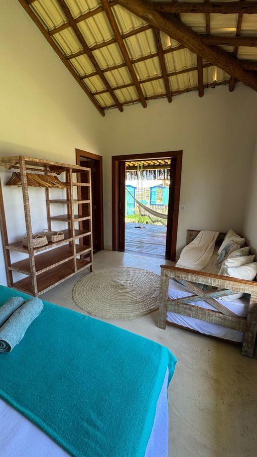 - Quarto 1(Suíte): Cama queen size, ar-condicionado, ventilador de teto, armário, escrivaninha, mosquiteiro, varanda frontal com vista para o mar e varanda aos fundos com vista para o Monte Pascoal, ambas com rede e mobiliário externo