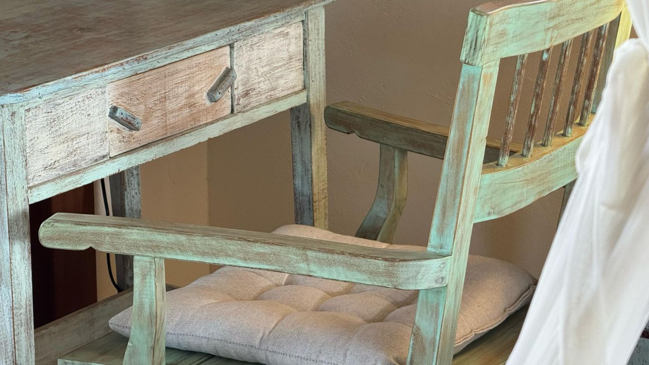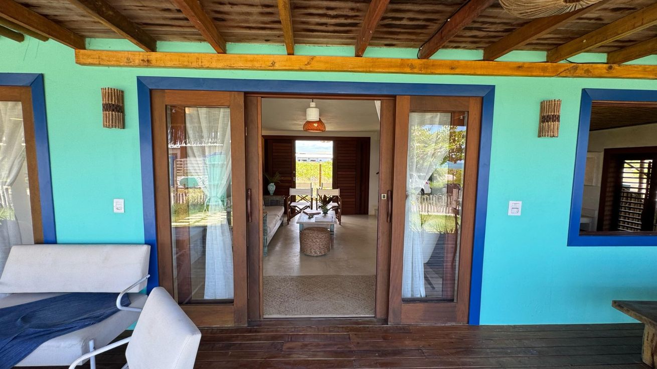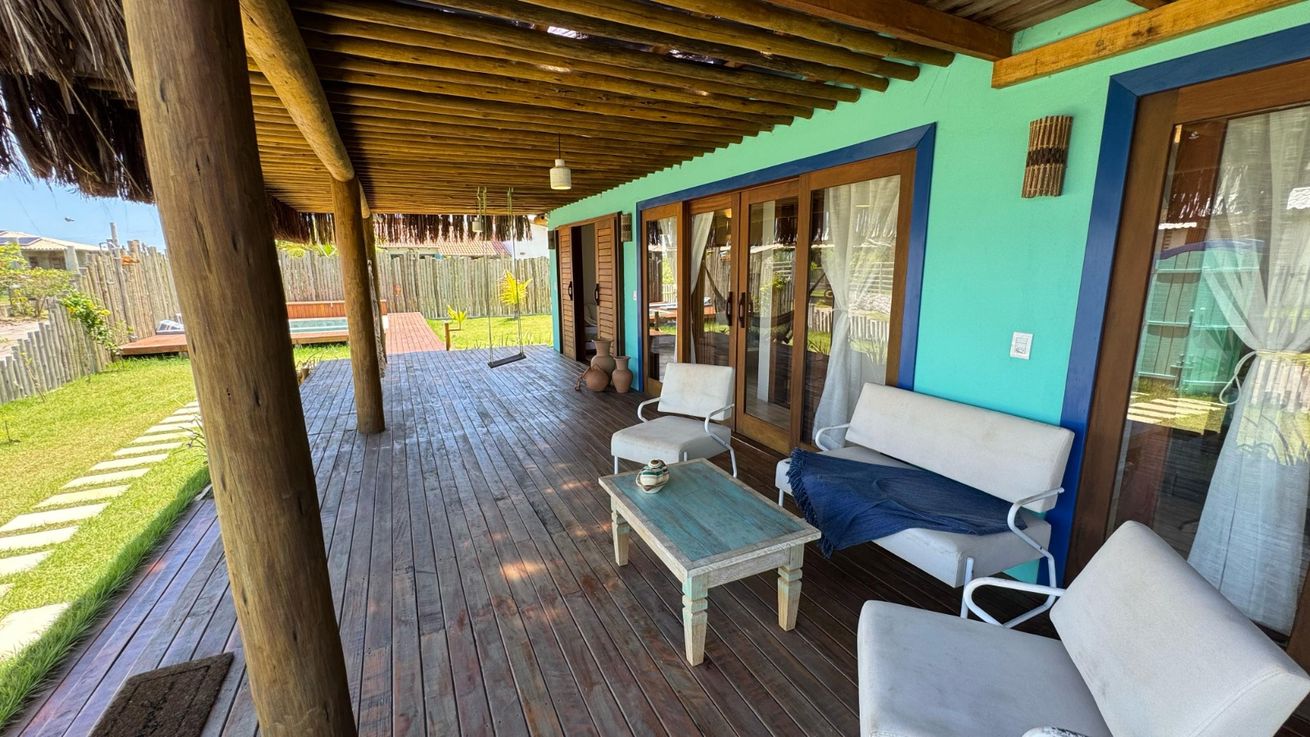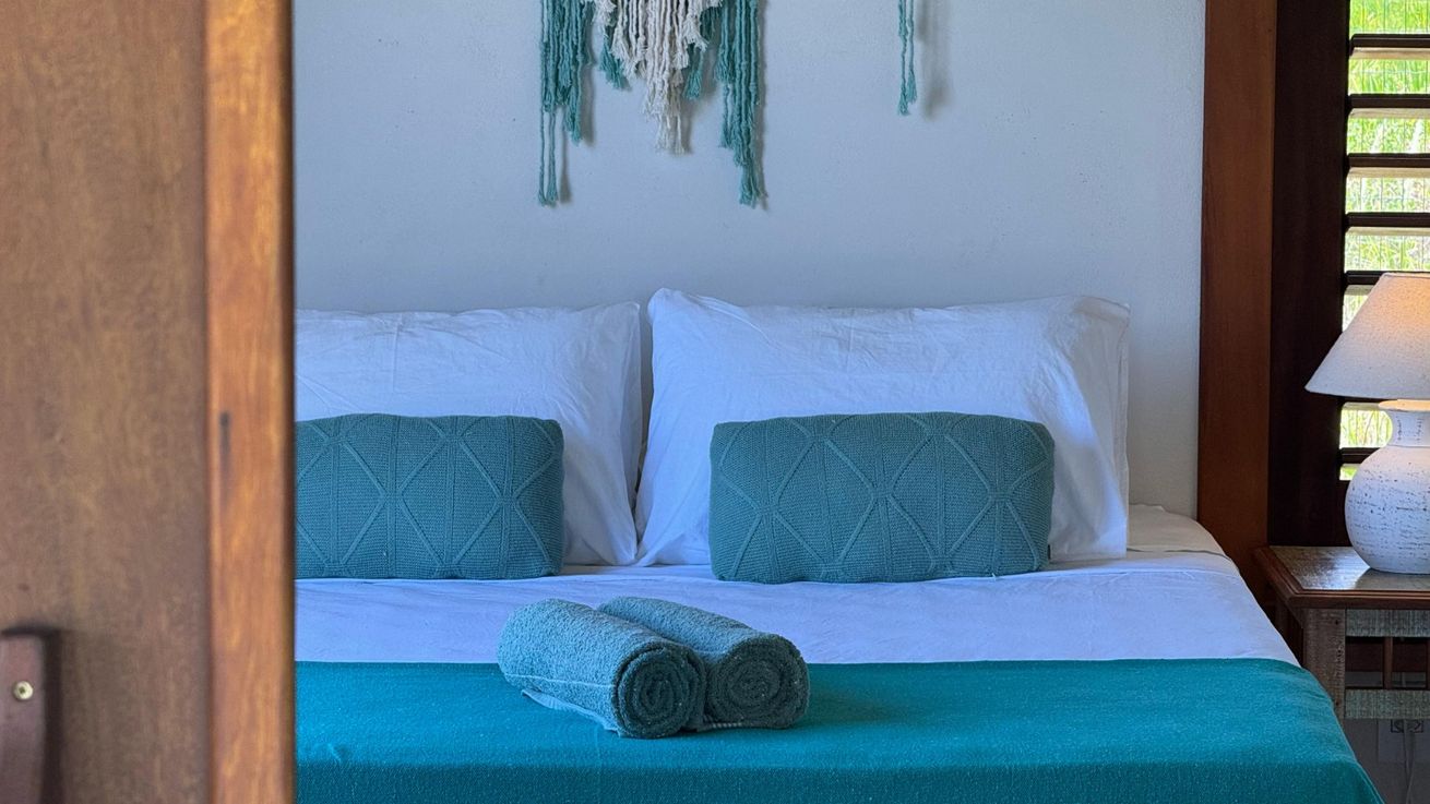 - Quarto 1(Suíte): Cama queen size, ar-condicionado, ventilador de teto, armário, escrivaninha, mosquiteiro, varanda frontal com vista para o mar e varanda aos fundos com vista para o Monte Pascoal, ambas com rede e mobiliário externo