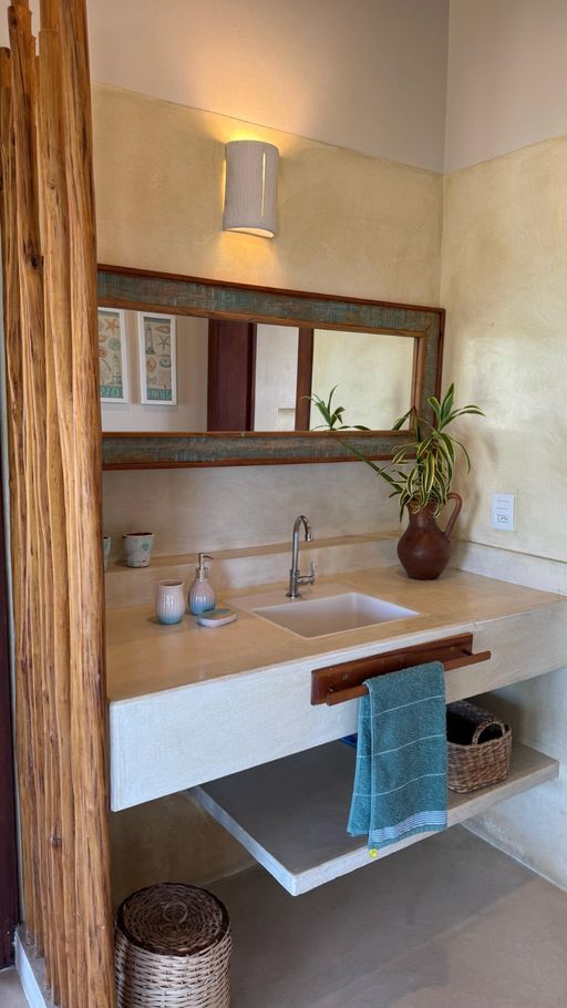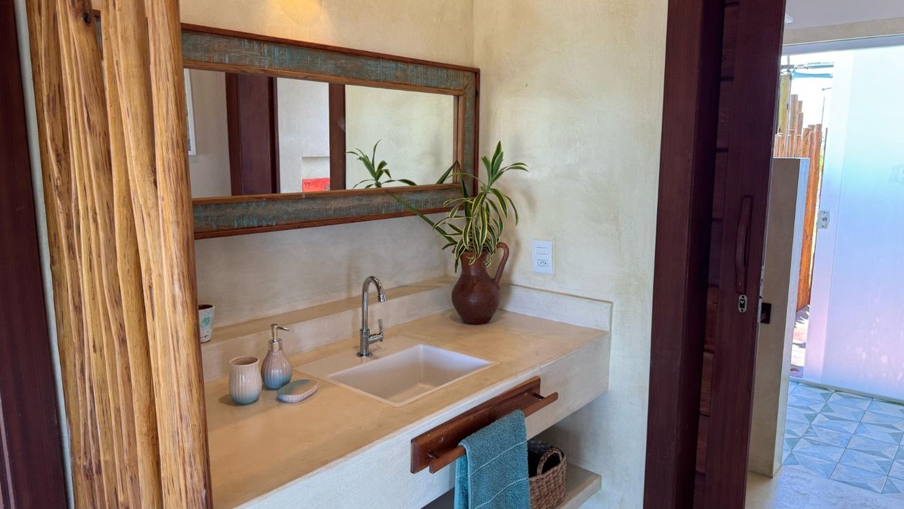 -Banheiros: 2 banheiros com chuveiro elétrico. A suíte conta com banheira de pedra natural, duas cubas, bancada ampla, closet e vista para o mar. O banheiro social possui lavabo independente e acesso a um deck com chuveiro externo para banho ao ar livre