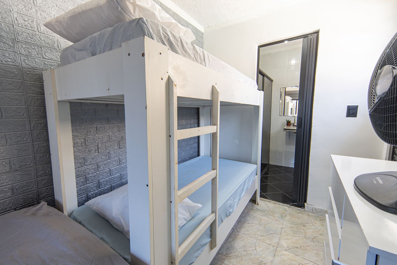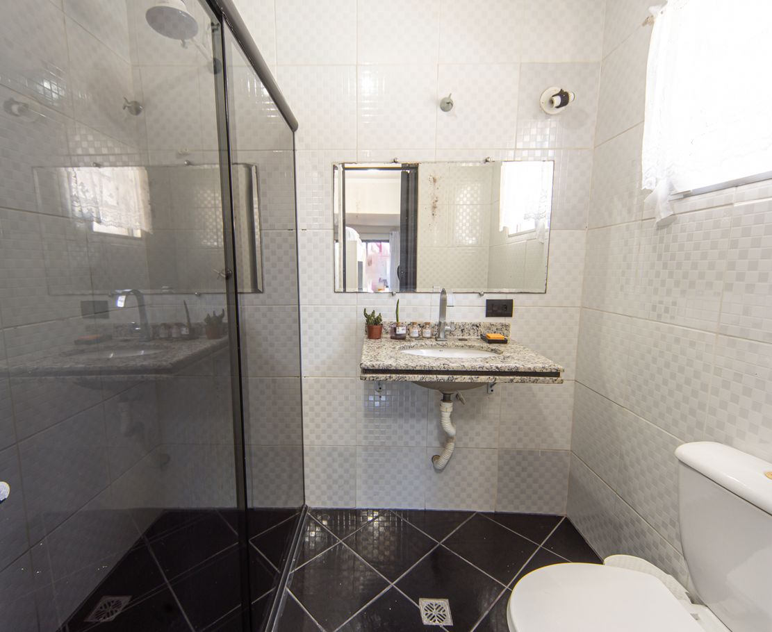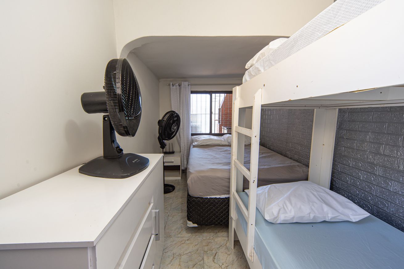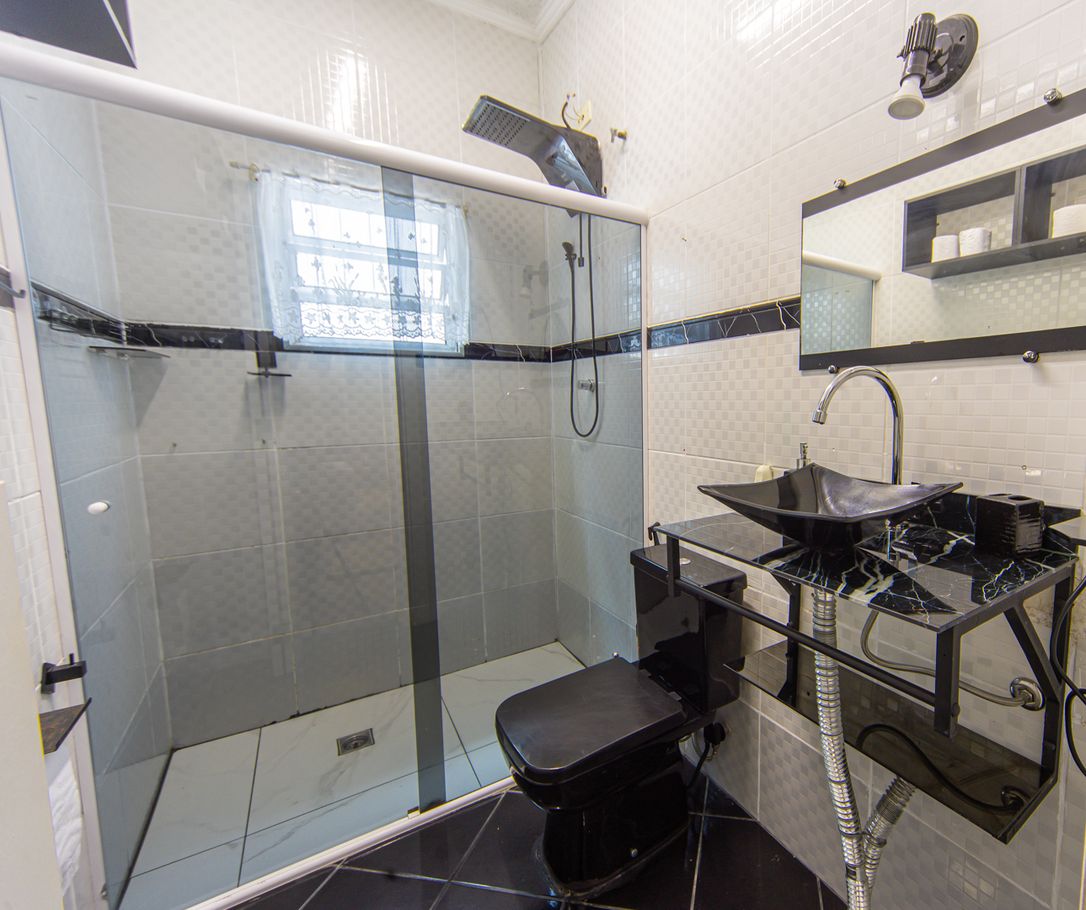 - Suíte 1: cama de casal, 1 beliche, 2 ventiladores portáteis e banheiro privativo com chuveiro elétrico, box e secador de cabelo