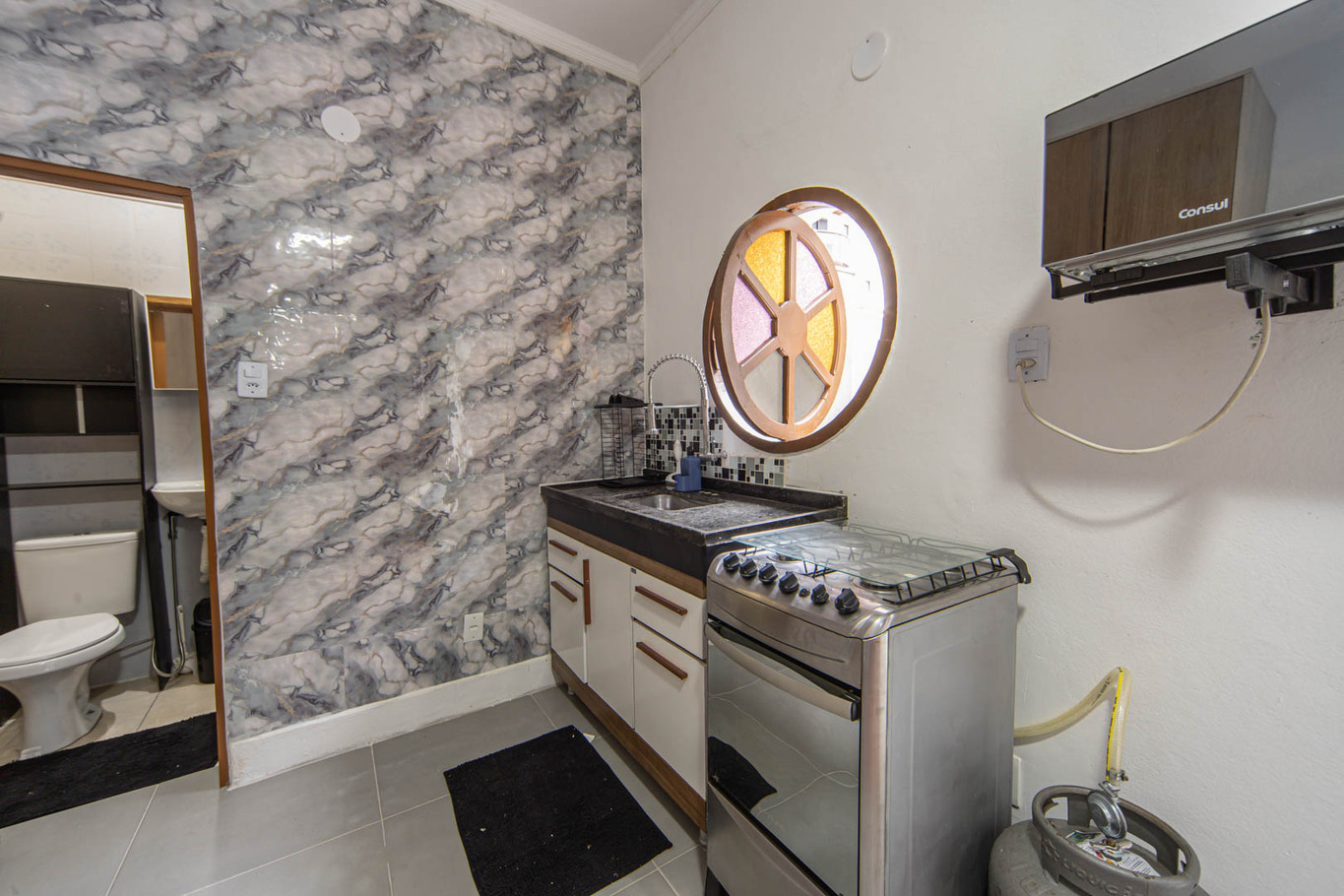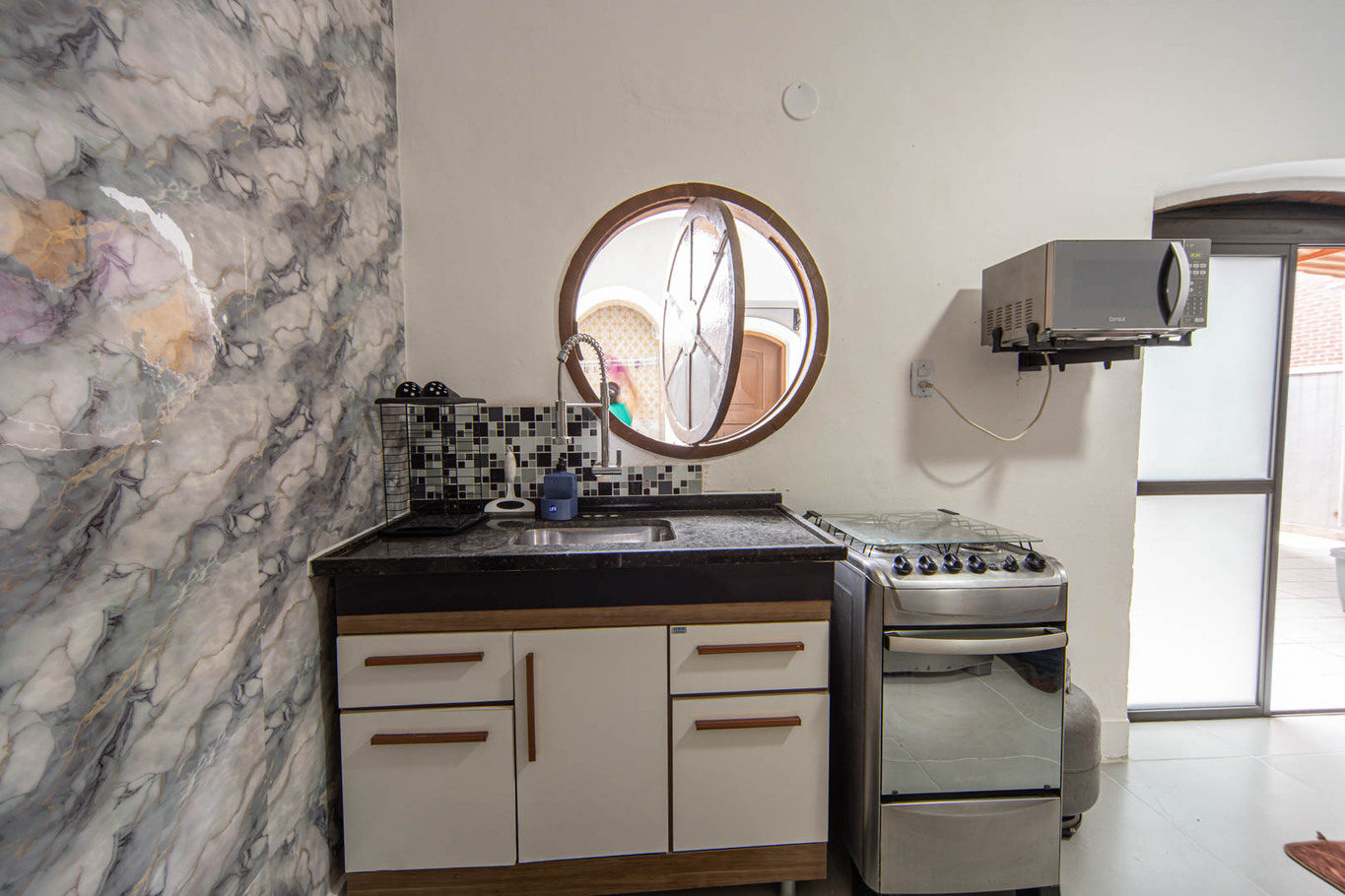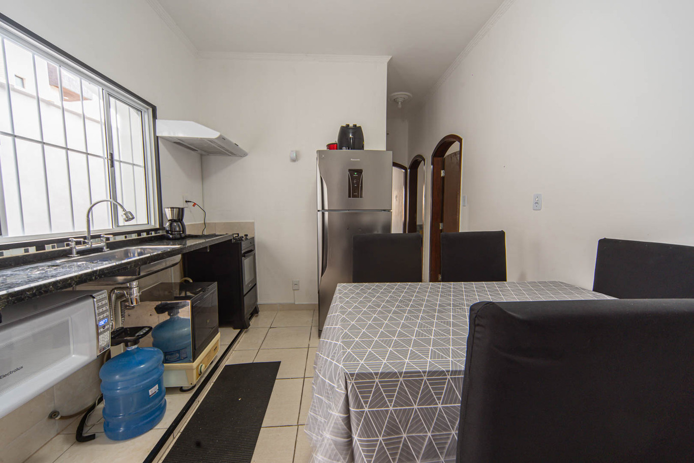 - Cozinha equipada com fogão, forno, micro-ondas, geladeira, freezer, liquidificador, purificador de água, mesa com 6 cadeiras e utensílios diversos(exceto óleo e sal)